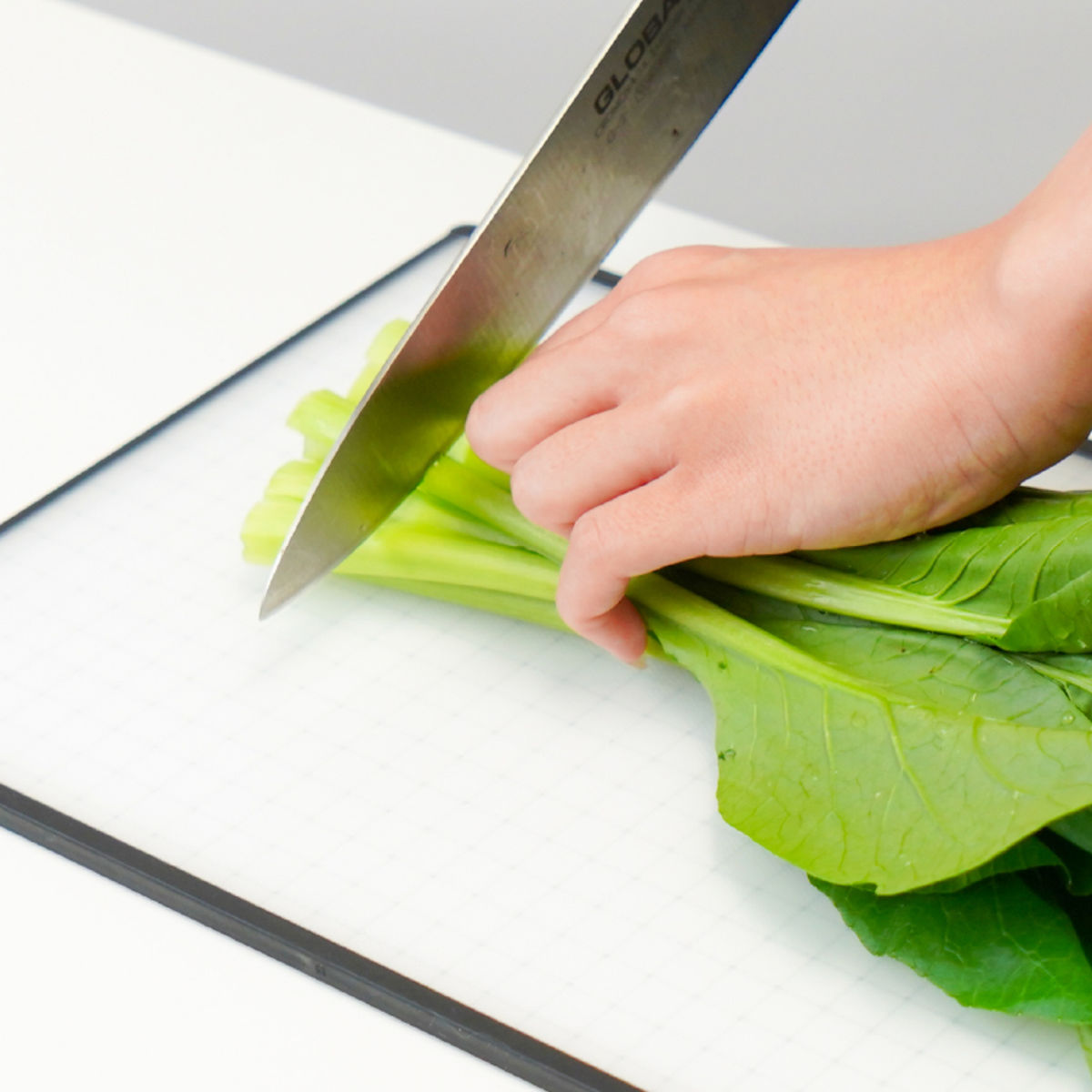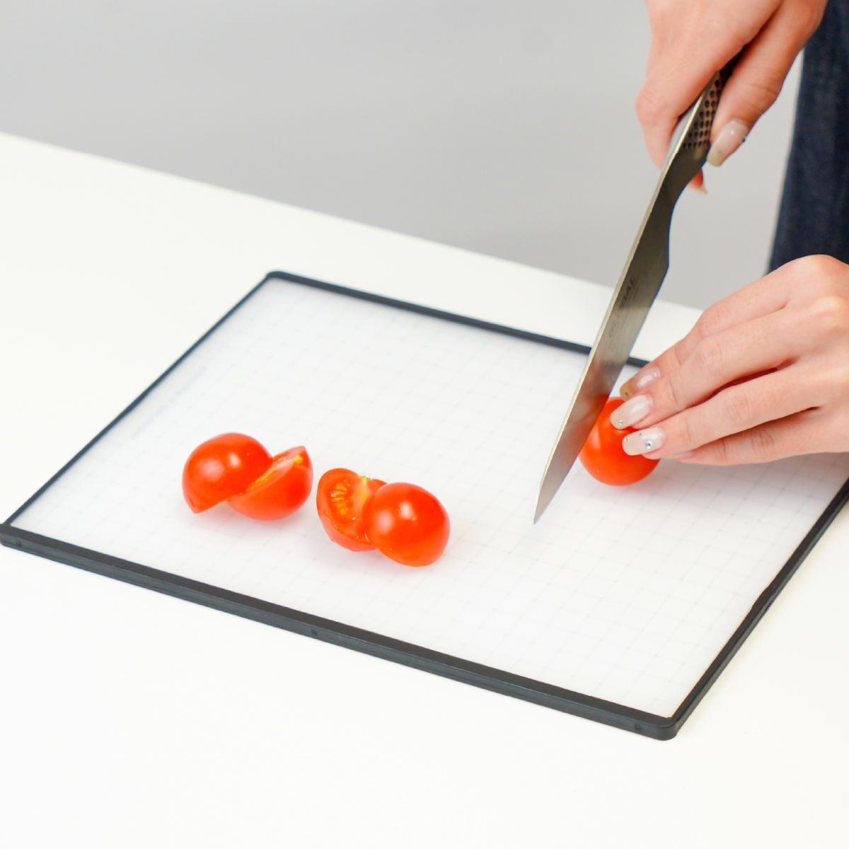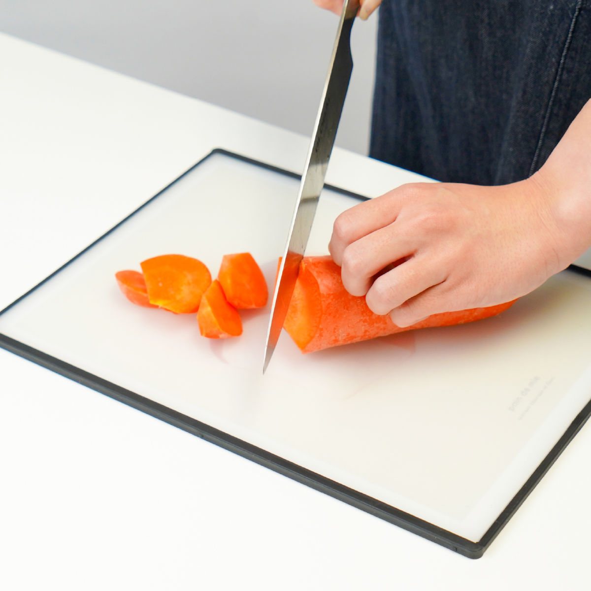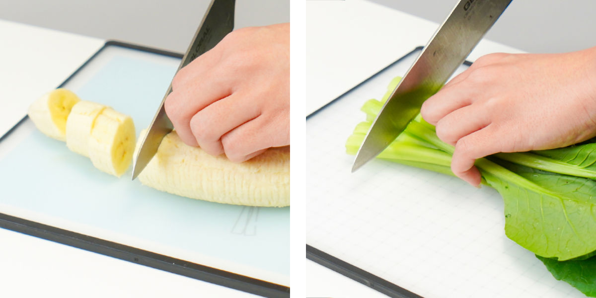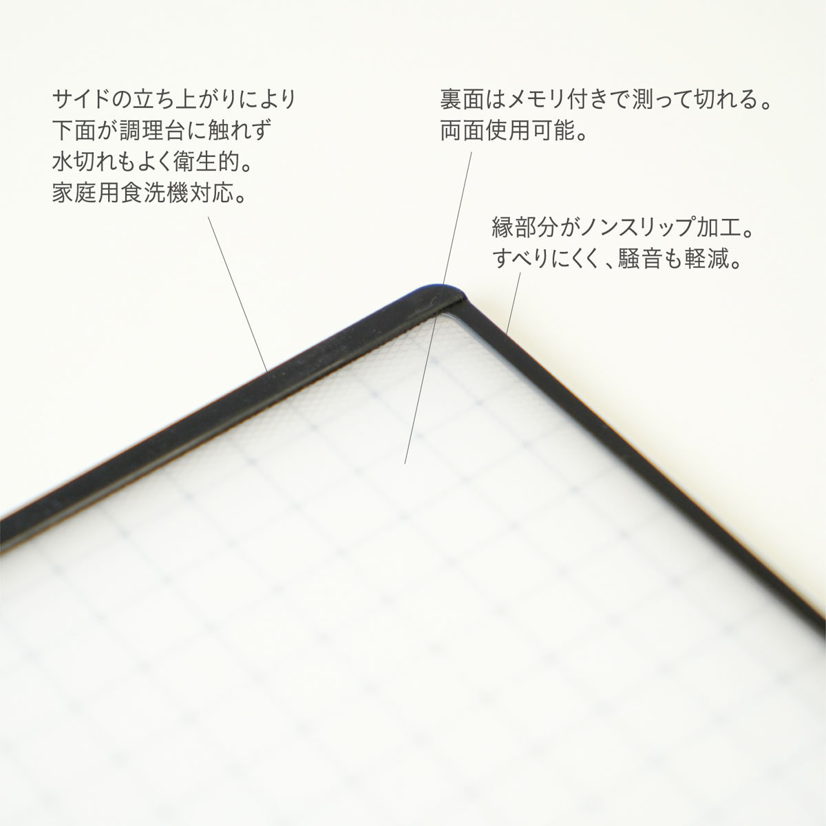 縁に施したノンスリップ加工により、調理中もズレにくく、安定してカットできます。包丁が当たる「トントン」「コンコン」という気になる音もやわらぎ、調理中も快適です。