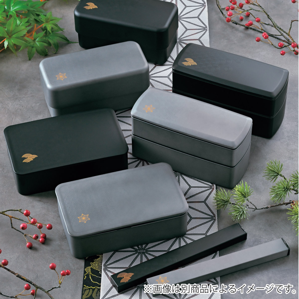 金色の麻の葉と青海波の模様が目を引く、美しい同モチーフのお弁当箱もご用意しています。