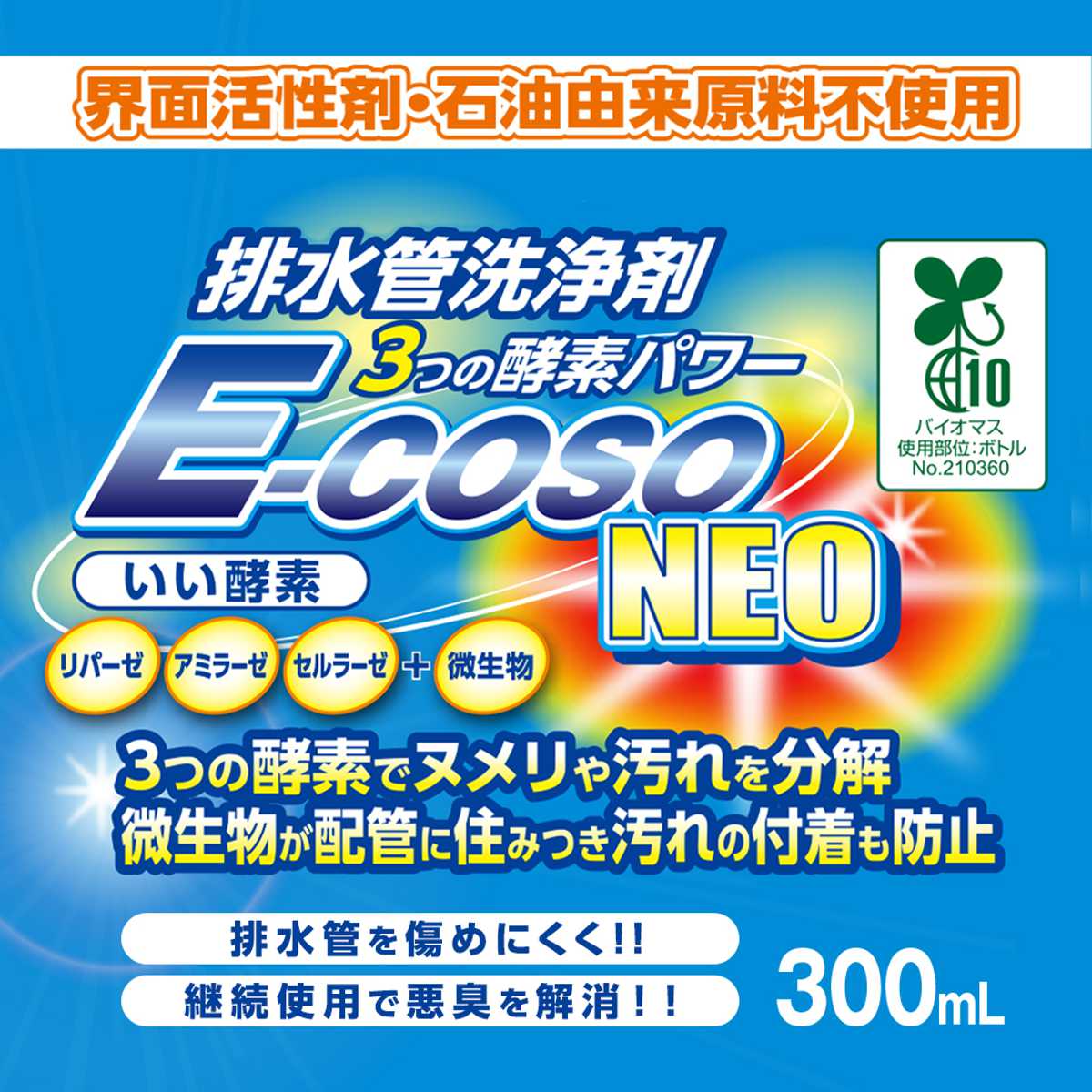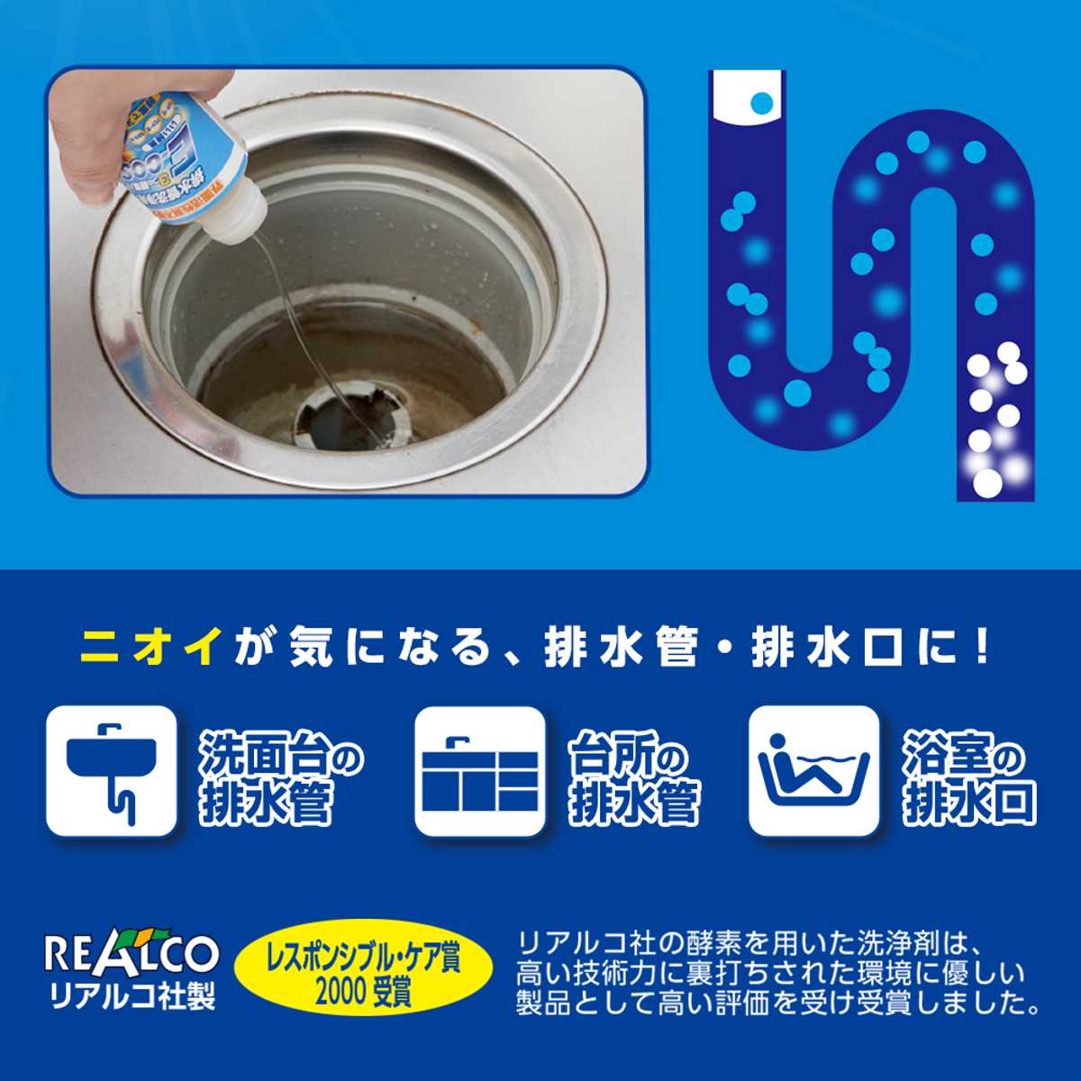3つの酵素と微生物の力で、排水管内のヌメリや汚れを分解する排水管洗浄剤です。界面活性剤・石油由来原料不使用のため、排水管を傷めにくく、安心してお使いいただけます。洗面台、台所、浴室の排水口に使用できます。