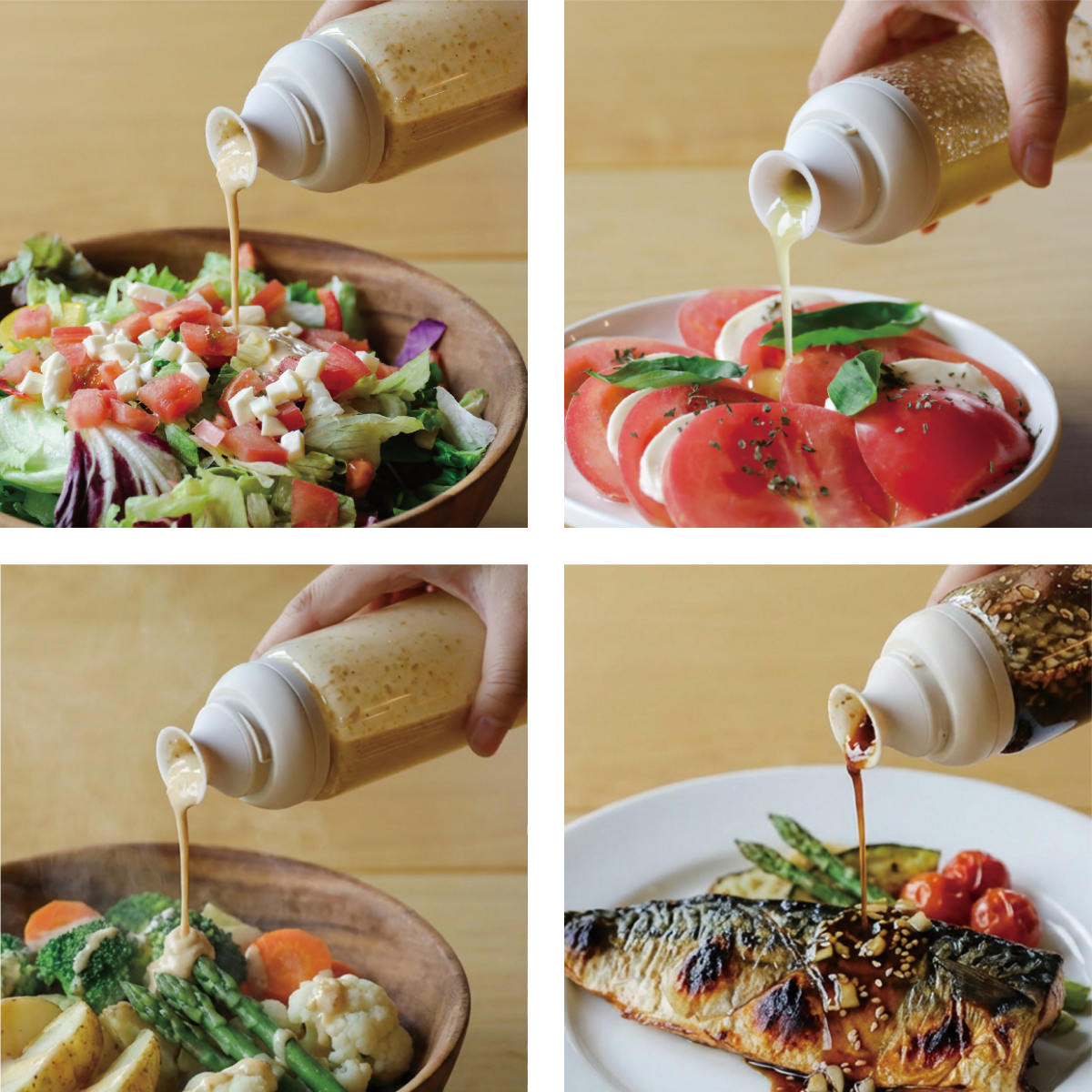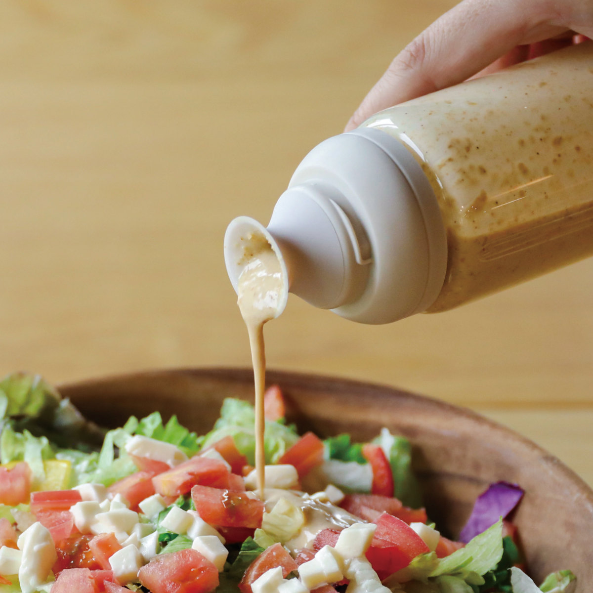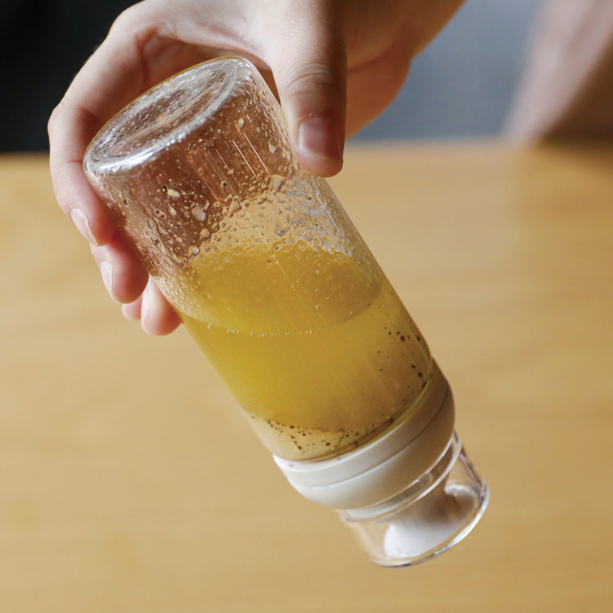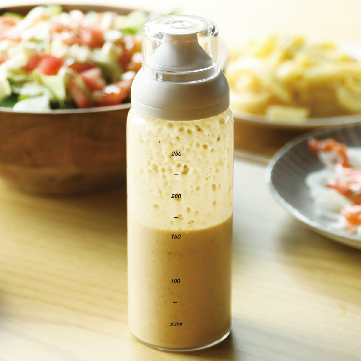 傾けても中身がこぼれにくい密閉構造のフタは、ドレッシングを作る際もこぼれにくく、片手でシャカシャカ振るだけの手軽さが、日常使いにぴったりです。また、作り置きドレッシングの鮮度を保ち、液漏れやニオイ漏れもなく、冷蔵庫内での保存も快適です。