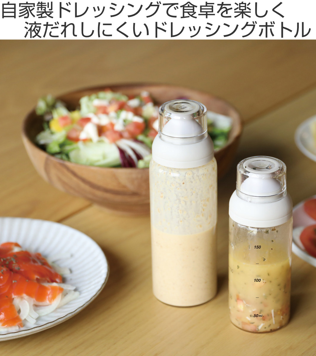 ドレッシング作りと保存に最適な、ガラス製ドレッシングボトルです。材料を入れて振るだけで、簡単に自家製ドレッシングが作れます。市販のドレッシングは添加物が気になったり、使い切れずに余してしまいがちですが、これなら好きな材料で必要分を作ることができ、安心&おいしいお食事を楽しめます。