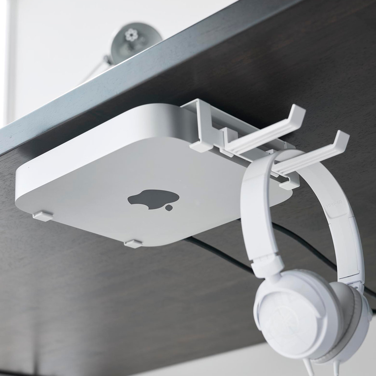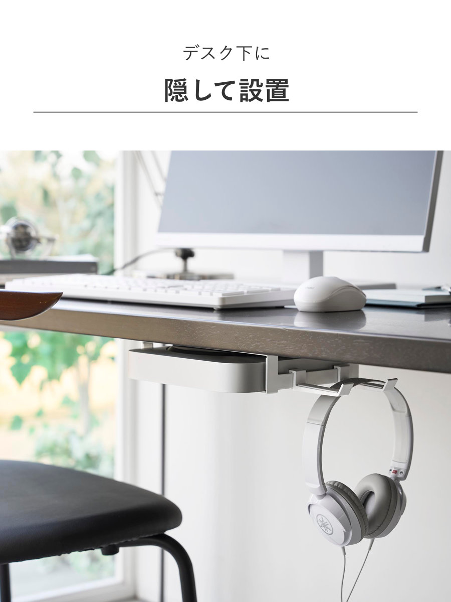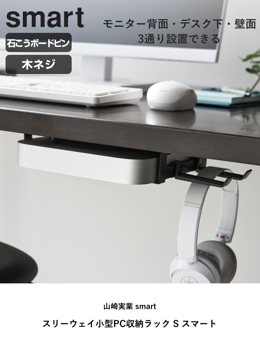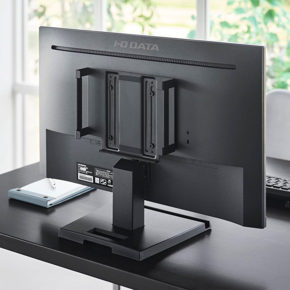 対応する小型PCを、モニター背面・デスク下・壁面の3通りで収納できるラックです。モニター背面やデスク下に設置して、デスク上を広く使うことができます。