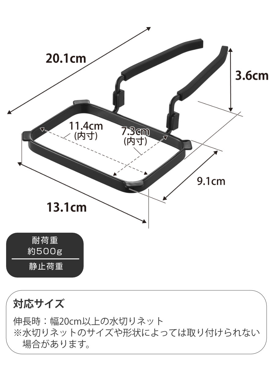 | 対応サイズ | 伸長時:幅20cm以上の水切りネット ※水切りネットのサイズや形状によっては取り付けられない場合があります。 |
