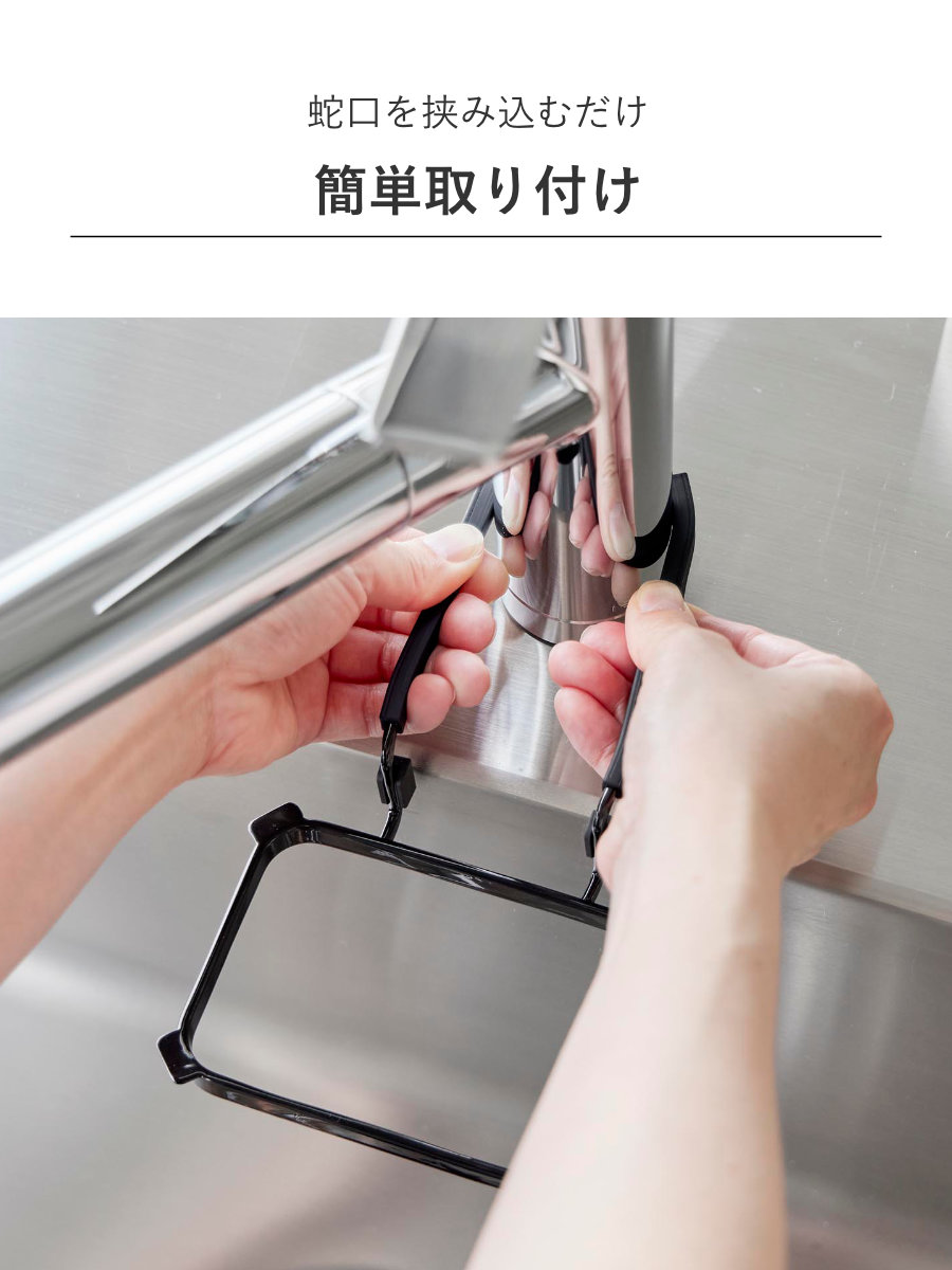 蛇口に挟み込むだけで簡単に取り付けできるスポンジホルダーです。スチールの取り付け部がしっかりホールドするので、ズレ落ちることなく快適に使用できます。