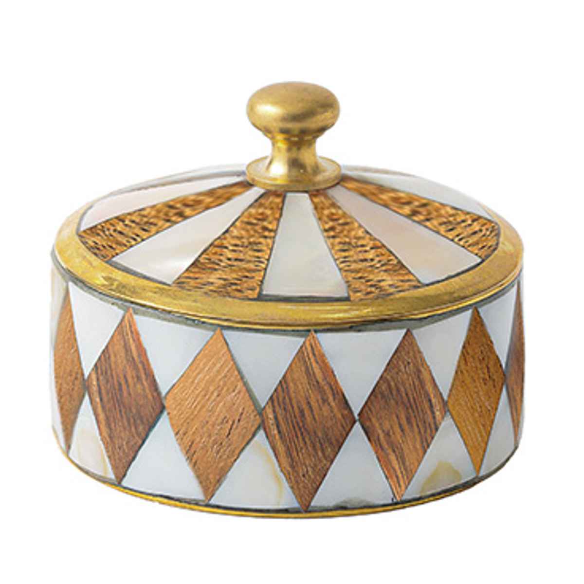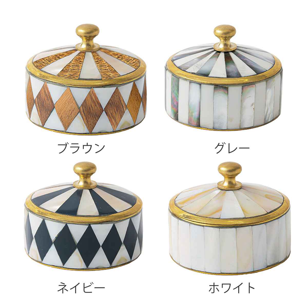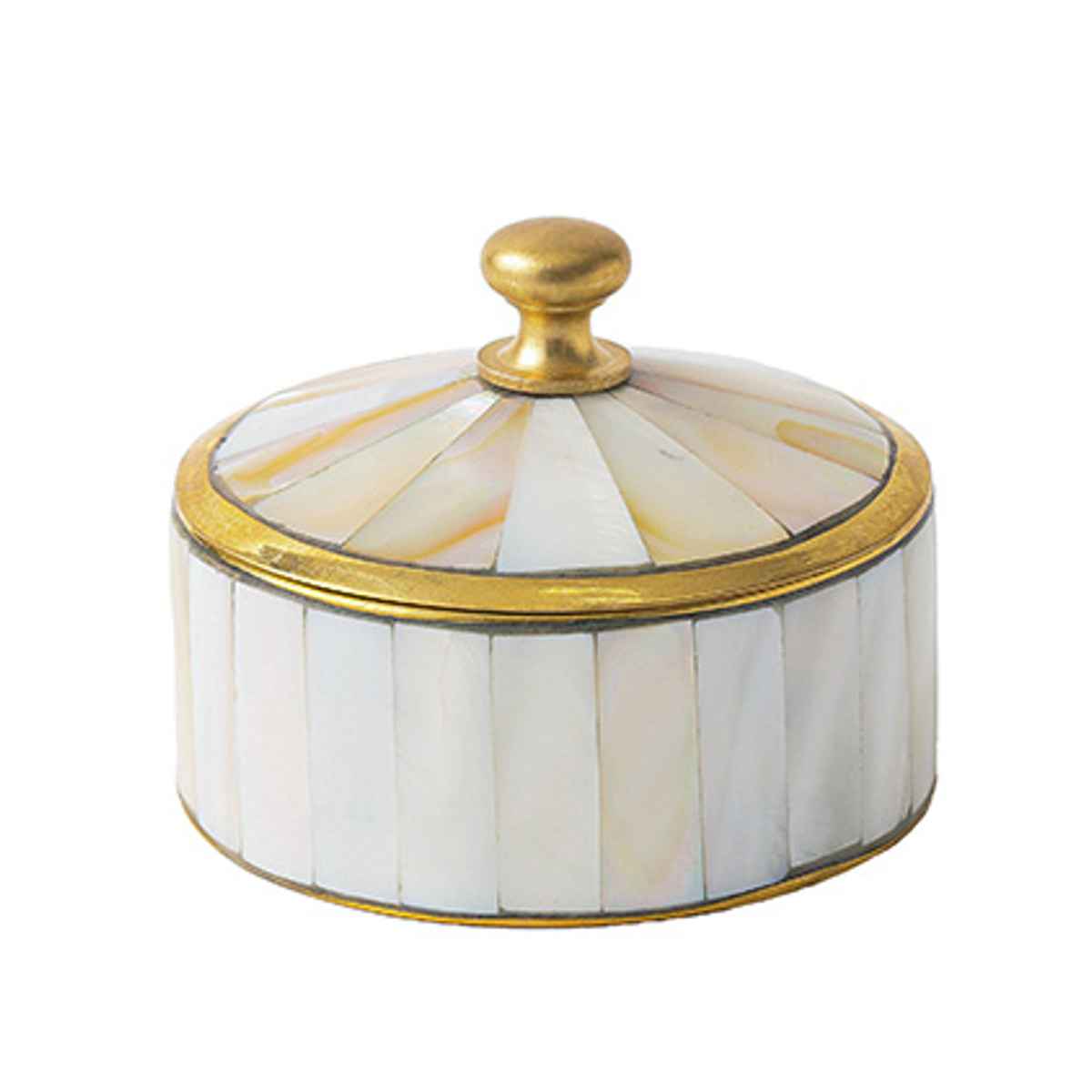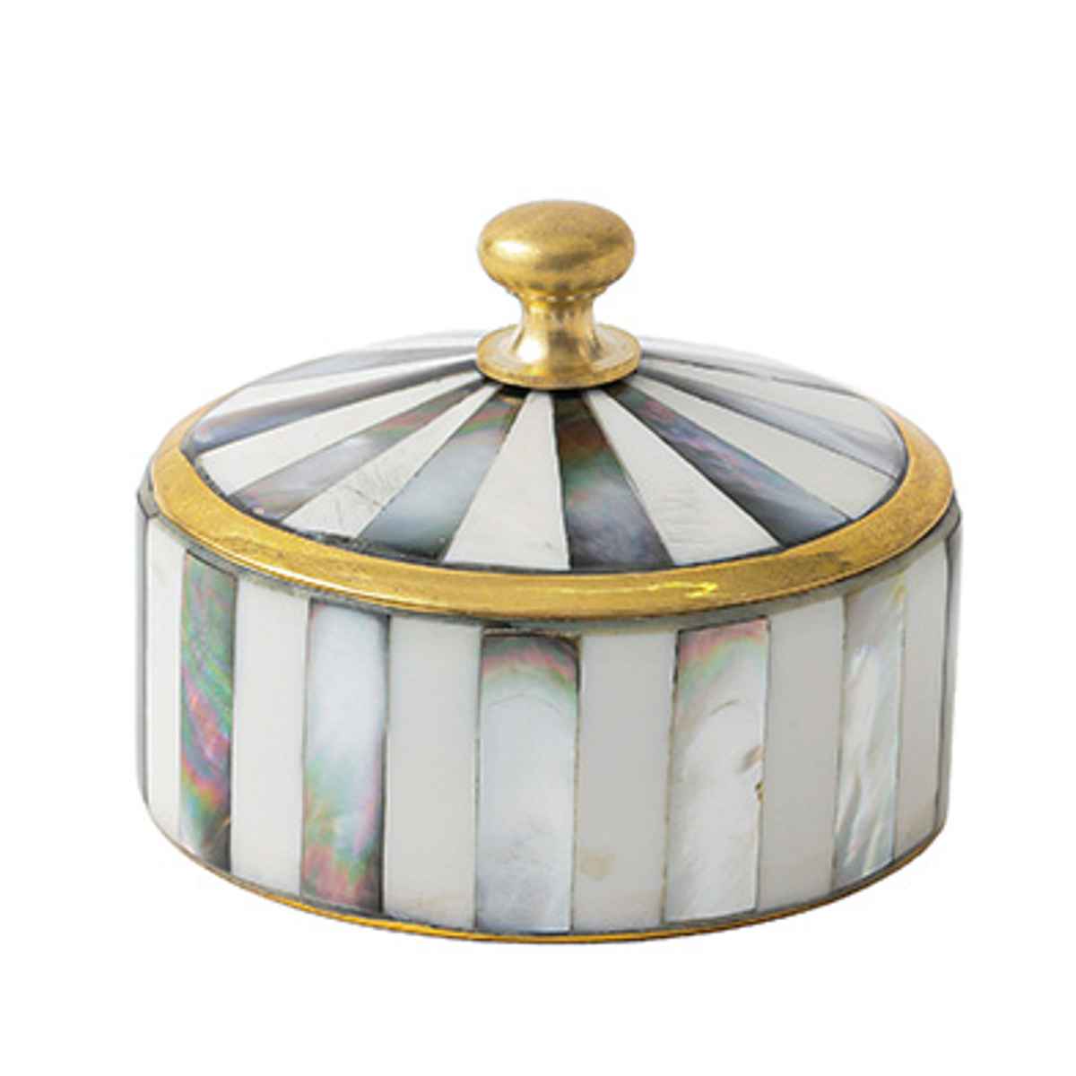 シェル(マザーオブパール)と真鍮を組み合わせたアンティーク調の小さなキャニスターです。丁寧に施されたモザイク状のシェル装飾が光の角度によってきらりと輝き、上品でクラシカルな雰囲気を演出します。