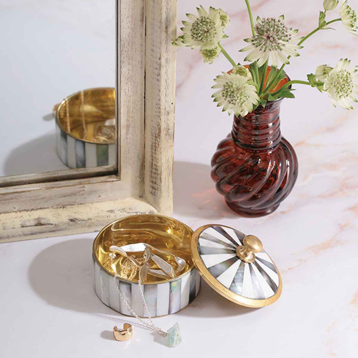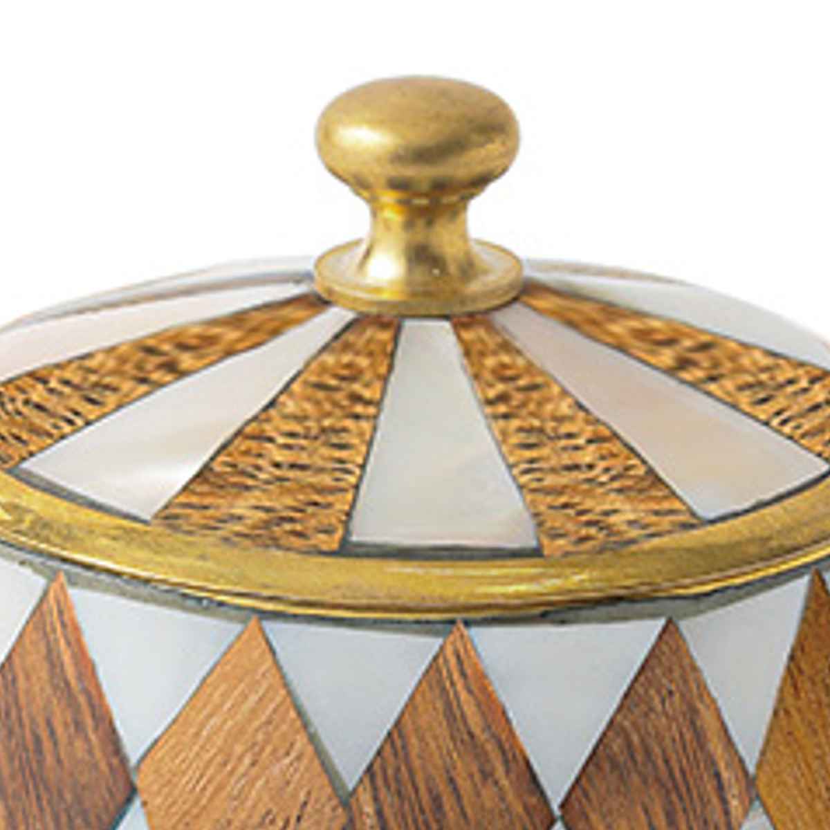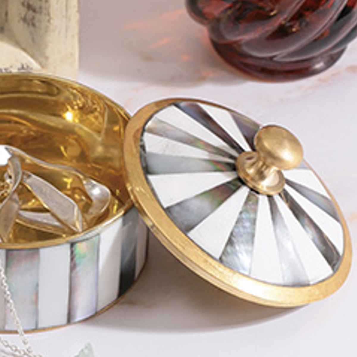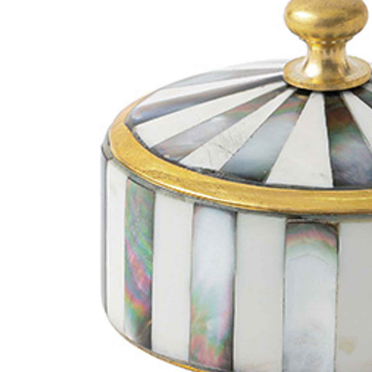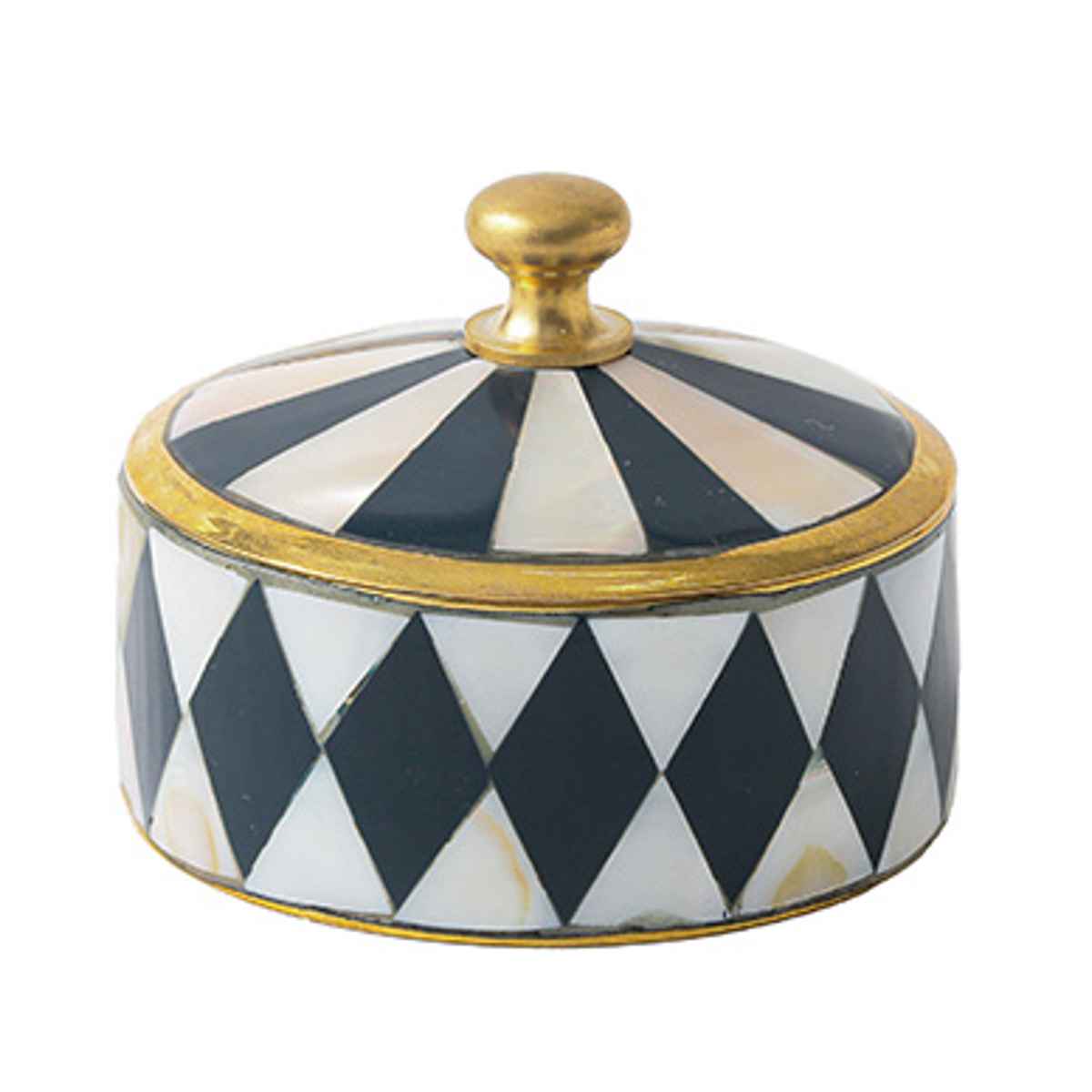 シェル(マザーオブパール)と真鍮を組み合わせたアンティーク調の小さなキャニスターです。丁寧に施されたモザイク状のシェル装飾が光の角度によってきらりと輝き、上品でクラシカルな雰囲気を演出します。