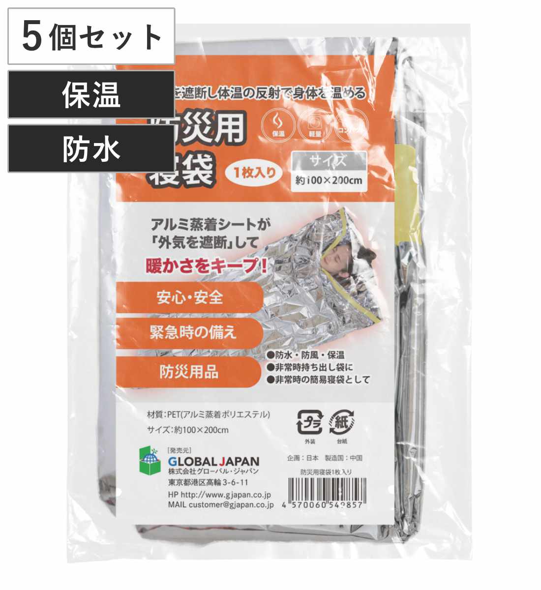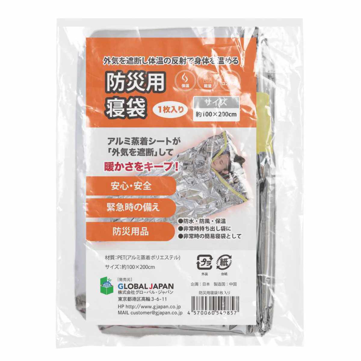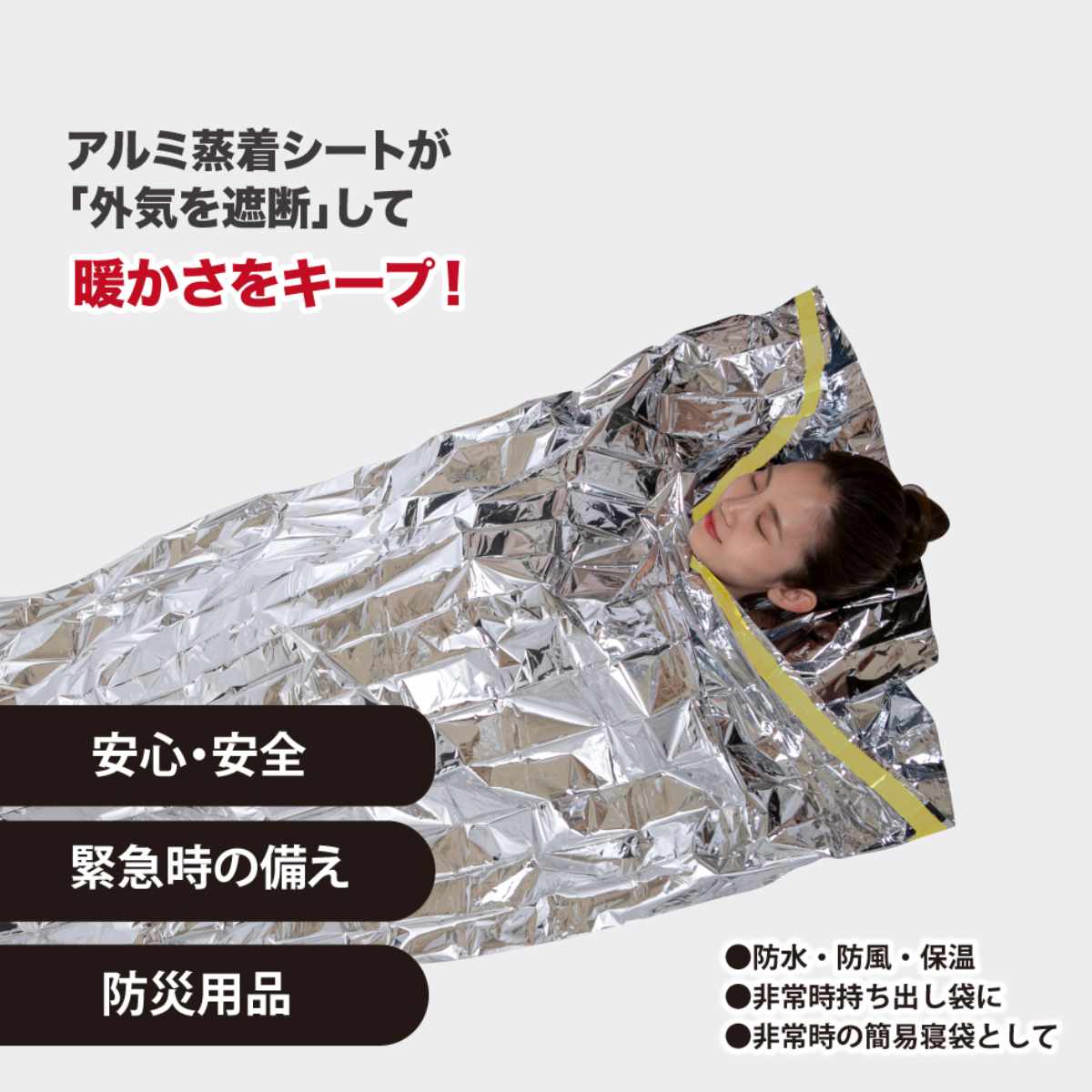 災害・避難時の防寒用として使えるアルミ寝袋です。アルミの保温効果で温かく、毛布などと併用すると保温力がアップします。
