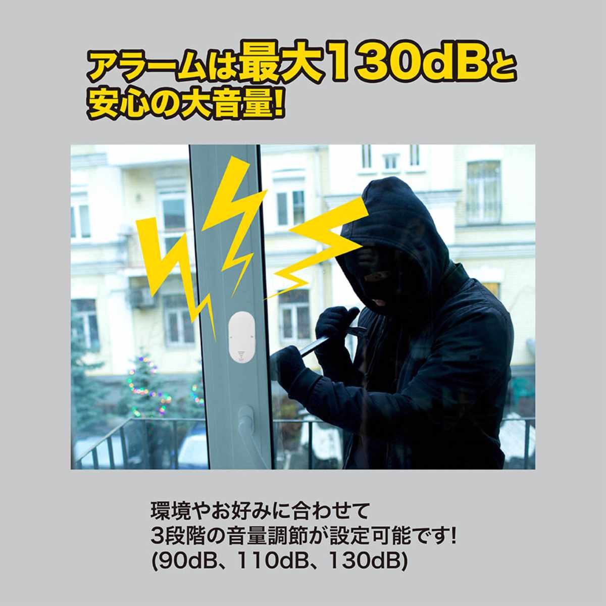 90dB・110dB・130dBの3段階調節が可能です。最大130dBの大音量で、電車通過時レベルの警告音が周囲に異変を強く知らせ、防犯対策や侵入抑止に役立ちます。