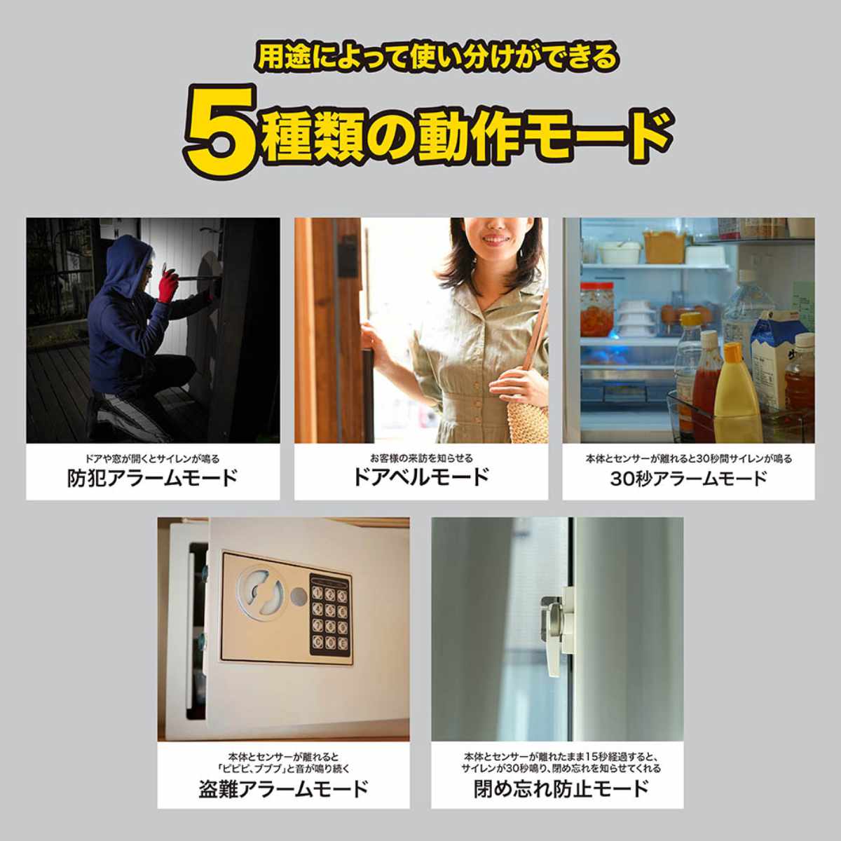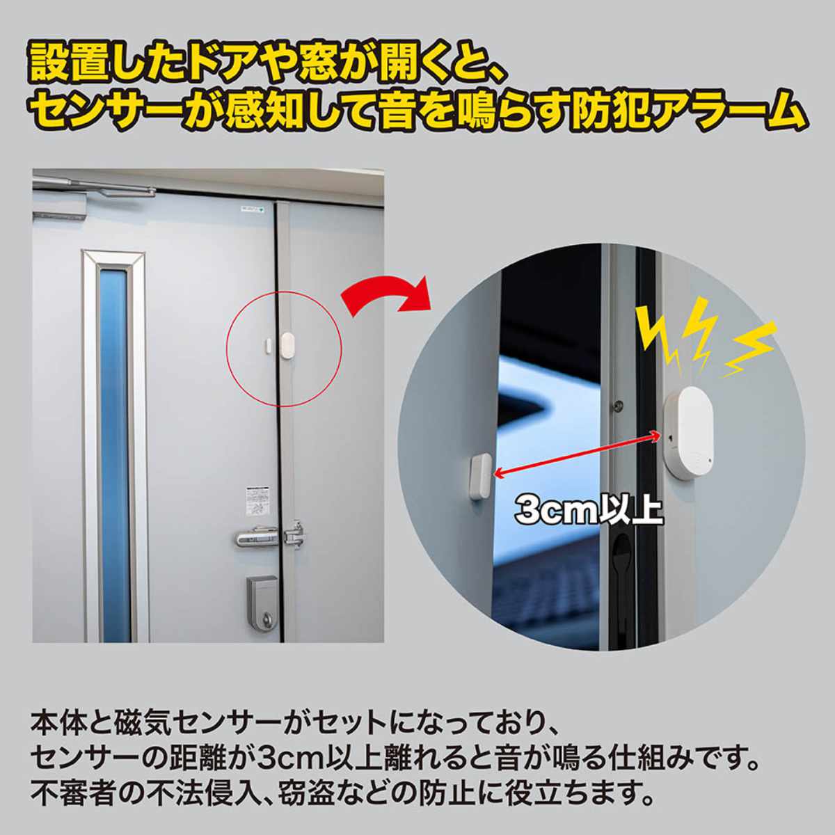 ドアが開くとセンサーが感知し、大音量で警告音を発する防犯アラームです。一人暮らしの方や、夜間の防犯対策が気になる方にもおすすめです。異変を音で知らせてくれるので、就寝中も安心してお使いいただけます。