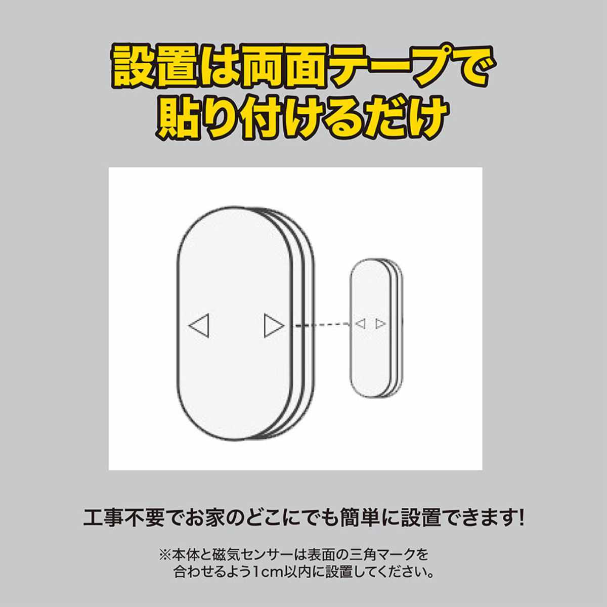| 内容量 | 1セット(本体・磁気センサー・粘着テープ・取扱説明書兼保証書・ボタン電池3個) |