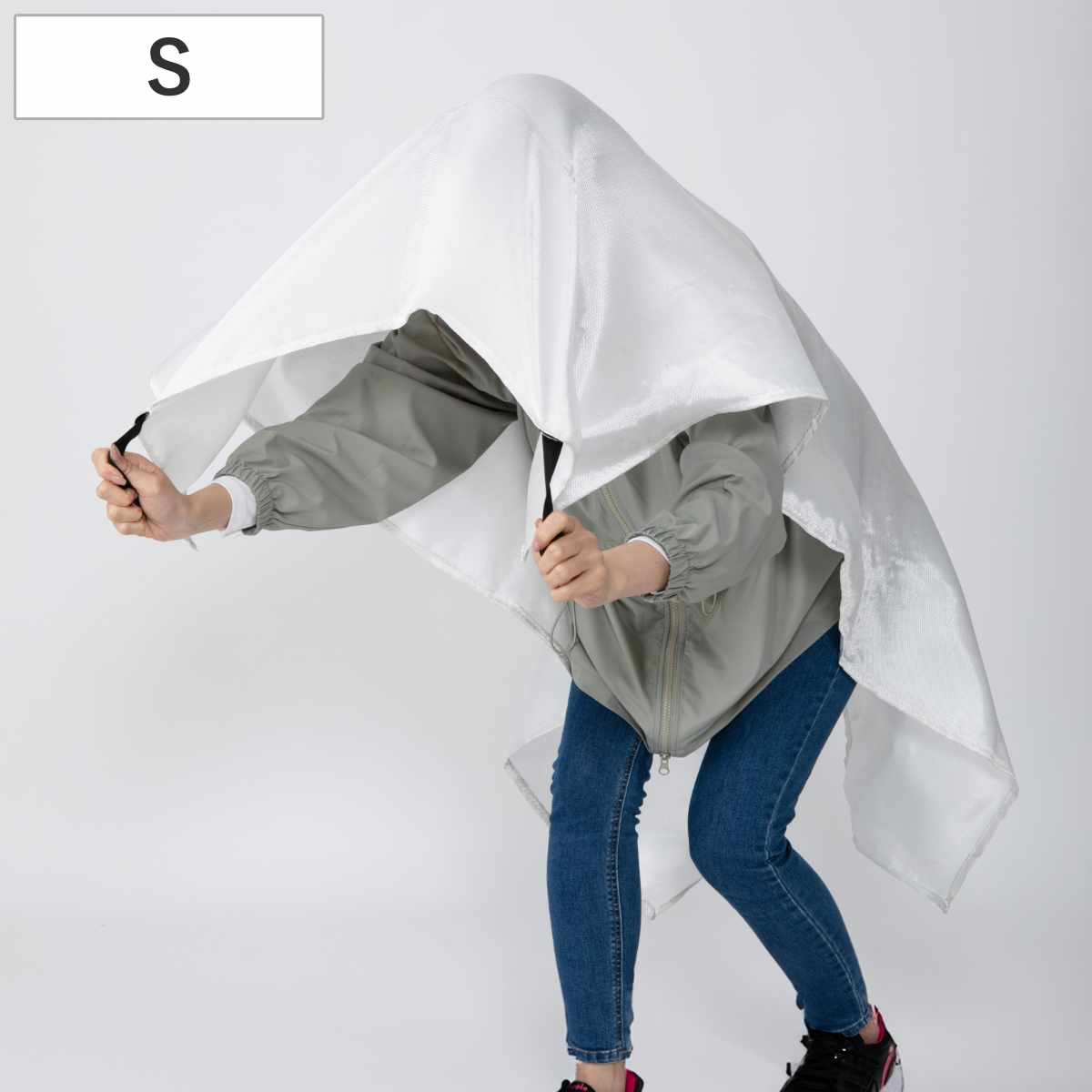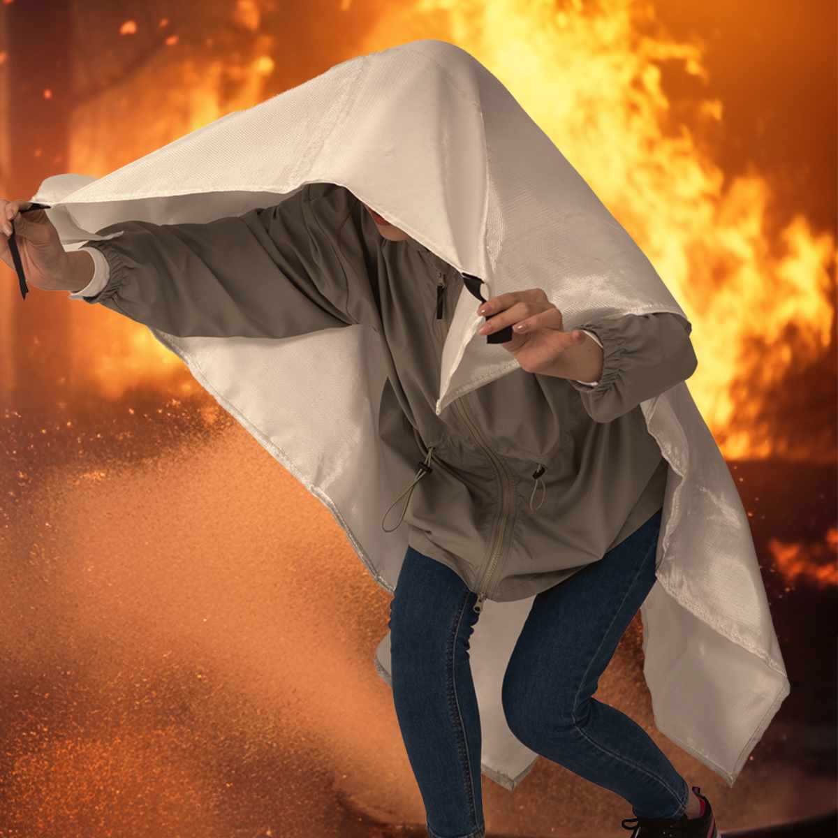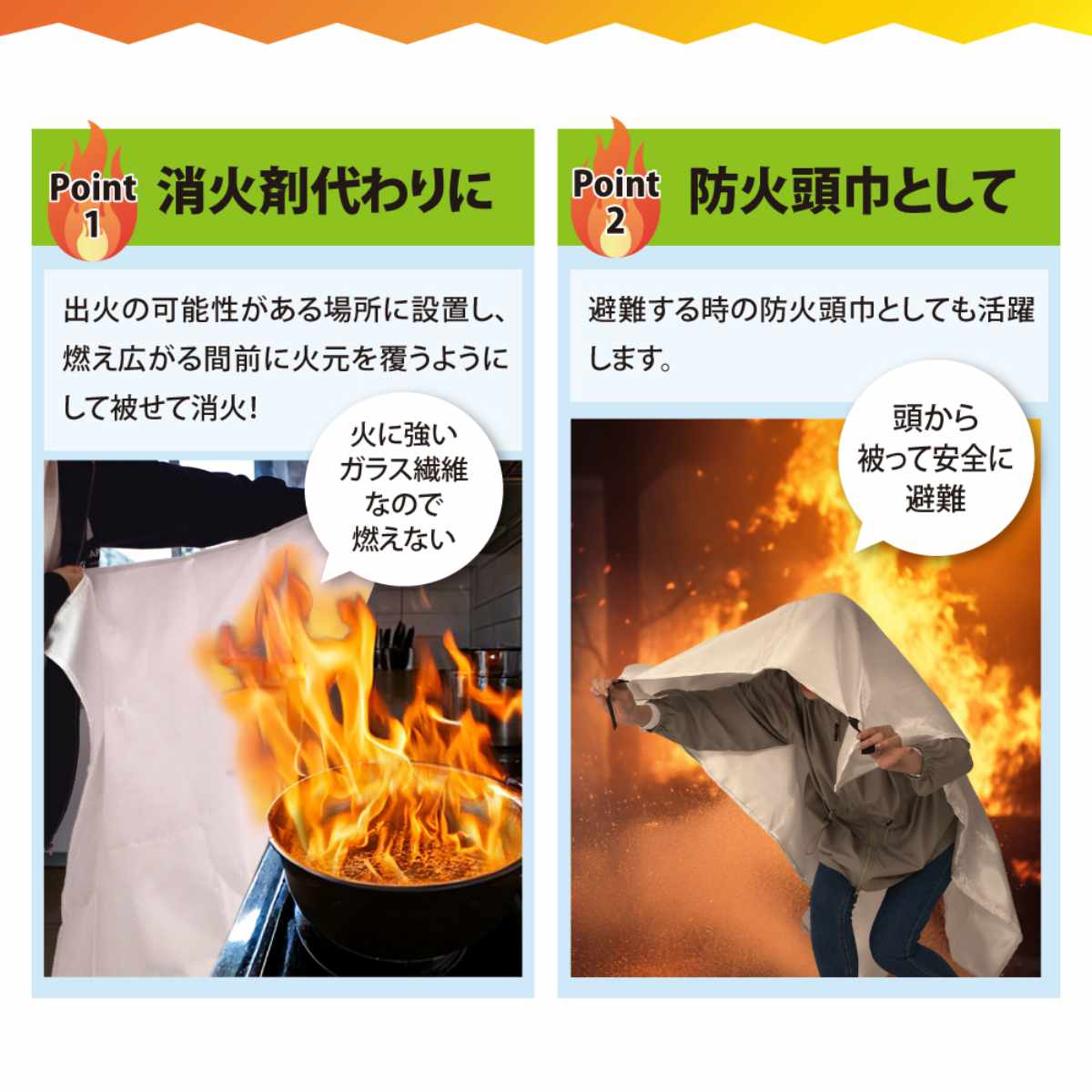 火に強いグラスファイバー素材を使用しています。燃え広がる前に火元へ被せることで消火が可能です。 また、万が一の避難時には防災頭巾としても使用でき、頭部を熱や火の粉から守ります。