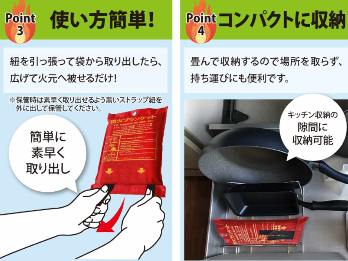 ●いざというときの火災対策として備えておきたい消火ブランケットです。