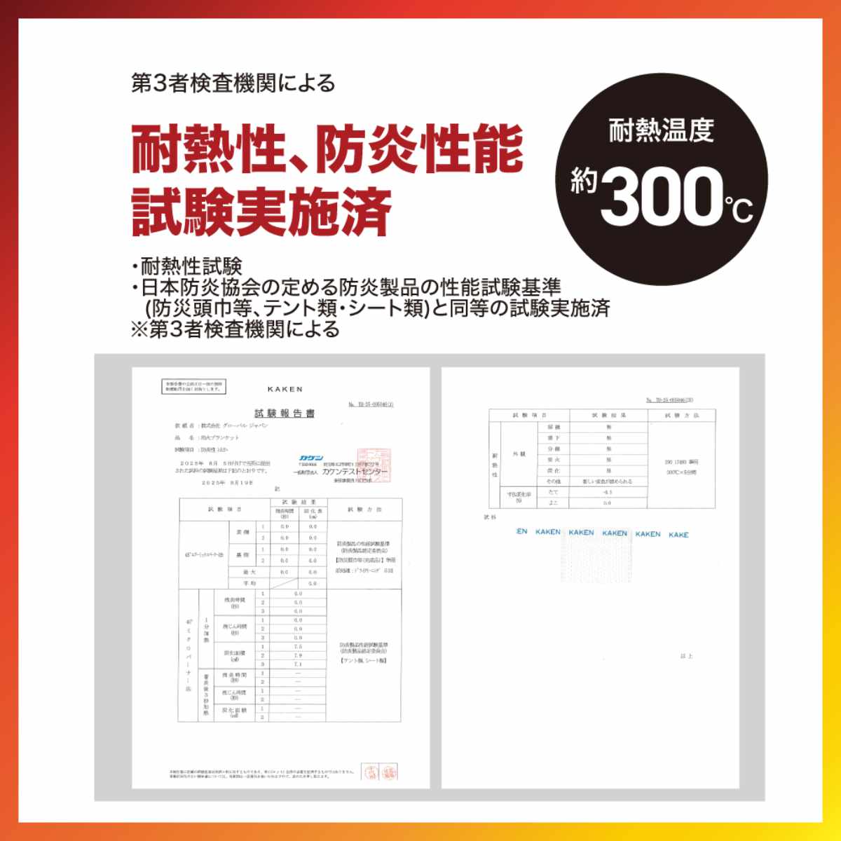 ●耐熱温度は約300度で、耐熱性・防炎性能試験を実施済みです。
