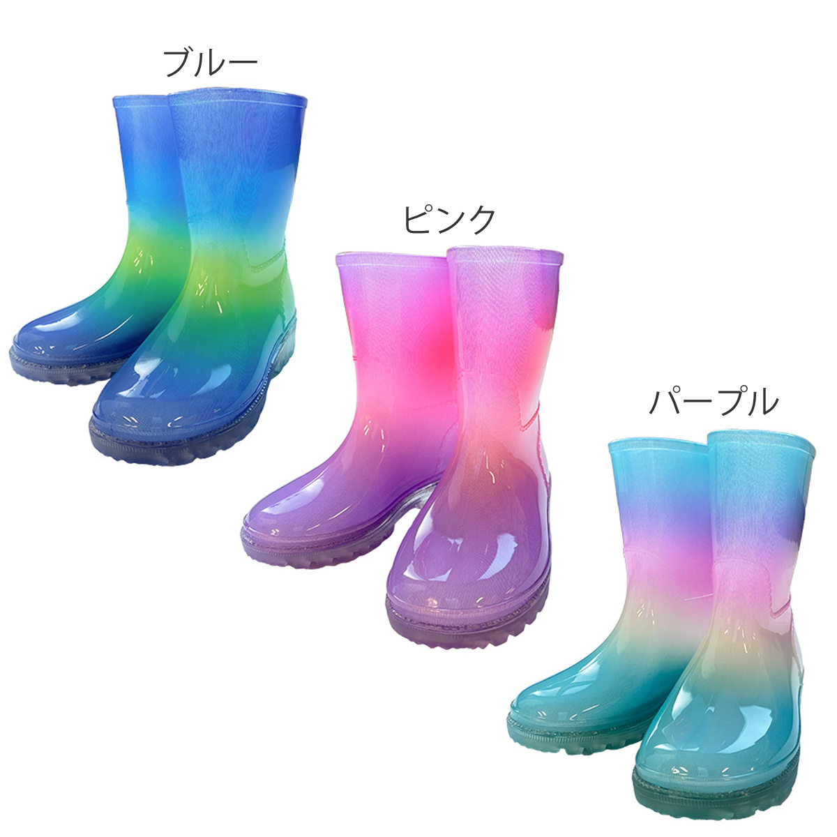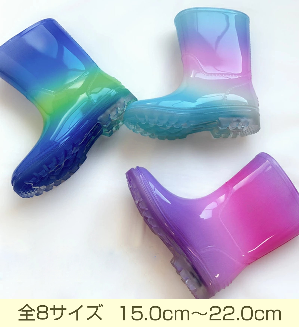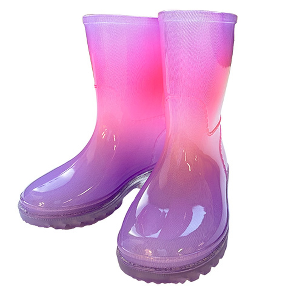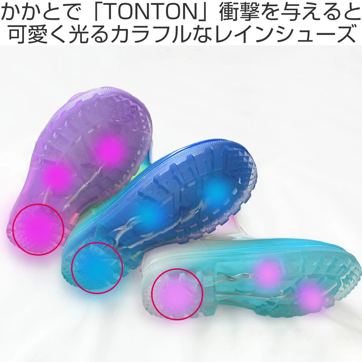 「TONTON」と歩く度にかかとへの衝撃に反応し、「ピカピカ」とカラフルに光ります。おしゃれなグラデーションカラーで雨の日のお出かけも楽しくなるレインシューズです。