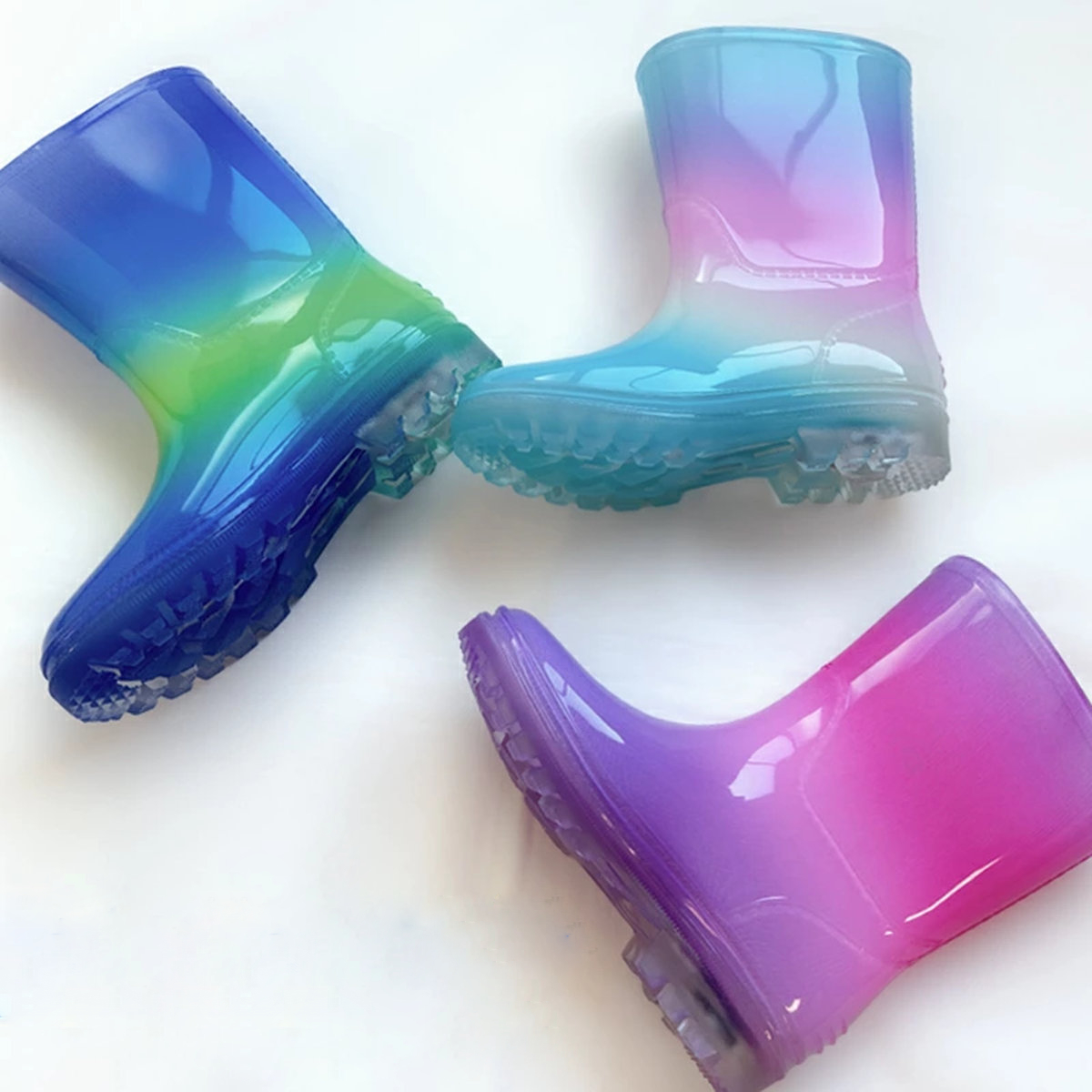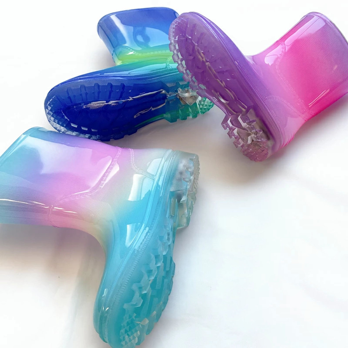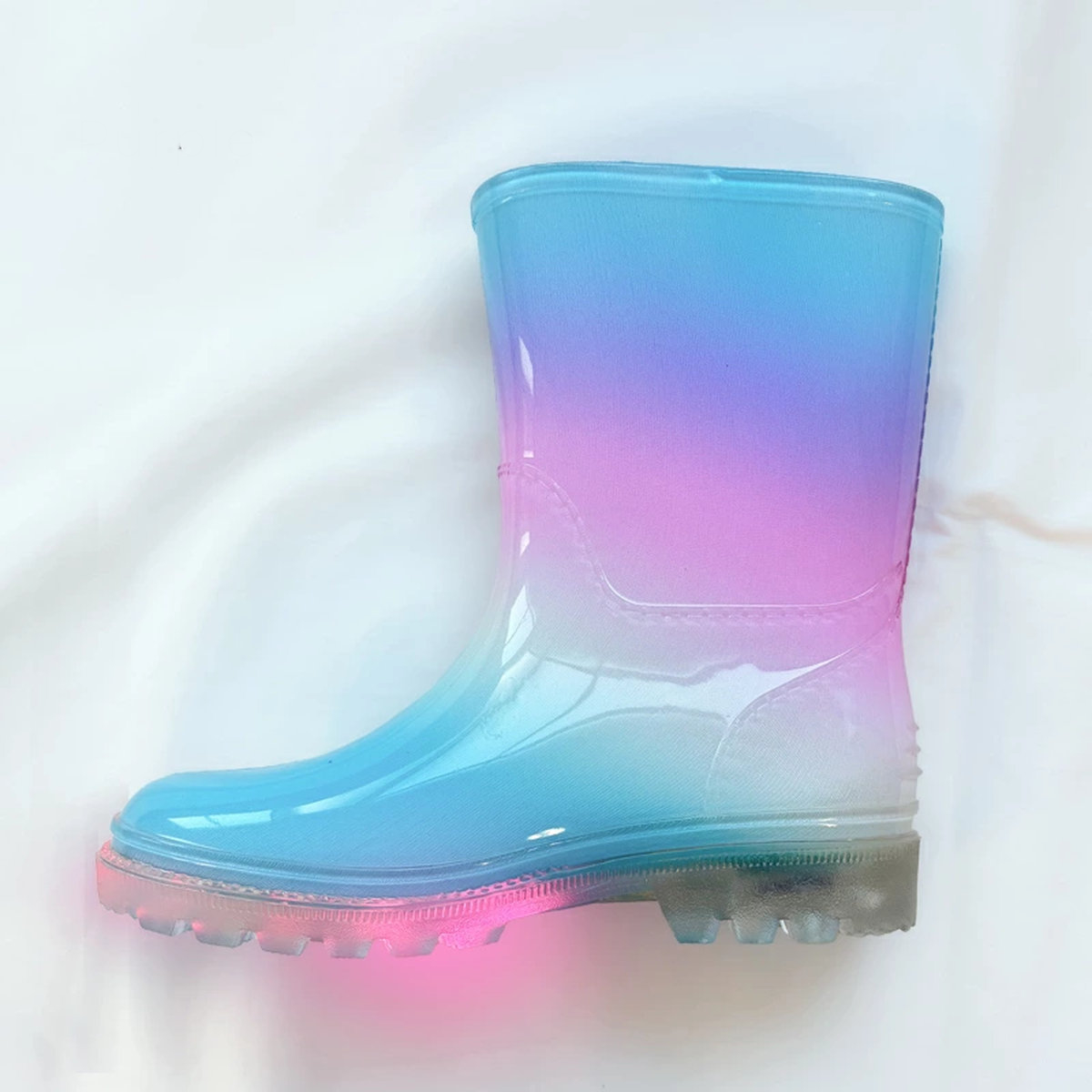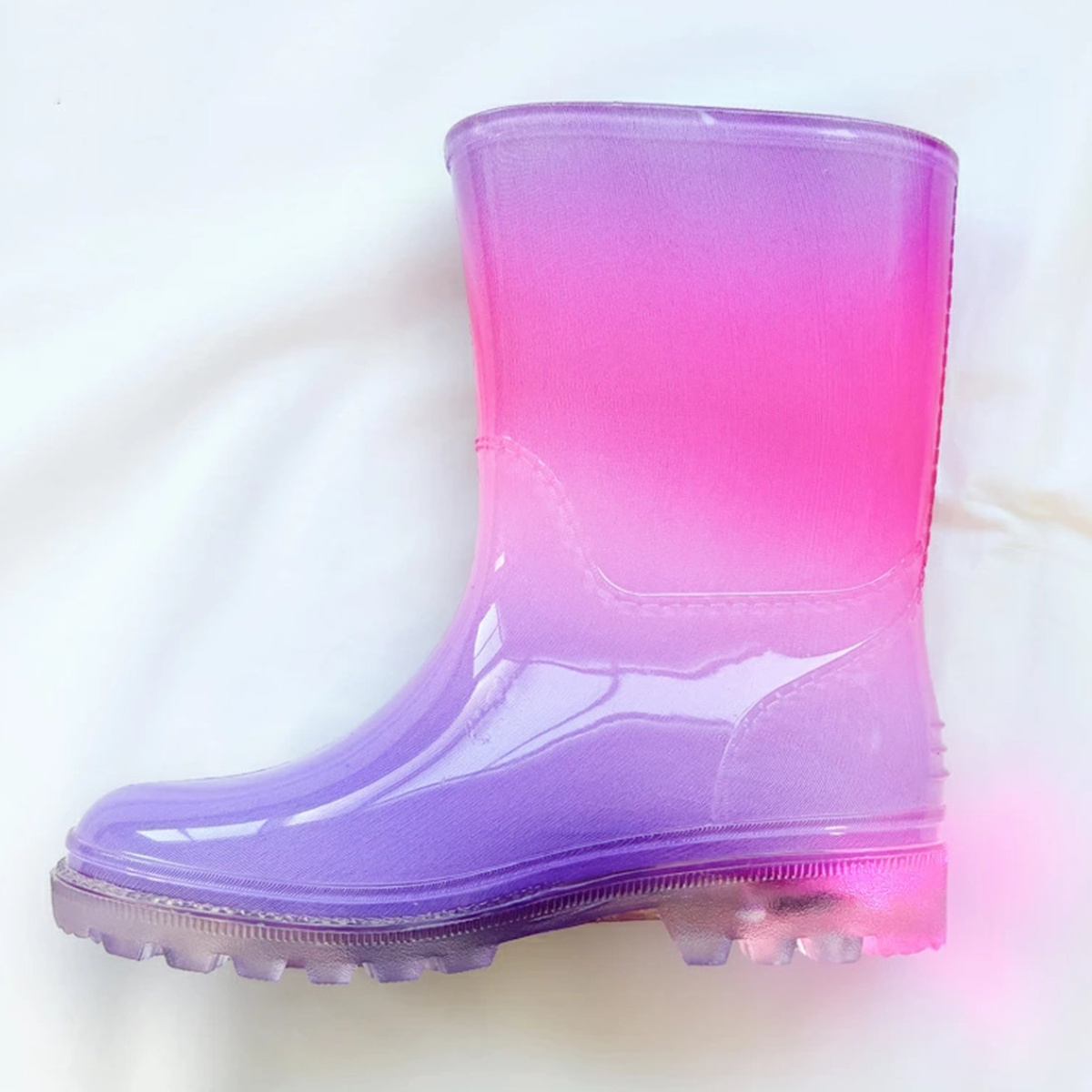 「TONTON」と歩く度にかかとへの衝撃に反応し、「ピカピカ」とカラフルに光ります。おしゃれなグラデーションカラーで雨の日のお出かけも楽しくなるレインシューズです。