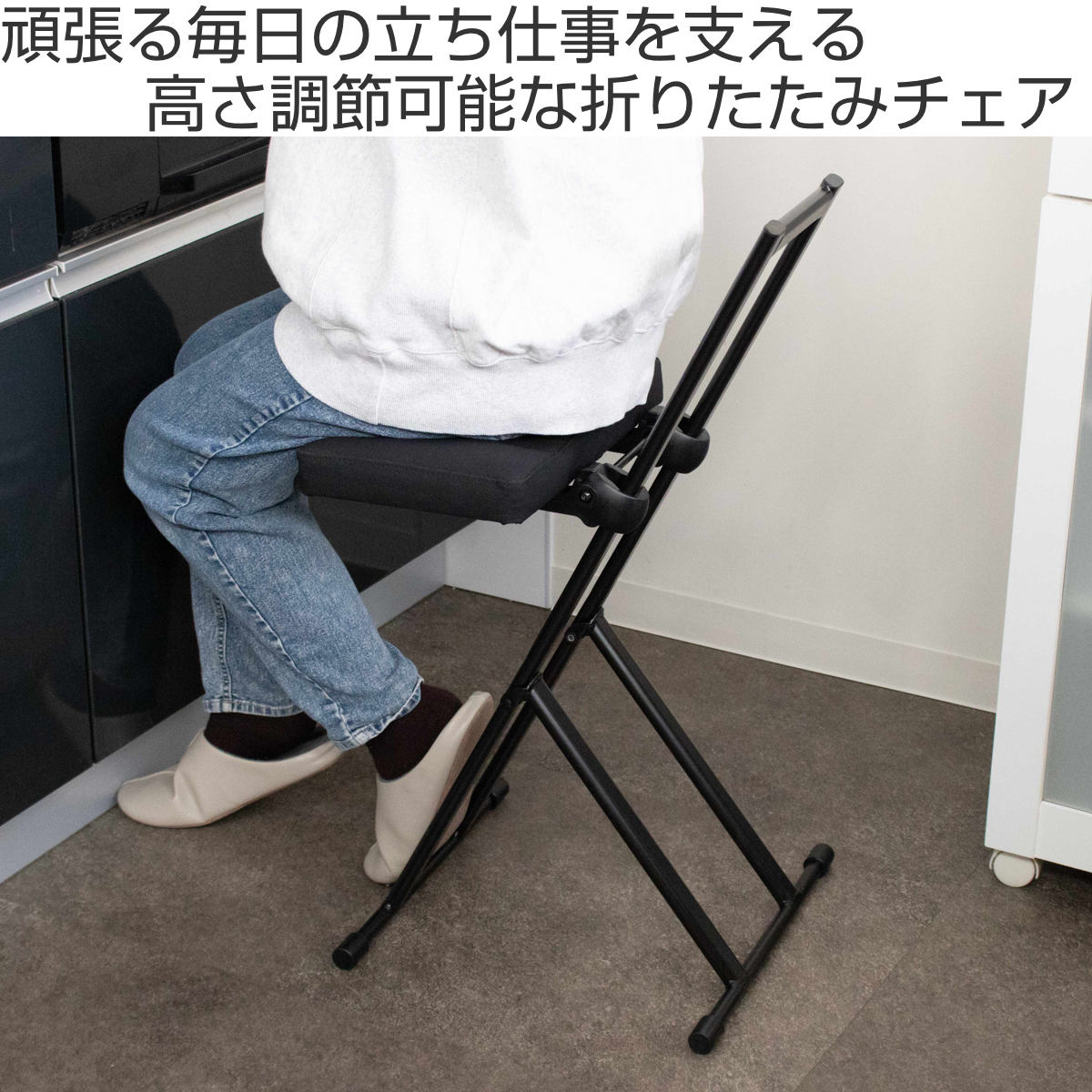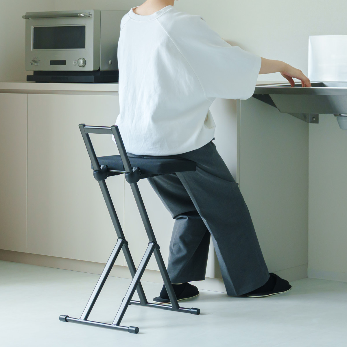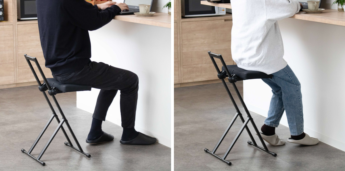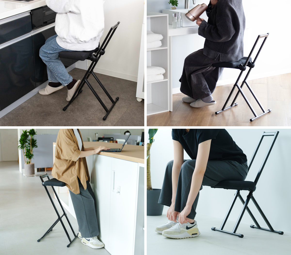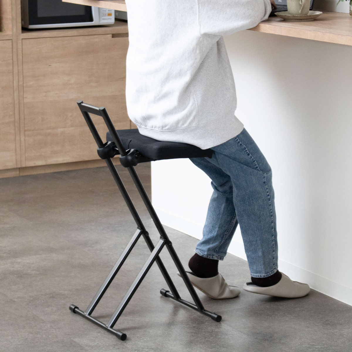 「ちょっと座りたいな」そんな時にすぐに手を伸ばして使える気軽さが嬉しいポイント。調理や洗い物の合間に少し腰を下ろしたい時や、お風呂上りのドライヤー時間など、日常の様々な場面で活躍します。オフィスのカウンターや受付にもおすすめです。