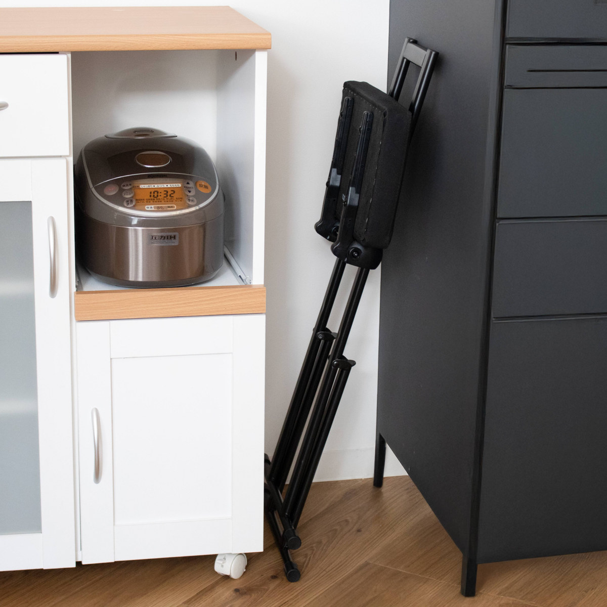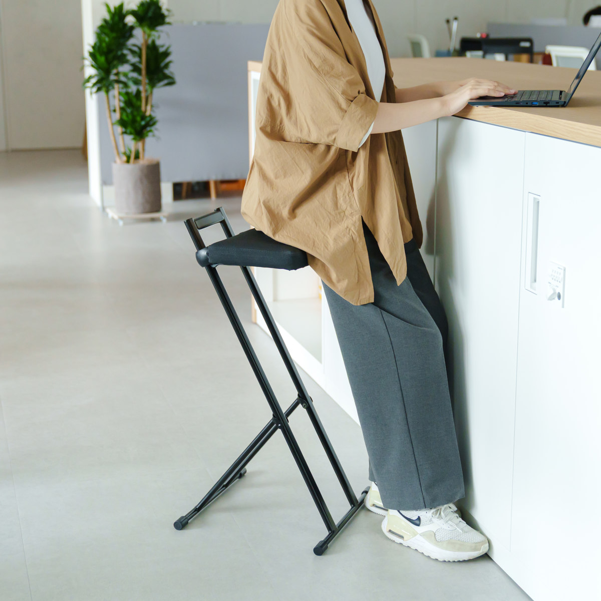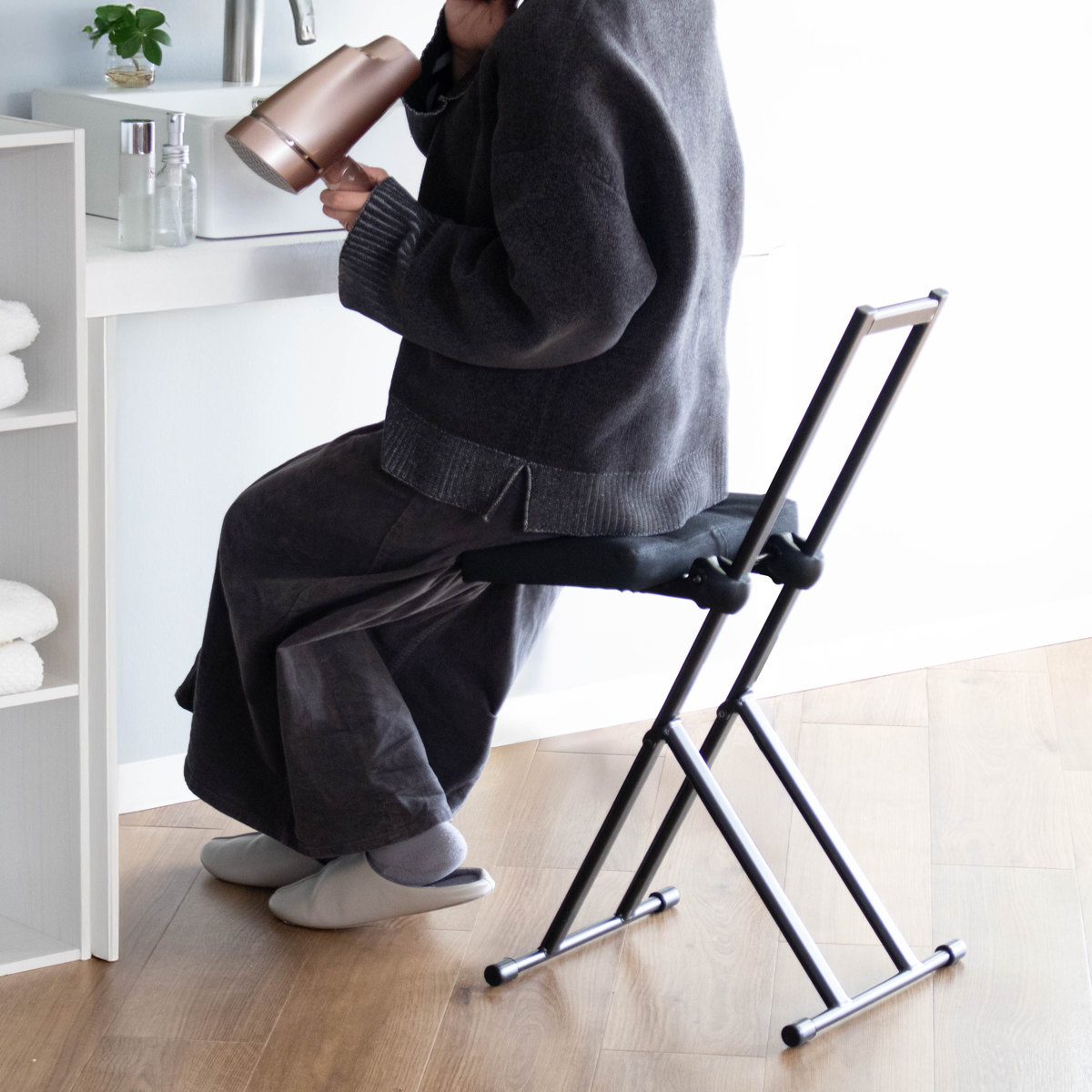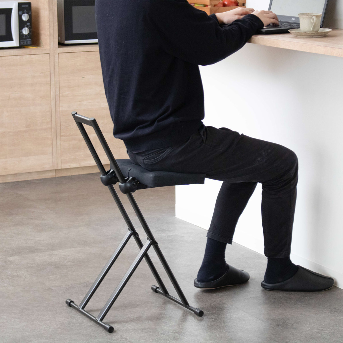 「ちょっと座りたいな」そんな時にすぐに手を伸ばして使える気軽さが嬉しいポイント。調理や洗い物の合間に少し腰を下ろしたい時や、お風呂上りのドライヤー時間など、日常の様々な場面で活躍します。オフィスのカウンターや受付にもおすすめです。