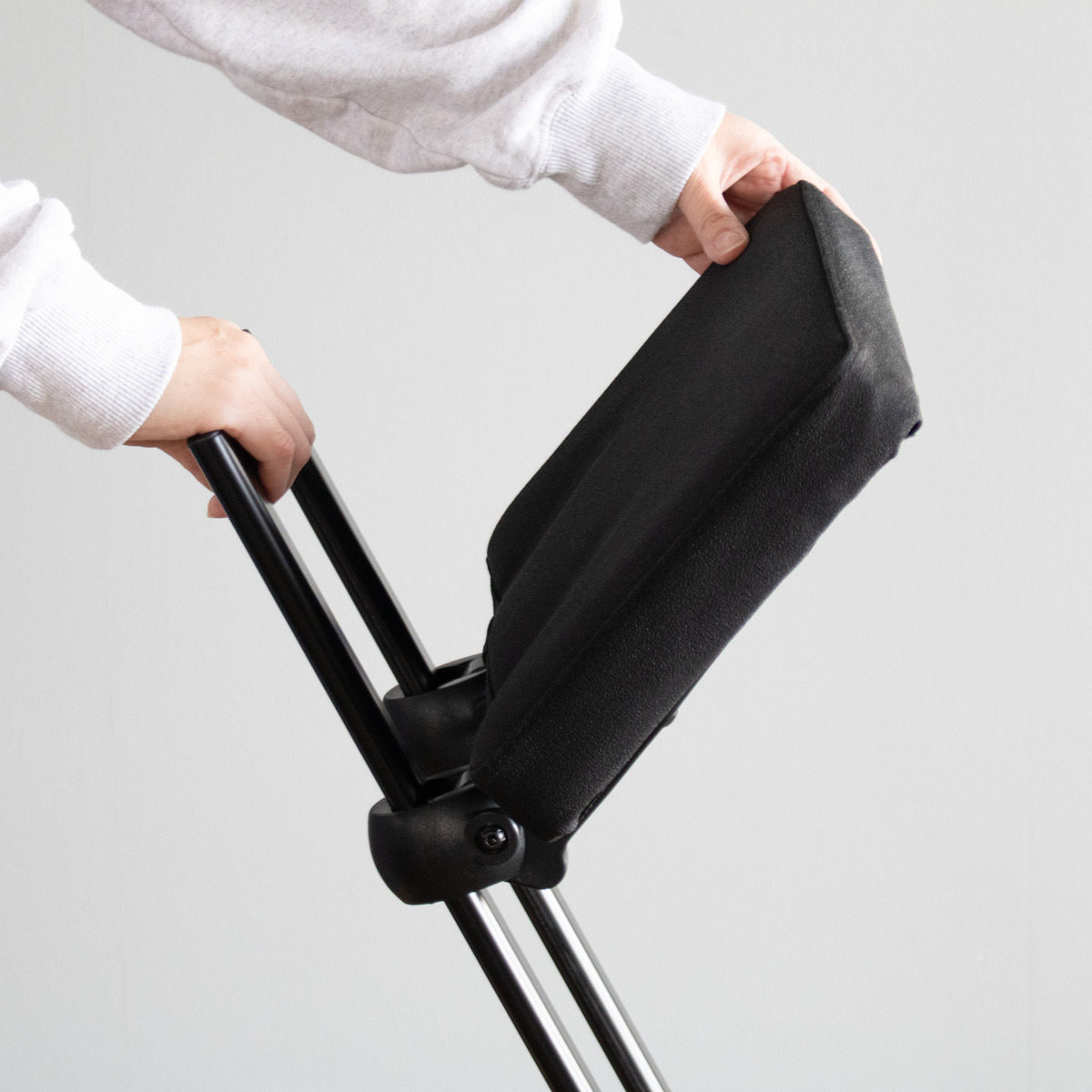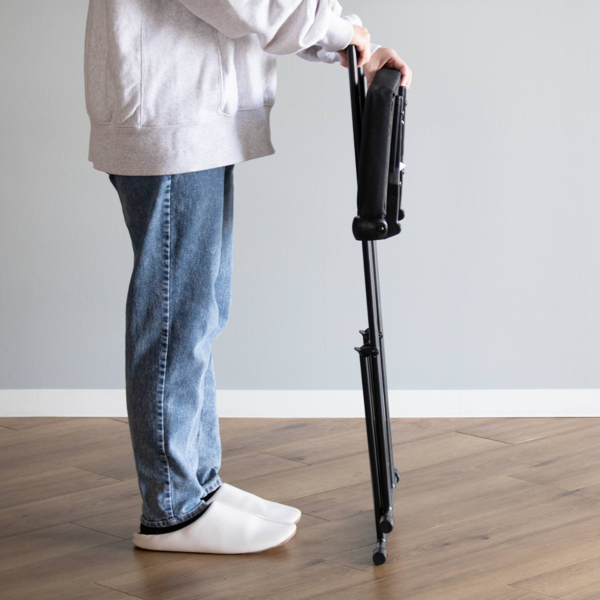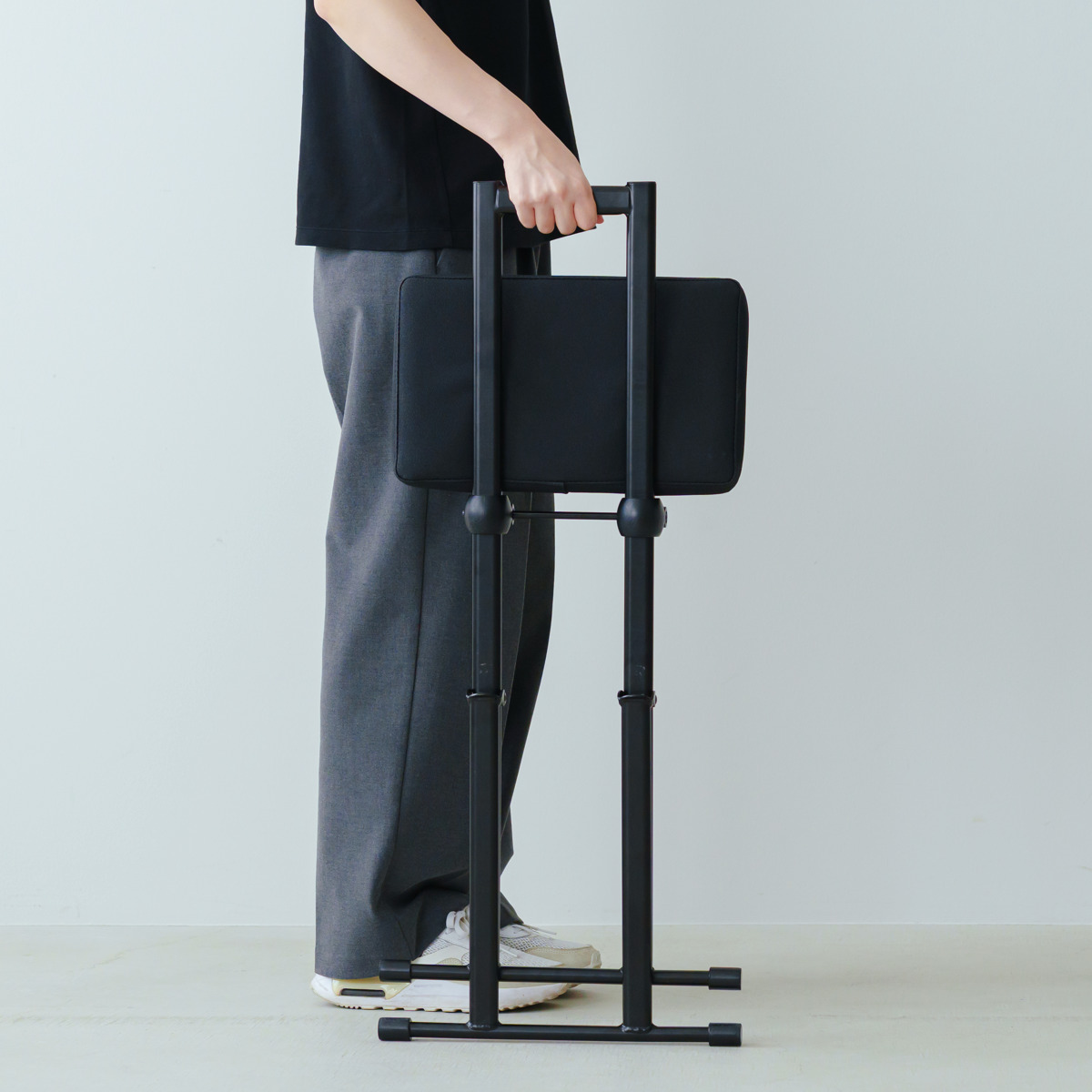 座面をたたんで持ち上げるだけで、脚が閉じて折りたたみ完了。背もたれが持ち手になるので安全に持ち運びが可能です。ちょっとしたすき間にもスッキリ収納でき、使いたい時にサッと取り出して使えます。