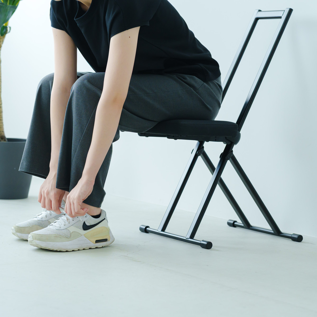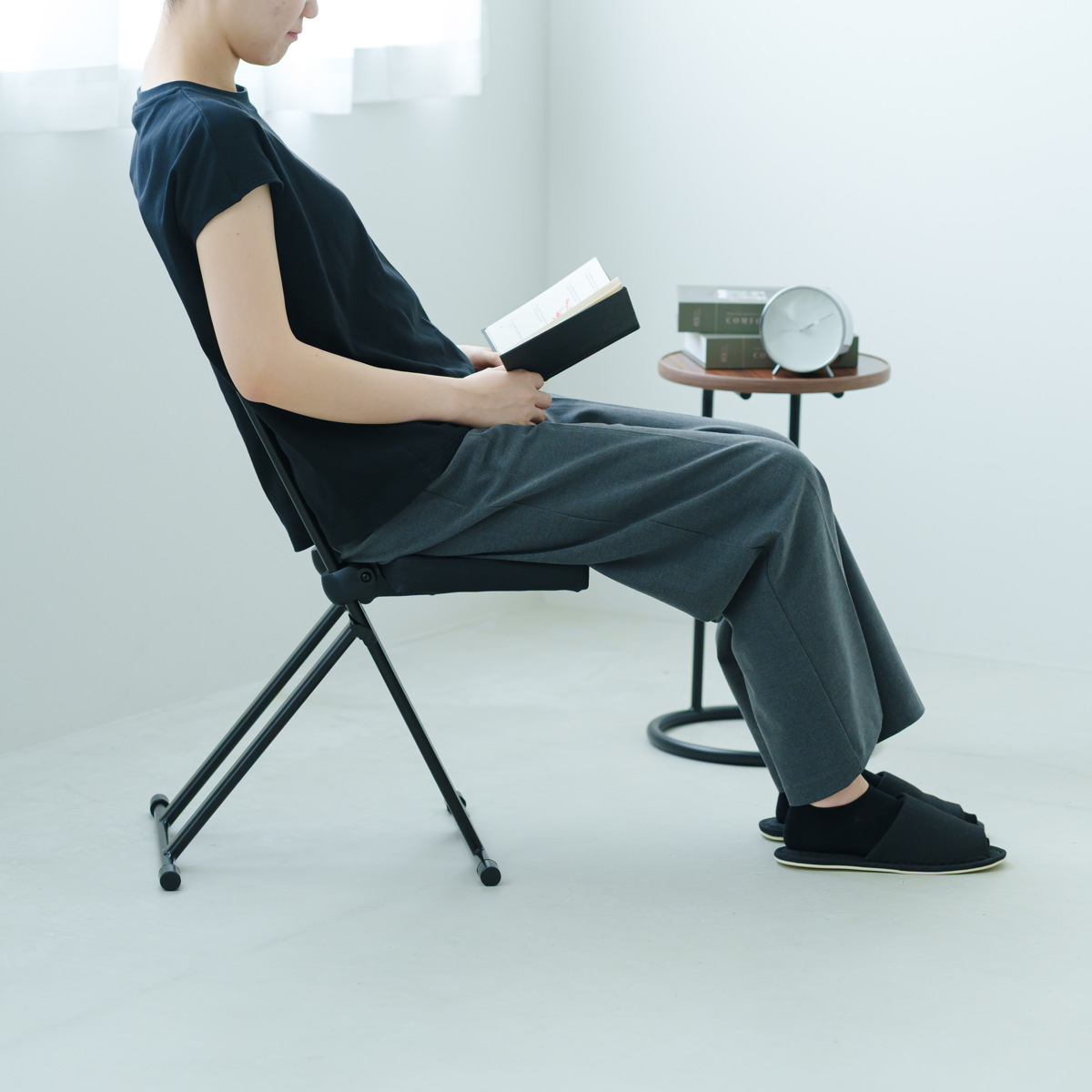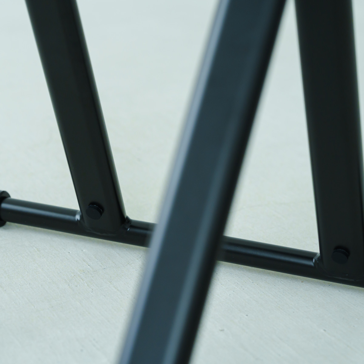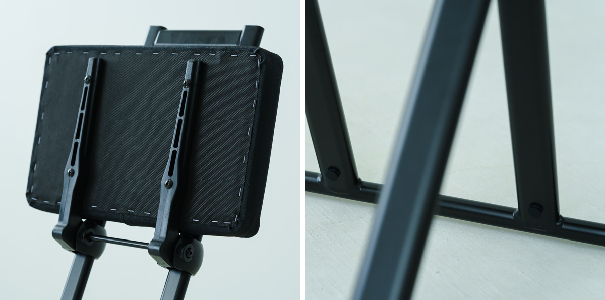 フレームの洗練された印象を際立たせるため、ネジなどの部品や折りたたんだ時に見える座面裏も細部にいたるまでブラックカラーで統一しました。どの角度から見ても美しく、飽きることなく長くご愛用いただけるデザインです。
