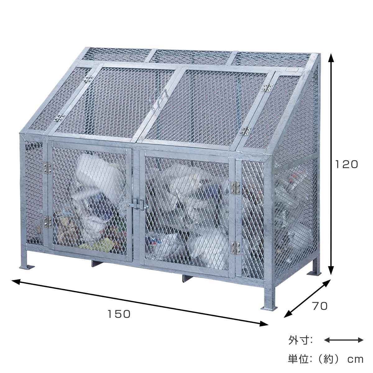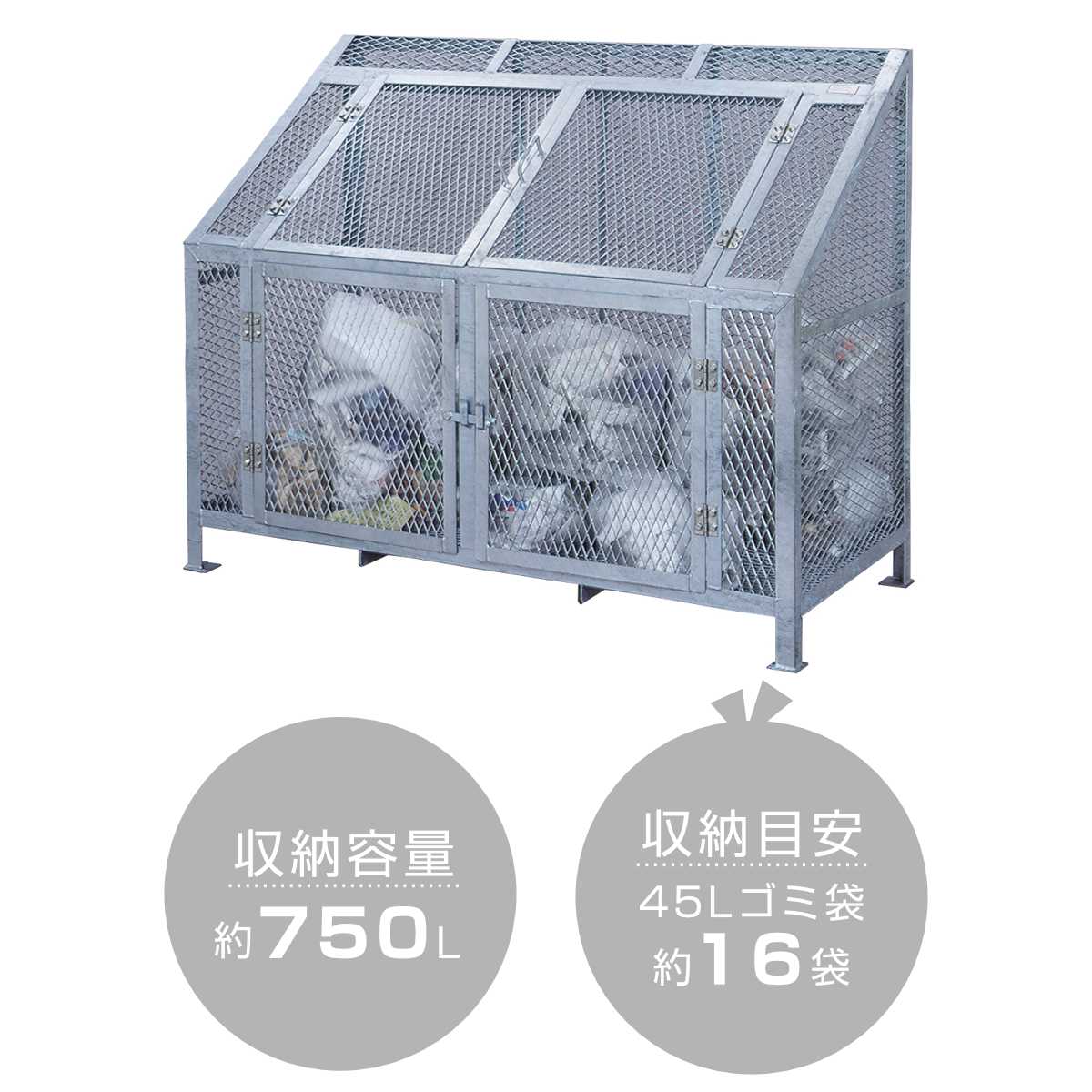 容量は750Lで45Lゴミ袋を約16袋収納可能。町内会のゴミ集積所、オフィスや施設での使用に適しています。日常的にゴミが出る場所でも対応でき、敷地内設置にちょうど良い容量です。