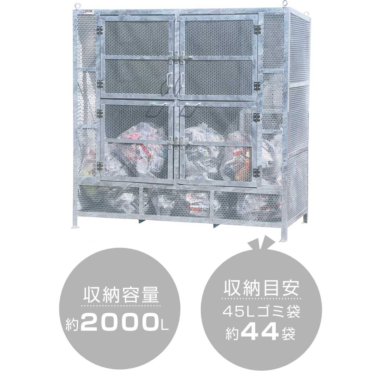 容量は2000Lで45Lゴミ袋を約44袋収納可能。大型施設や商業施設、町内会などで大量のゴミをまとめて保管できる、共用集積所向けの大容量タイプです。