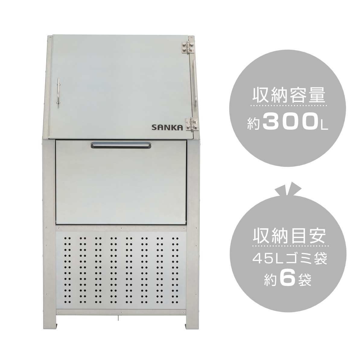 容量は300Lあり、45Lゴミ袋を約6袋収納できます。小規模オフィスや店舗、少人数の町内会におすすめです。