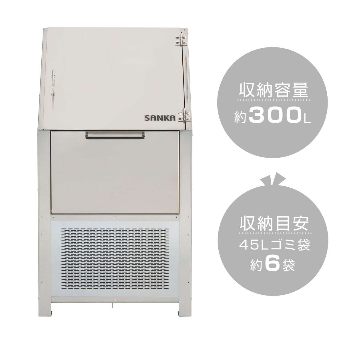 容量は300Lあり、45Lゴミ袋を約6袋収納できます。小規模オフィスや店舗、少人数の町内会におすすめです。