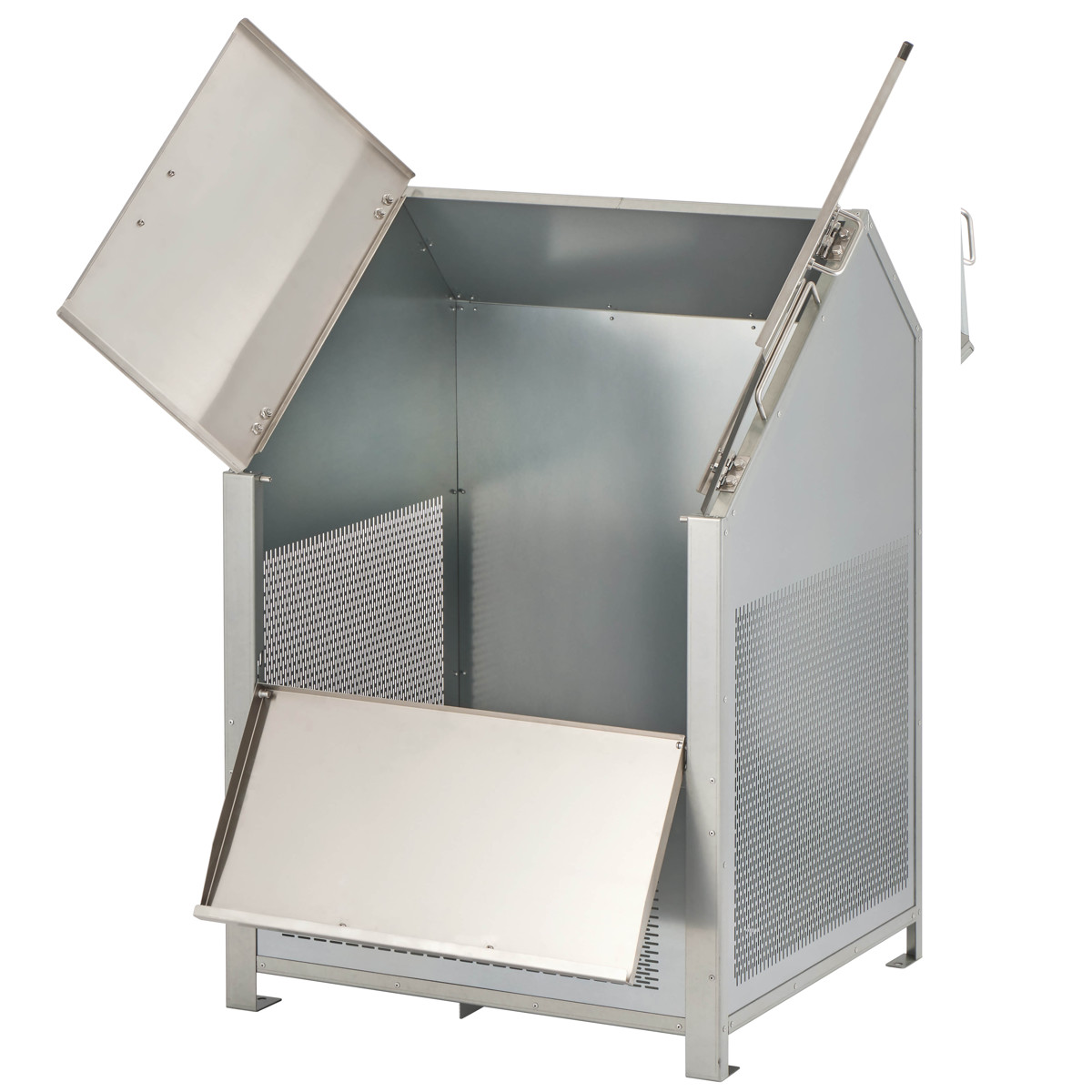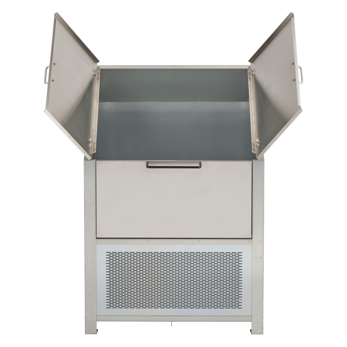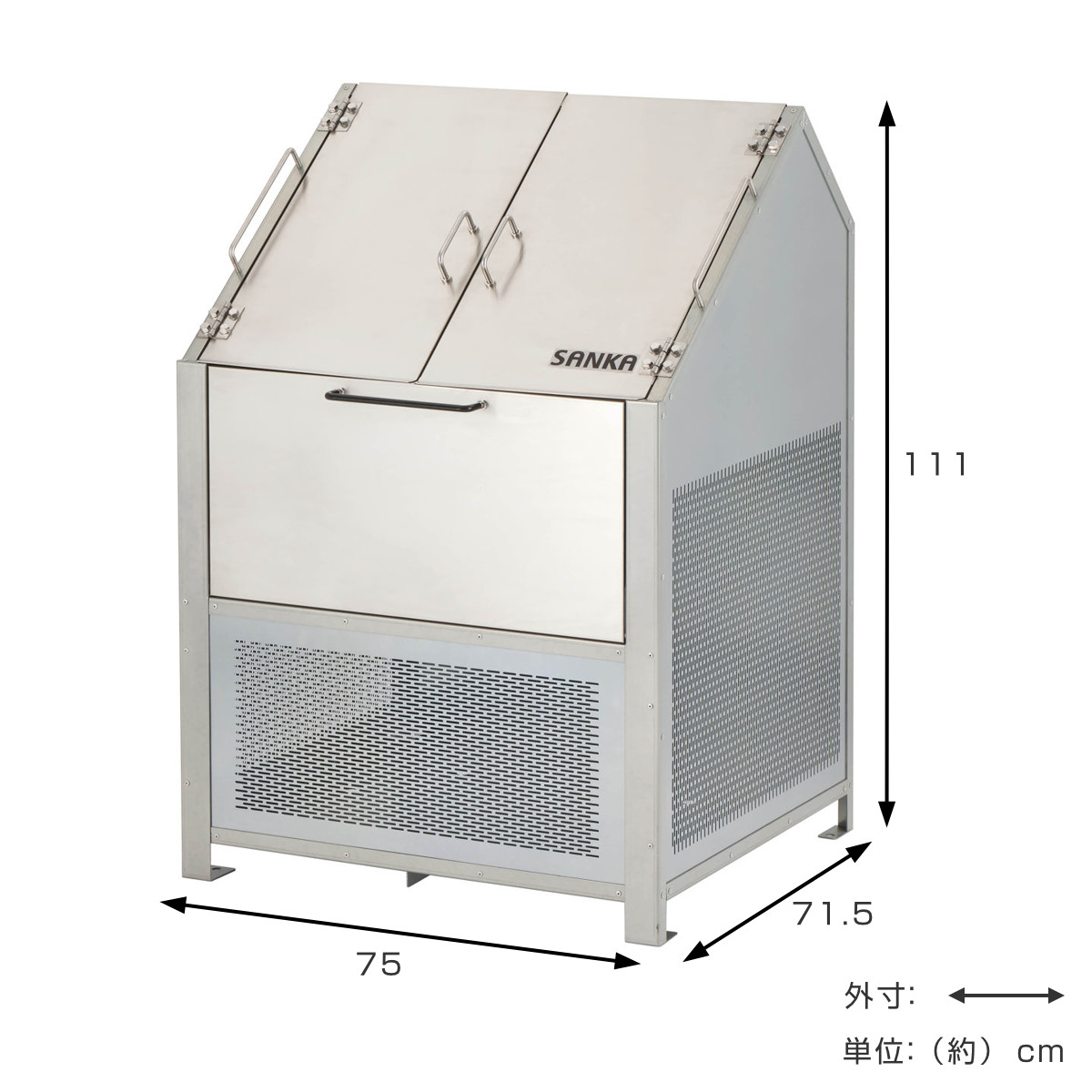 かさばりがちな可燃ごみや資源ごみをまとめて収納でき、ゴミ出しまでの一時保管に便利なゴミ収納庫です。扉はサビに強いステンレス製でお手入れが簡単。シンプルでスタイリッシュなデザインは、建物まわりや敷地内に設置しても景観を損ねにくいです。