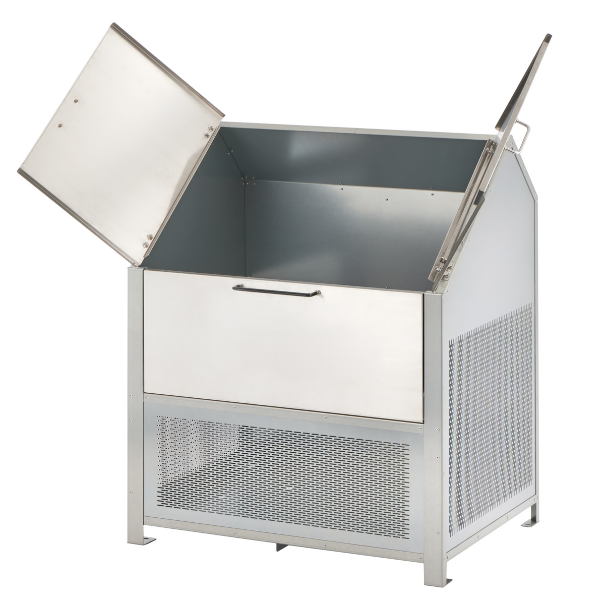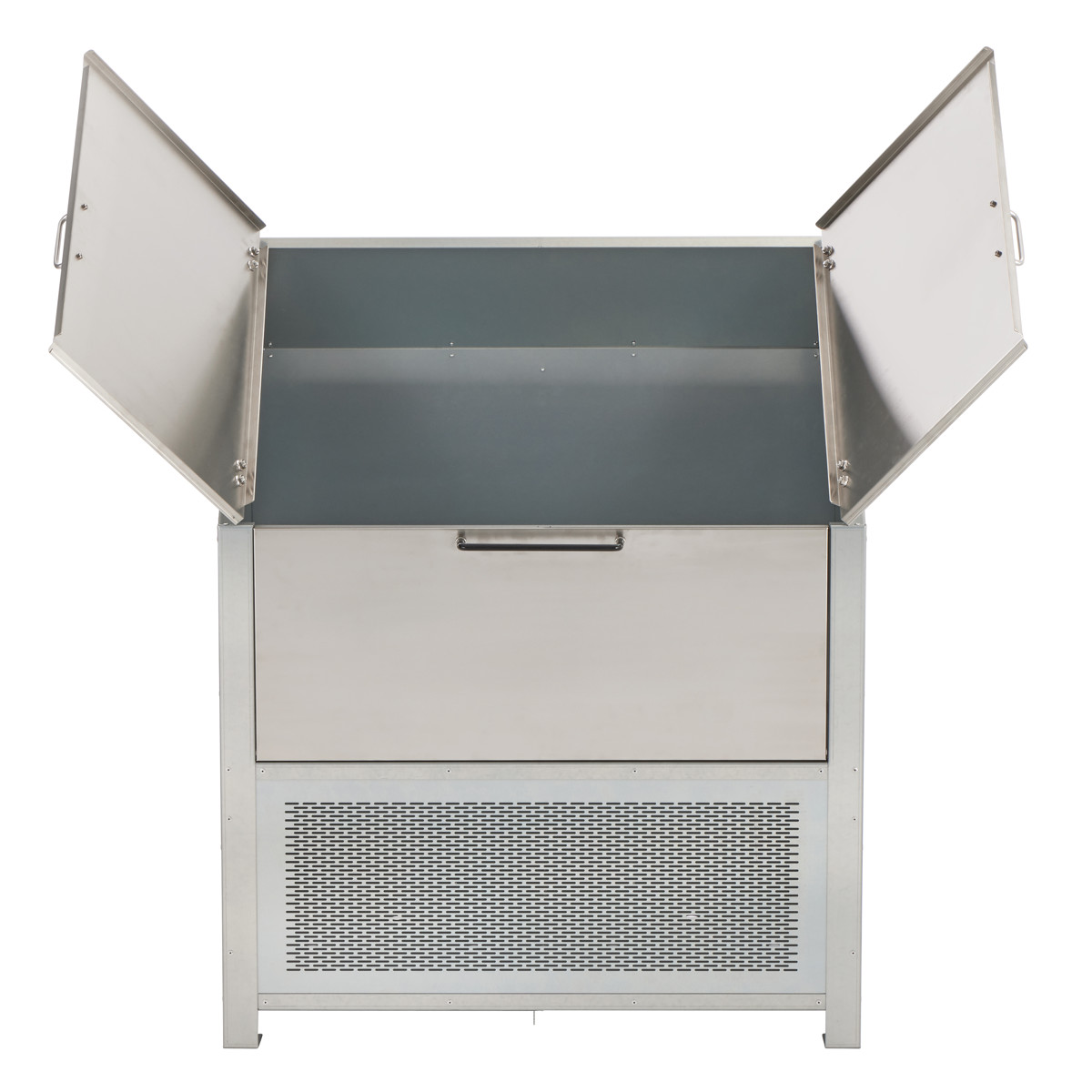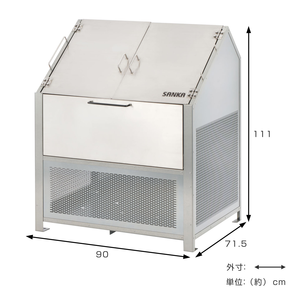 かさばりがちな可燃ごみや資源ごみをまとめて収納でき、ゴミ出しまでの一時保管に便利なゴミ収納庫です。扉はサビに強いステンレス製でお手入れが簡単。シンプルでスタイリッシュなデザインは、建物まわりや敷地内に設置しても景観を損ねにくいです。