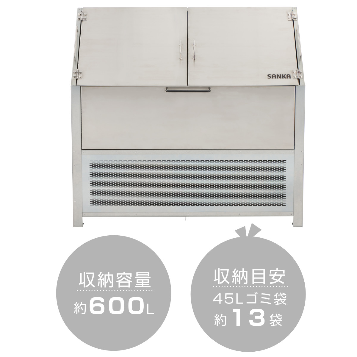 容量は600Lあり、45Lゴミ袋を約13袋収納できます。町内のゴミ集積所や、複数のテナントが入る建物にもおすすめです。