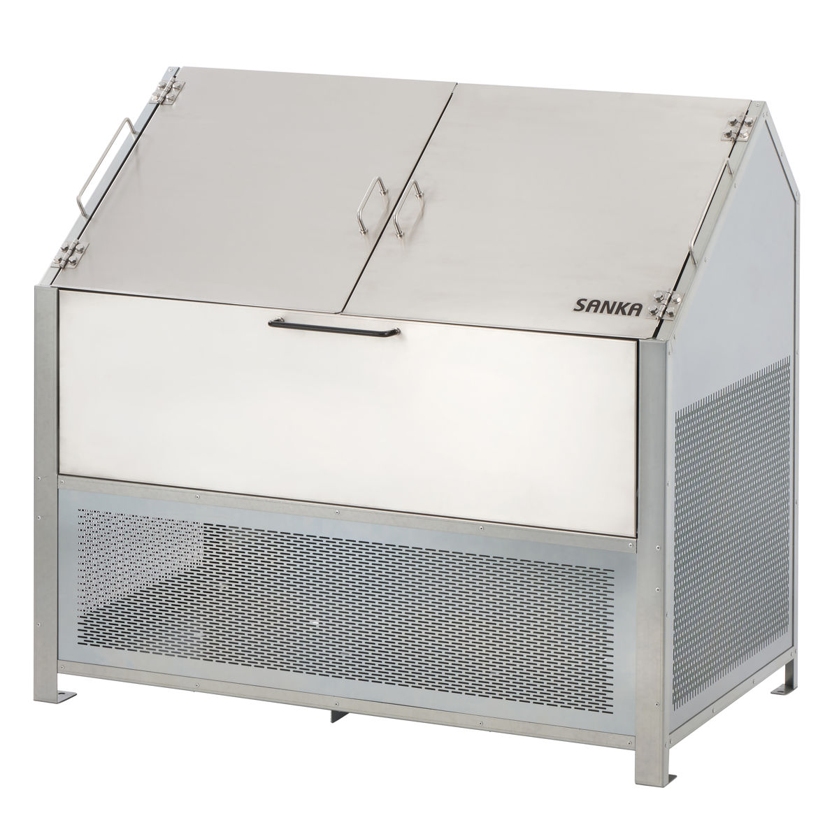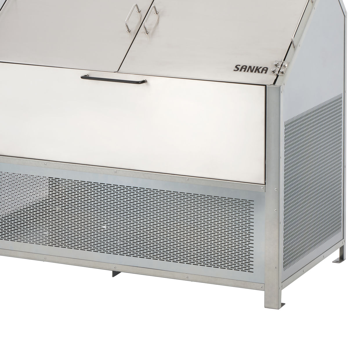 かさばりがちな可燃ごみや資源ごみをまとめて収納でき、ゴミ出しまでの一時保管に便利なゴミ収納庫です。扉はサビに強いステンレス製でお手入れが簡単。シンプルでスタイリッシュなデザインは、建物まわりや敷地内に設置しても景観を損ねにくいです。