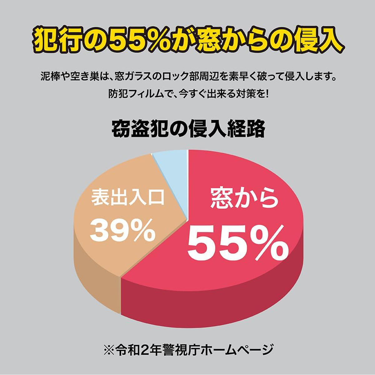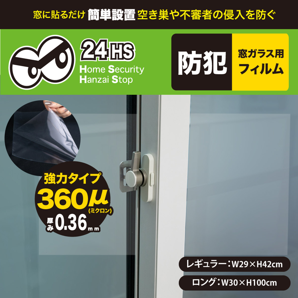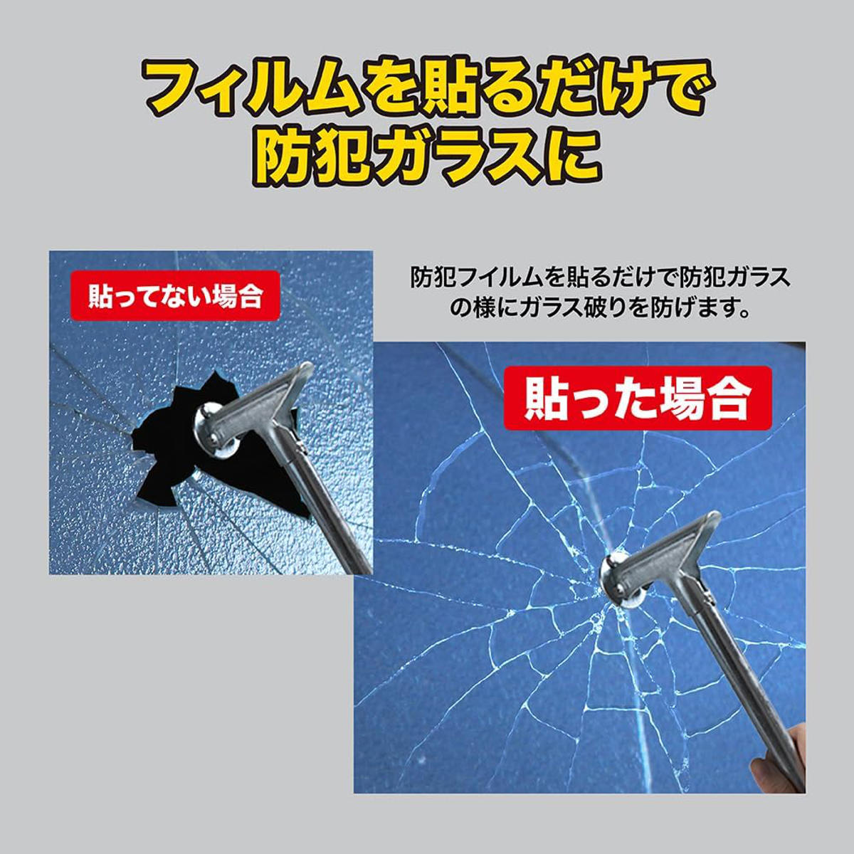 窓に貼るだけで空き巣や不審者の侵入を防ぐことができる窓ガラス用防犯フィルム(厚み0.36mm ロングタイプ)です。ガラス破りをしにくくし、防犯ガラスのような役割を果たします。