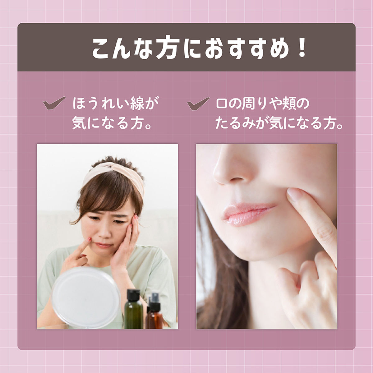 ●口元・頬・ほうれい線まわりのたるみケアに使えます。