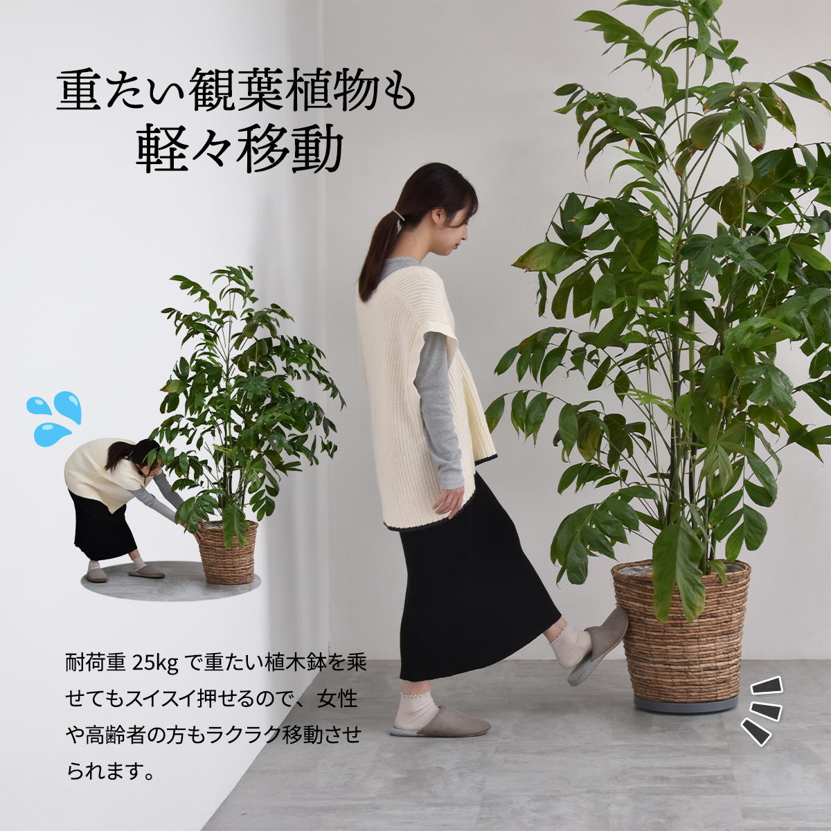 観葉植物や大きな植木鉢の移動をラクにするプランターベースです。キャスター付きなので、お掃除・水やり・日光浴の移動もスムーズ。女性やご高齢の方でも扱いやすい設計です。