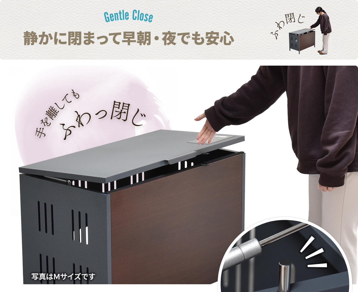 ダンパーが上蓋をしっかりサポート。重いゴミ袋を持っていても片手でスムーズに開けられます。毎日のゴミ出しストレスを軽減します。