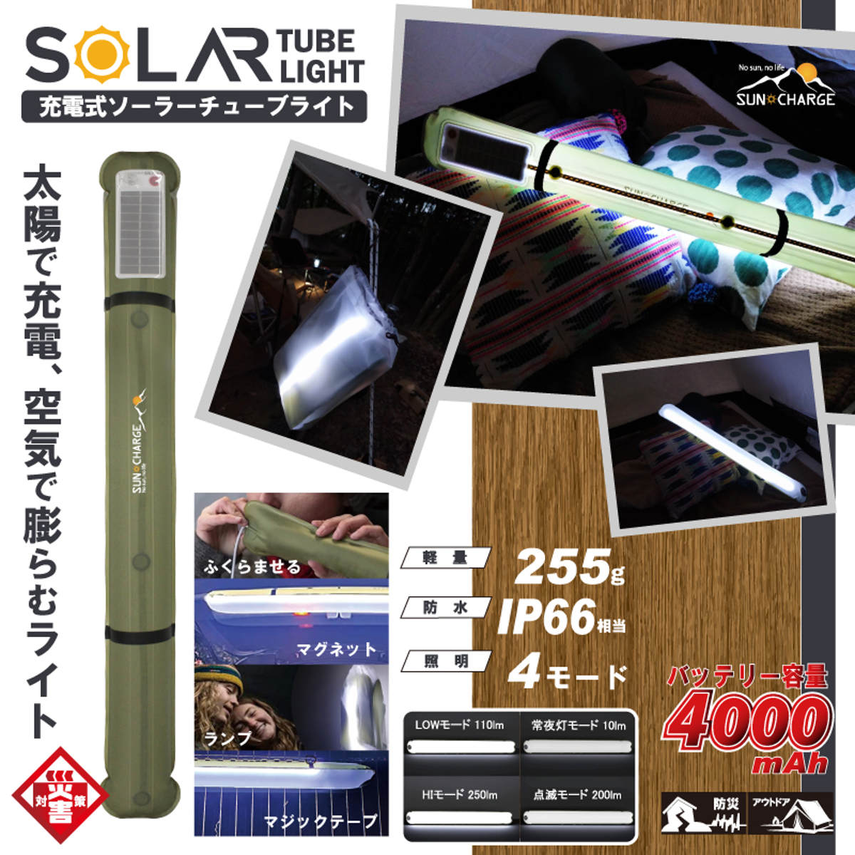 太陽光で充電できるソーラーパネルを搭載しています。電源が確保しにくい災害時や停電時でも、日中に太陽光で充電しておけば夜間の照明として使用できます。照明は4モードあります。