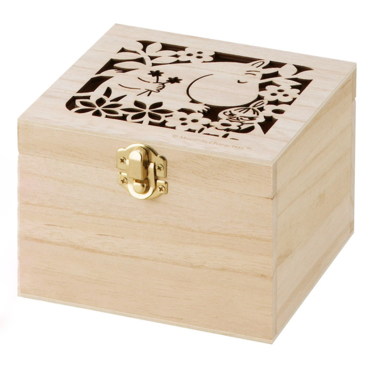 ムーミンの形がくり抜かれた透かし模様の木箱入り