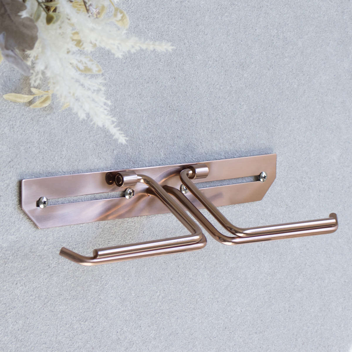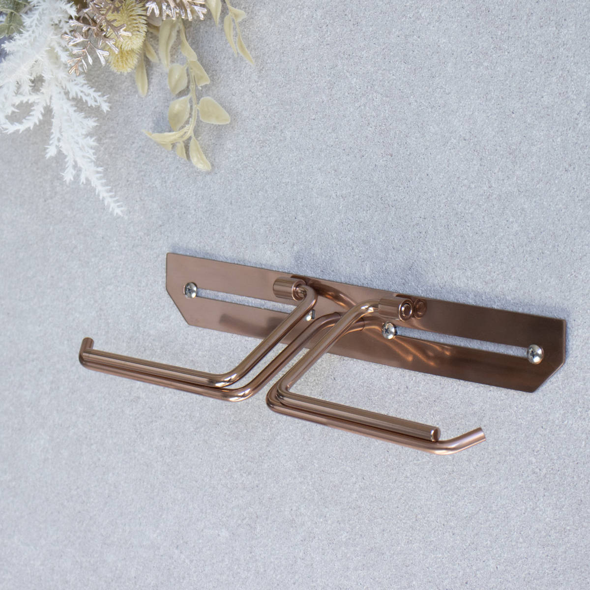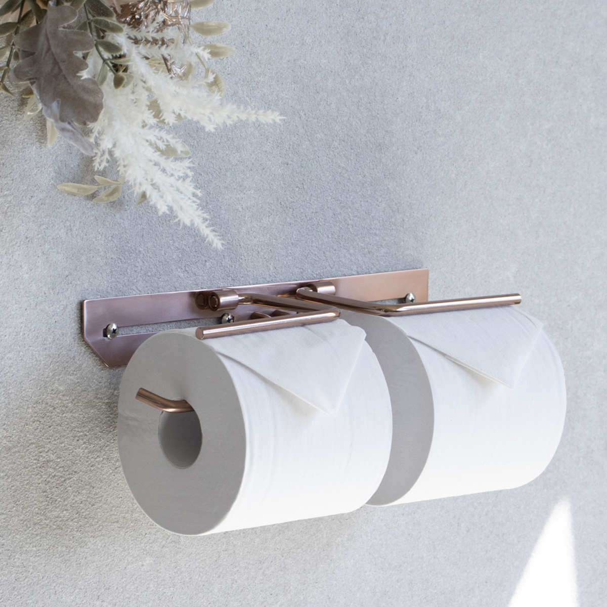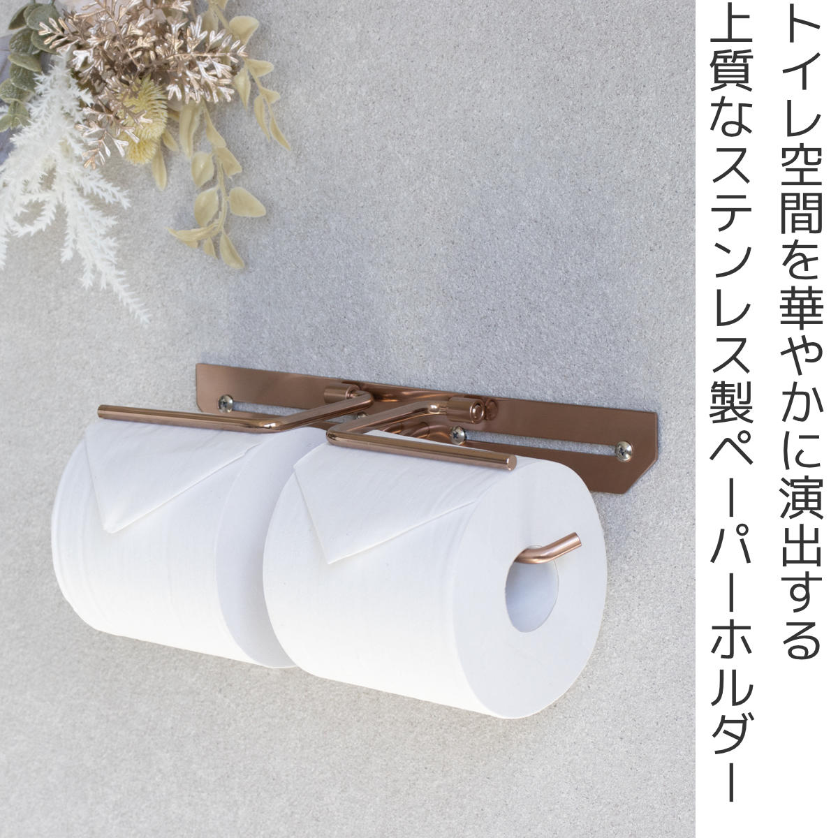 洗練されたシンプルなデザインのトイレットペーパーホルダーです。飽きのこないスタンダードな仕上がりで、さまざまなトイレ空間になじみます。ペーパーを2個セットできるダブルタイプなので、ストックができてペーパー切れの心配を減らせます。特殊カラーのピンクゴールドで仕上げられており、トイレ空間に華やかで上質な雰囲気を演出してくれます。