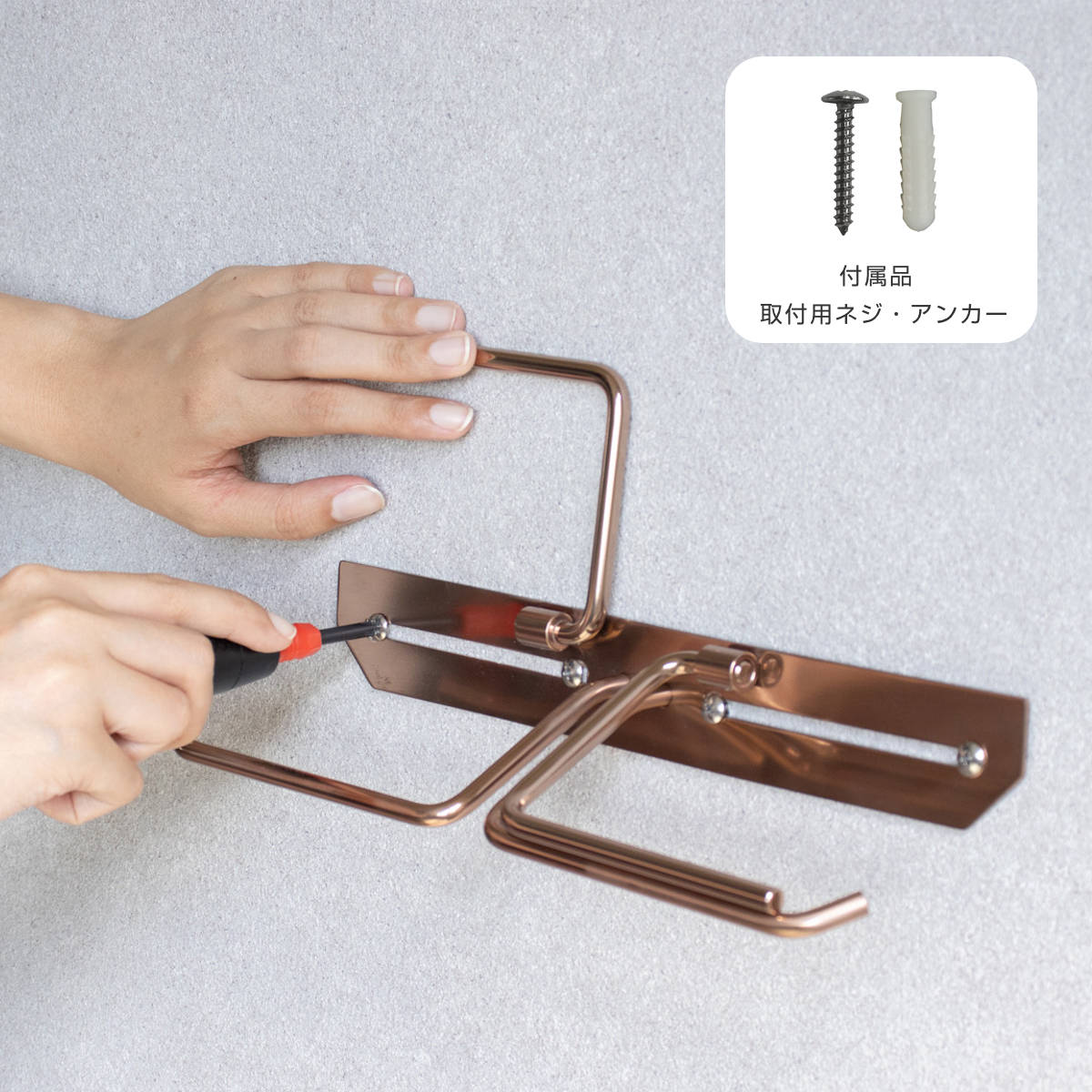 商品の取付は、左右約幅10cmの幅内であれば、お好きな箇所にネジ留が可能です。コンクリート、タイル壁取付用のアンカーも付属しています。