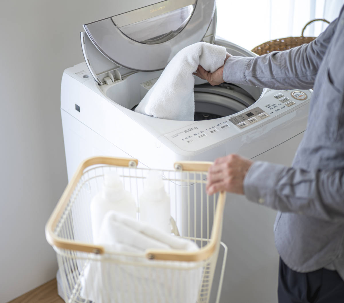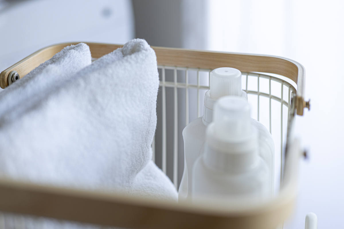 上下の2つのバスケットは取り外しOK。木の持ち手が付いているので、持ち運びが楽ちんです。たっぷり深さがあるので、洗濯物や洗剤などを十分に収納できます。