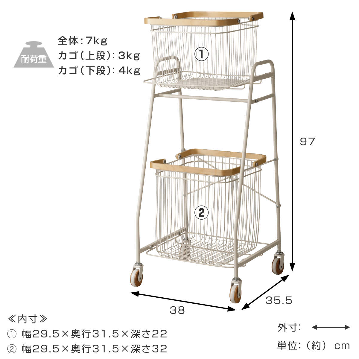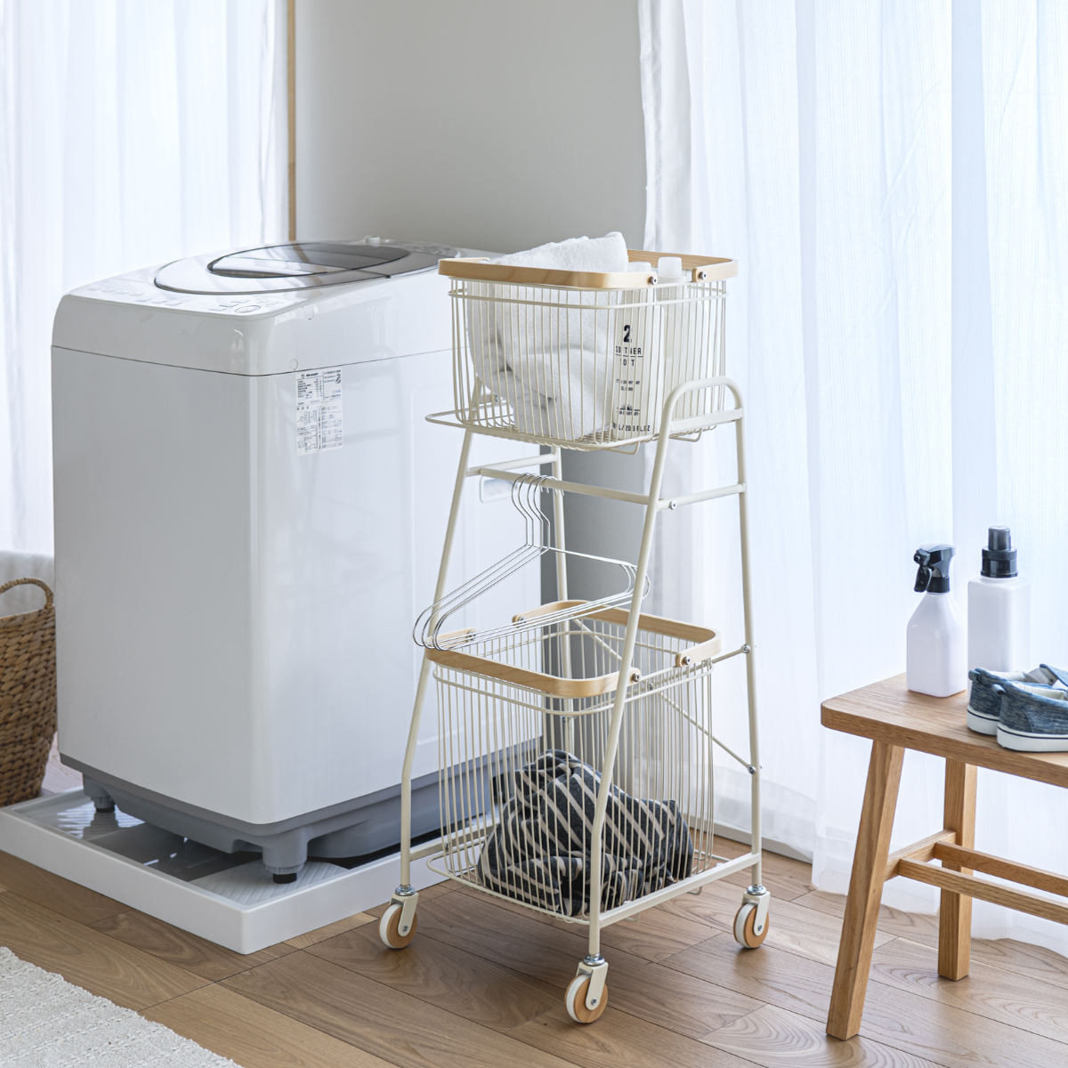 限られたスペースでも扱いやすいランドリーワゴンです。上下で深さの異なるバスケットは、洗い分けや用途別に使うことができて便利です。一般的な洗濯機に高さを合わせた設計で、家事がはかどります。