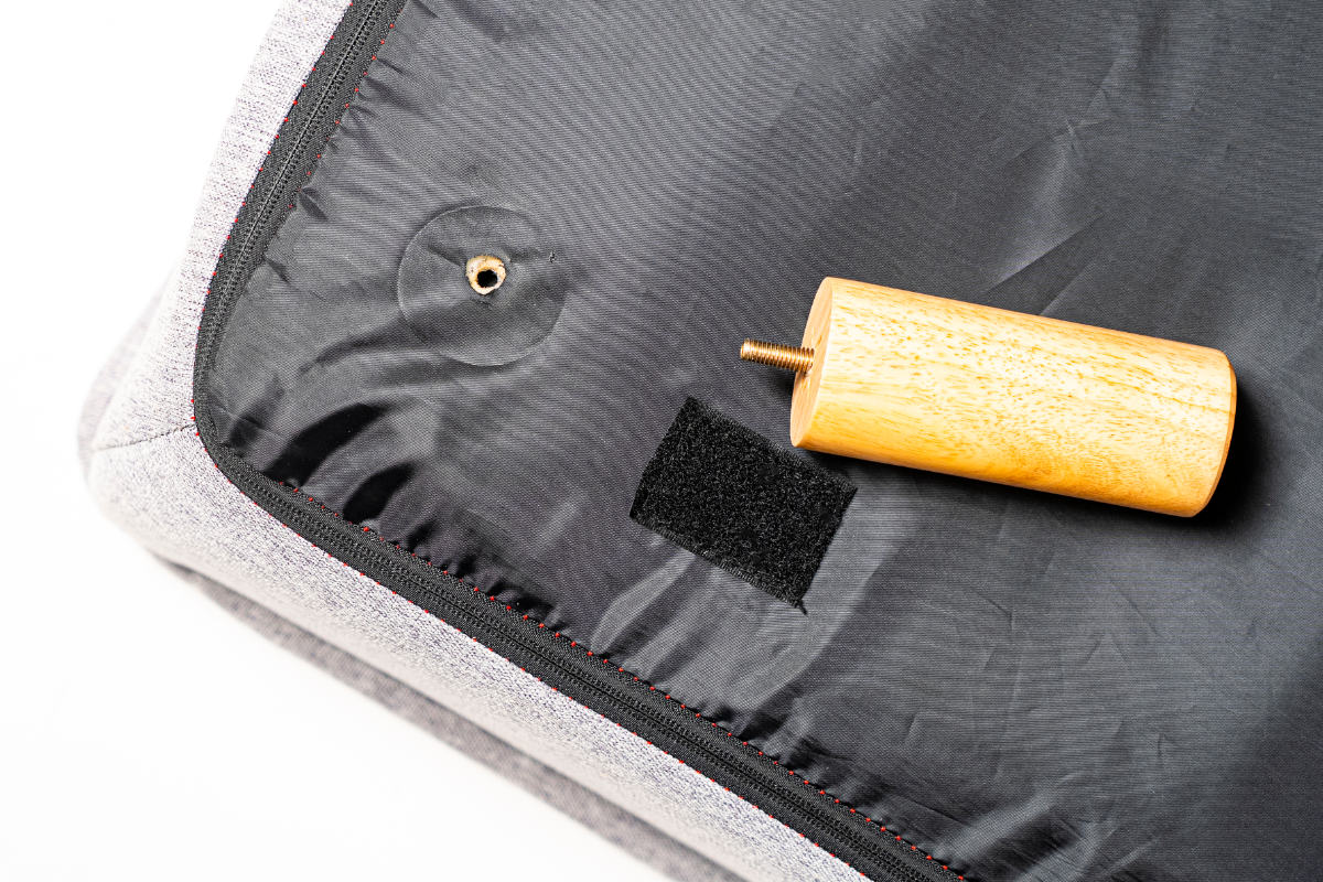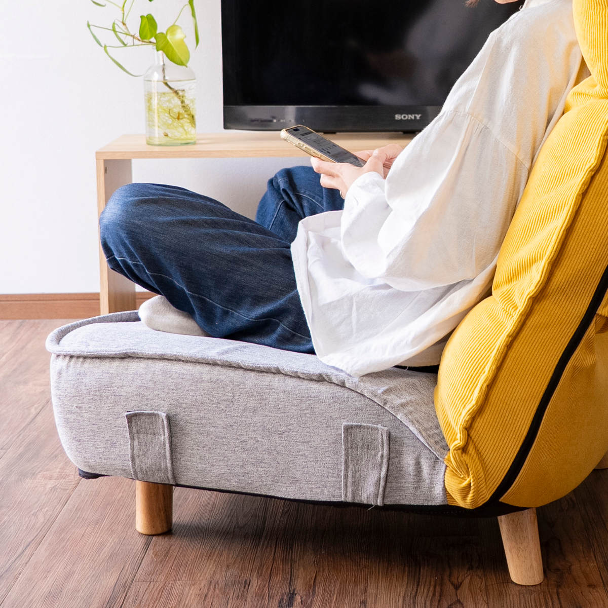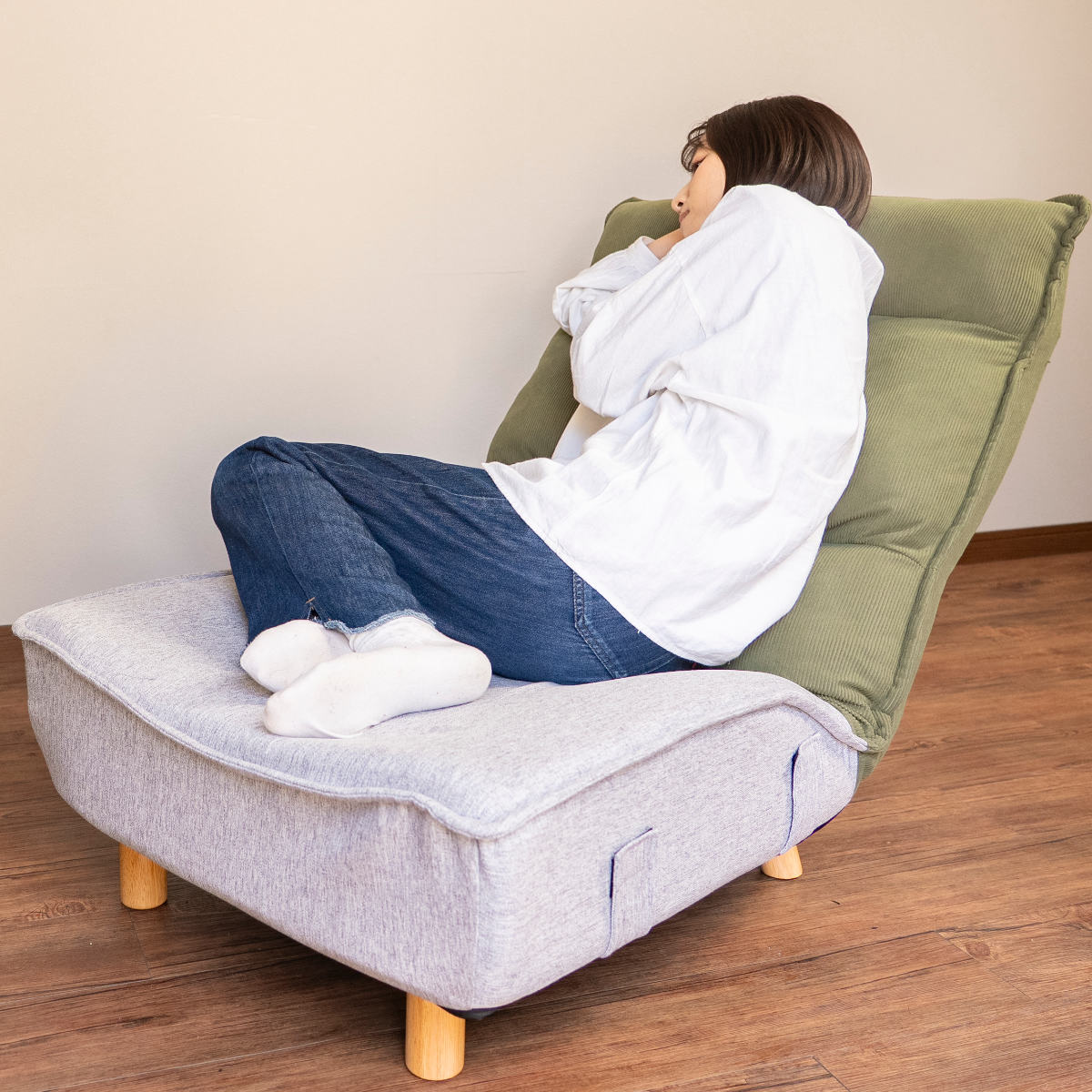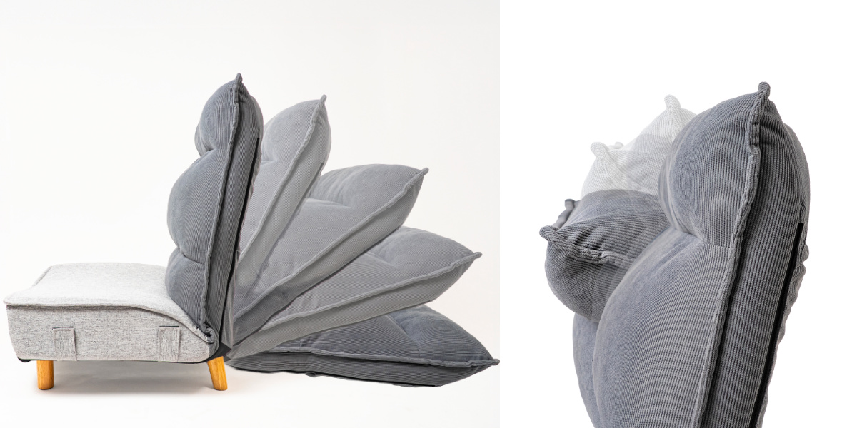 木脚は取り外し可能で、ローソファのようにも使用できます。脚の高さは約12cm、座面厚は約20cm。床に近い暮らしが好きな方にもおすすめです。後ろ脚が支えとなる構造で、フルフラットに倒しても安定して使えます。