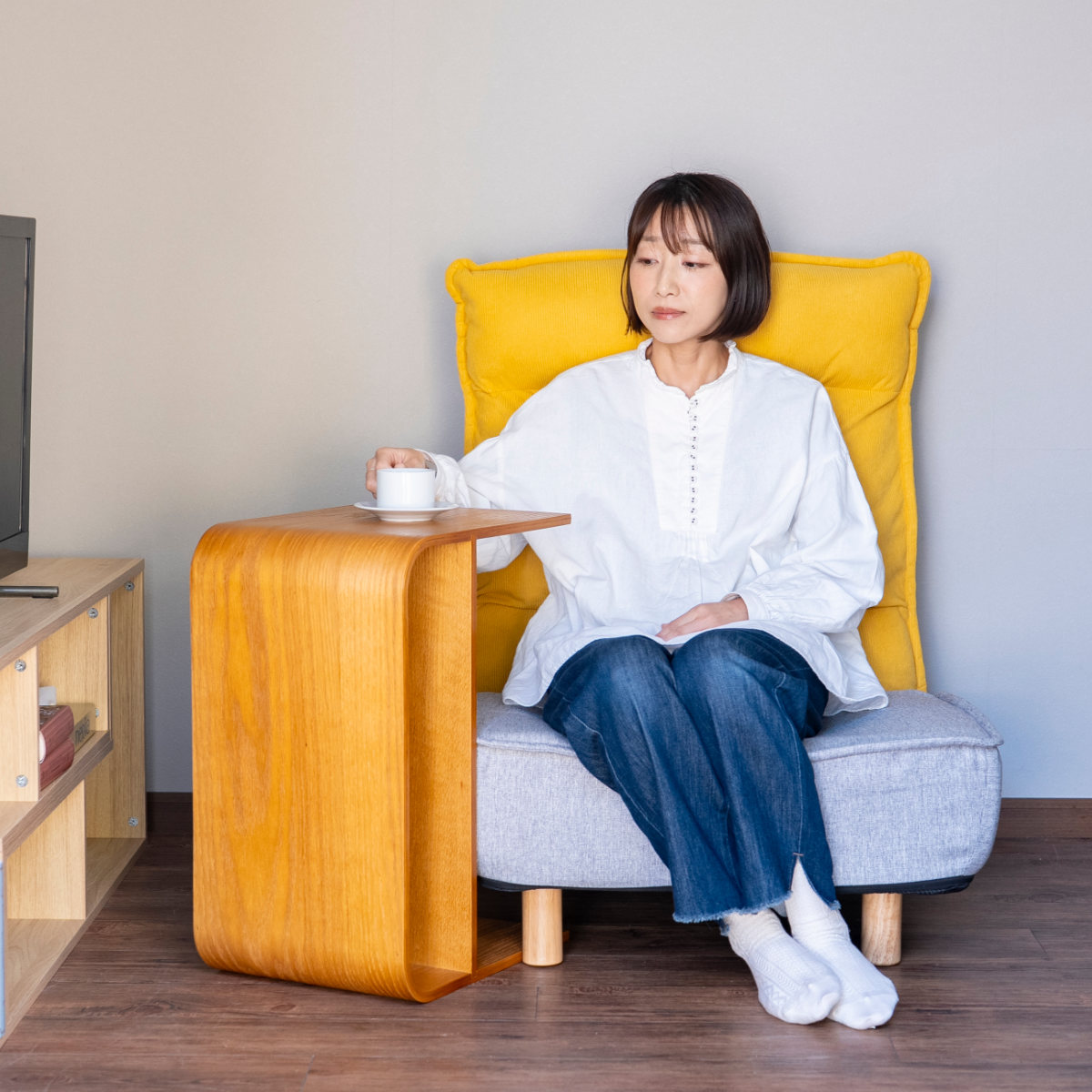 座面幅約68cmのゆったり設計で、あぐらをかいたり横座りをしたりと、自由な姿勢でくつろげます。深く腰掛けられるので1人用ながら窮屈さを感じにくく、ソファ感覚で使えるのも魅力です。