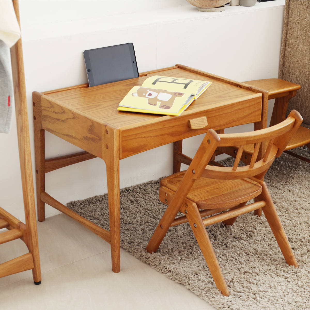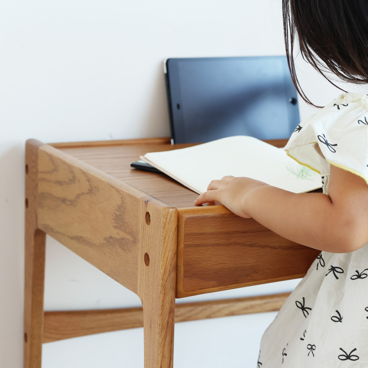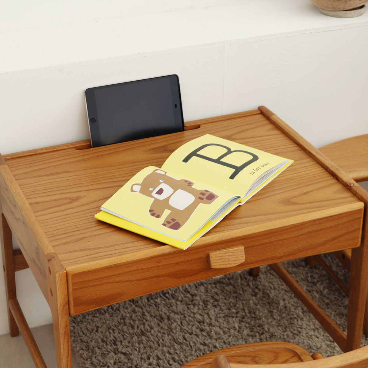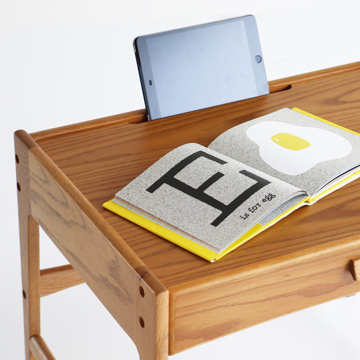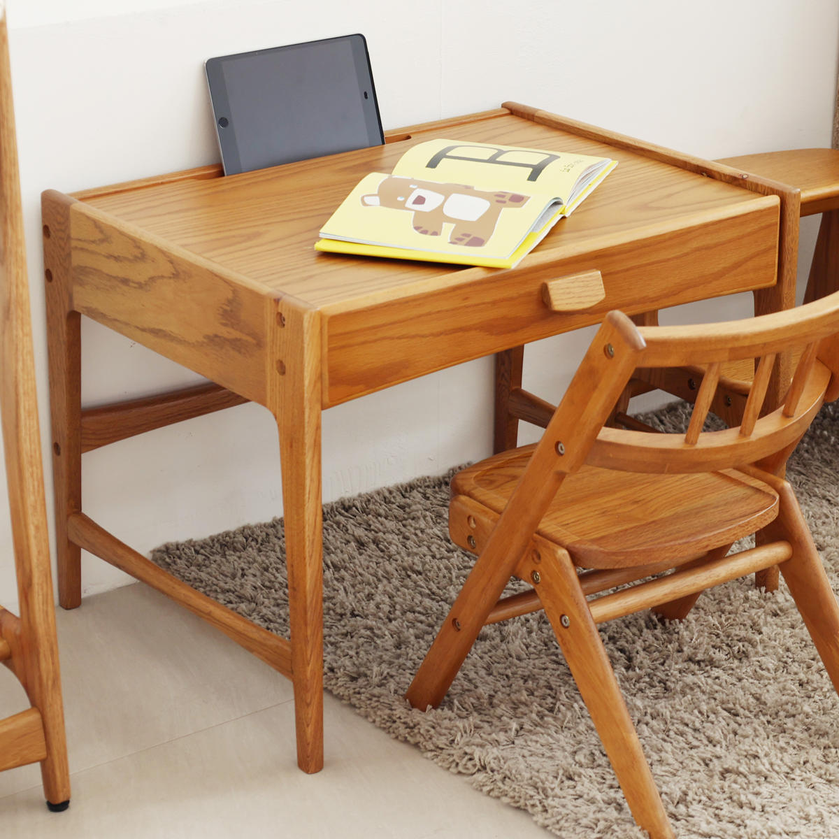 天板前側にはタブレット端末を立てかけられる溝を配置。動画学習やデジタル教材にも対応し、現代の学習スタイルにフィットした設計です。