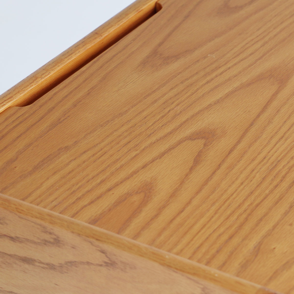 天板にはオーク突板、フレームにはオーク無垢材を使用した学習机です。素材そのものの表情を活かした仕上がりで、手に触れたときのあたたかみとナチュラルな質感が魅力です。天然木ならではの美しい木目が、お部屋にやさしく溶け込みます。