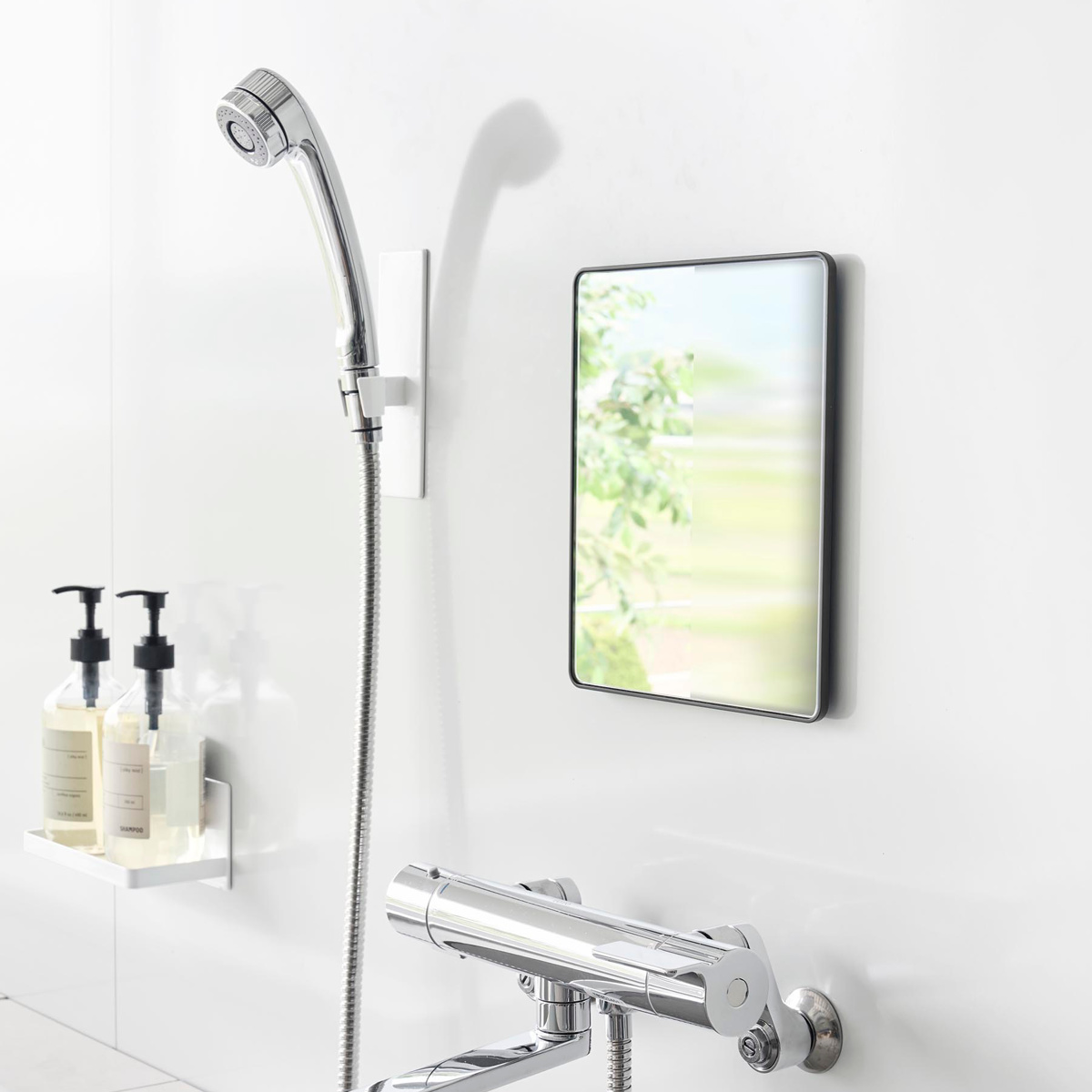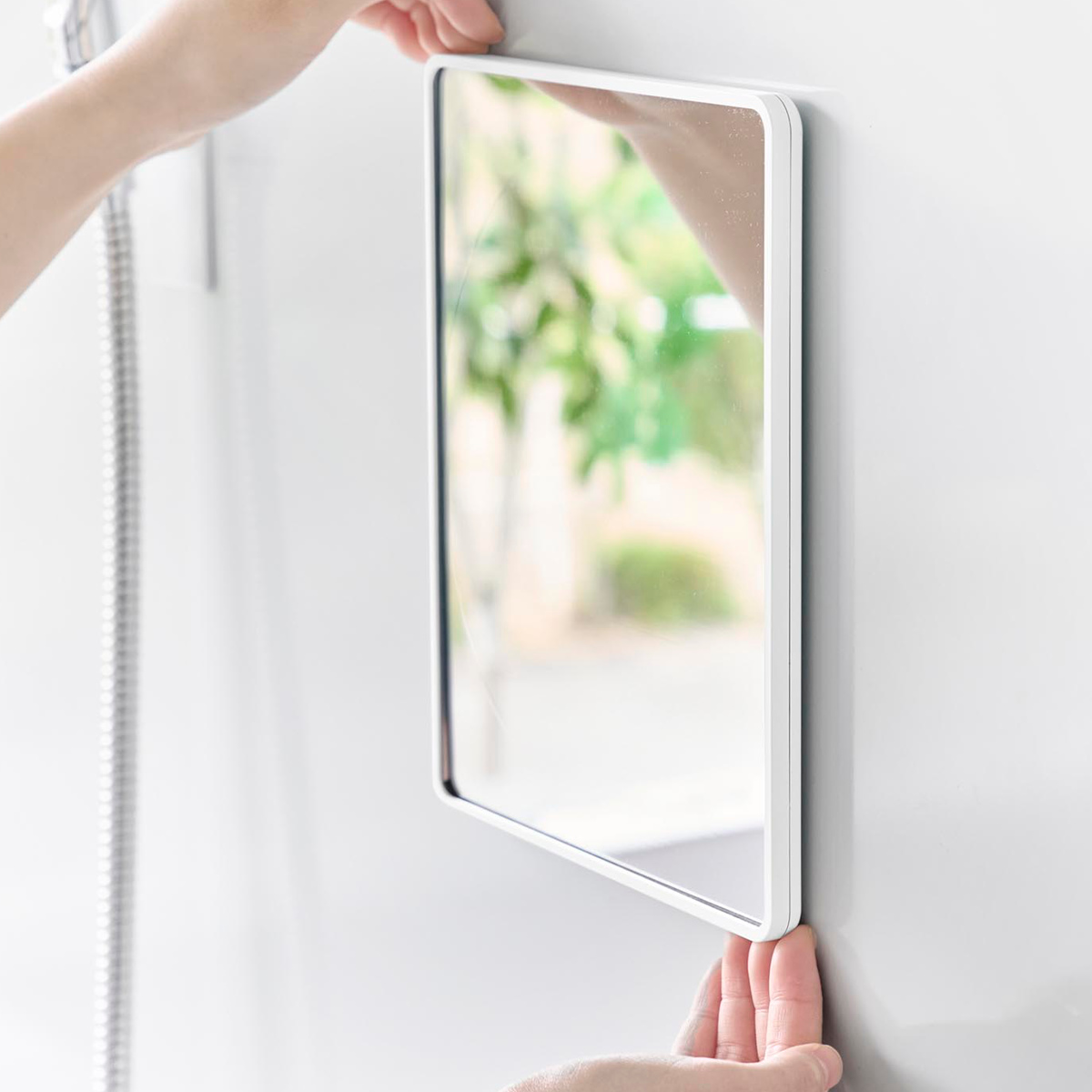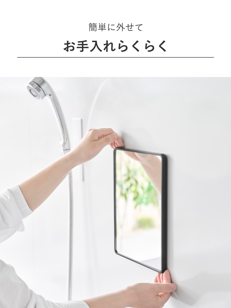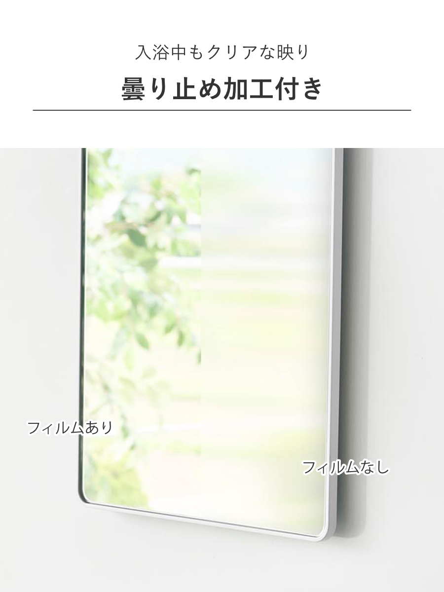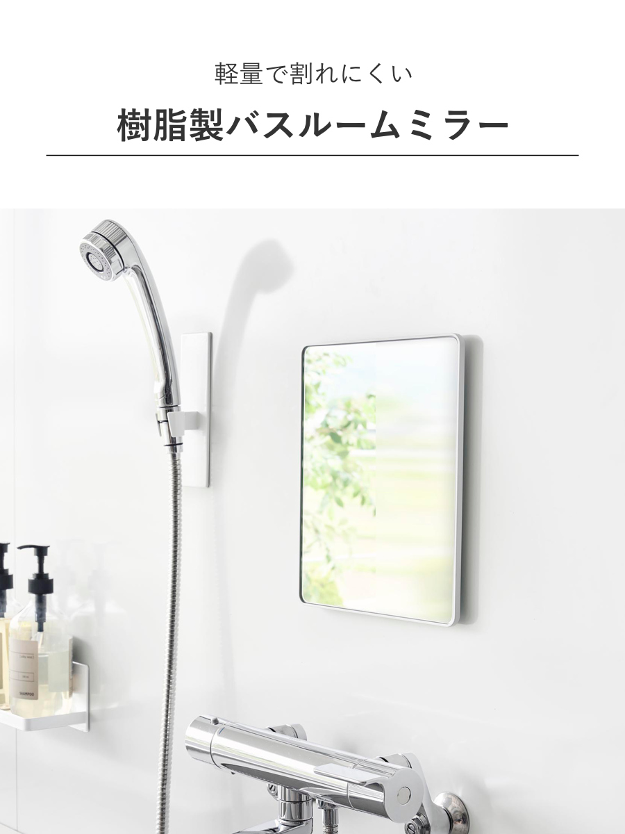 厚さ6mmの樹脂製で、ゆがみにくく衝撃にも強いバスルームミラーです。