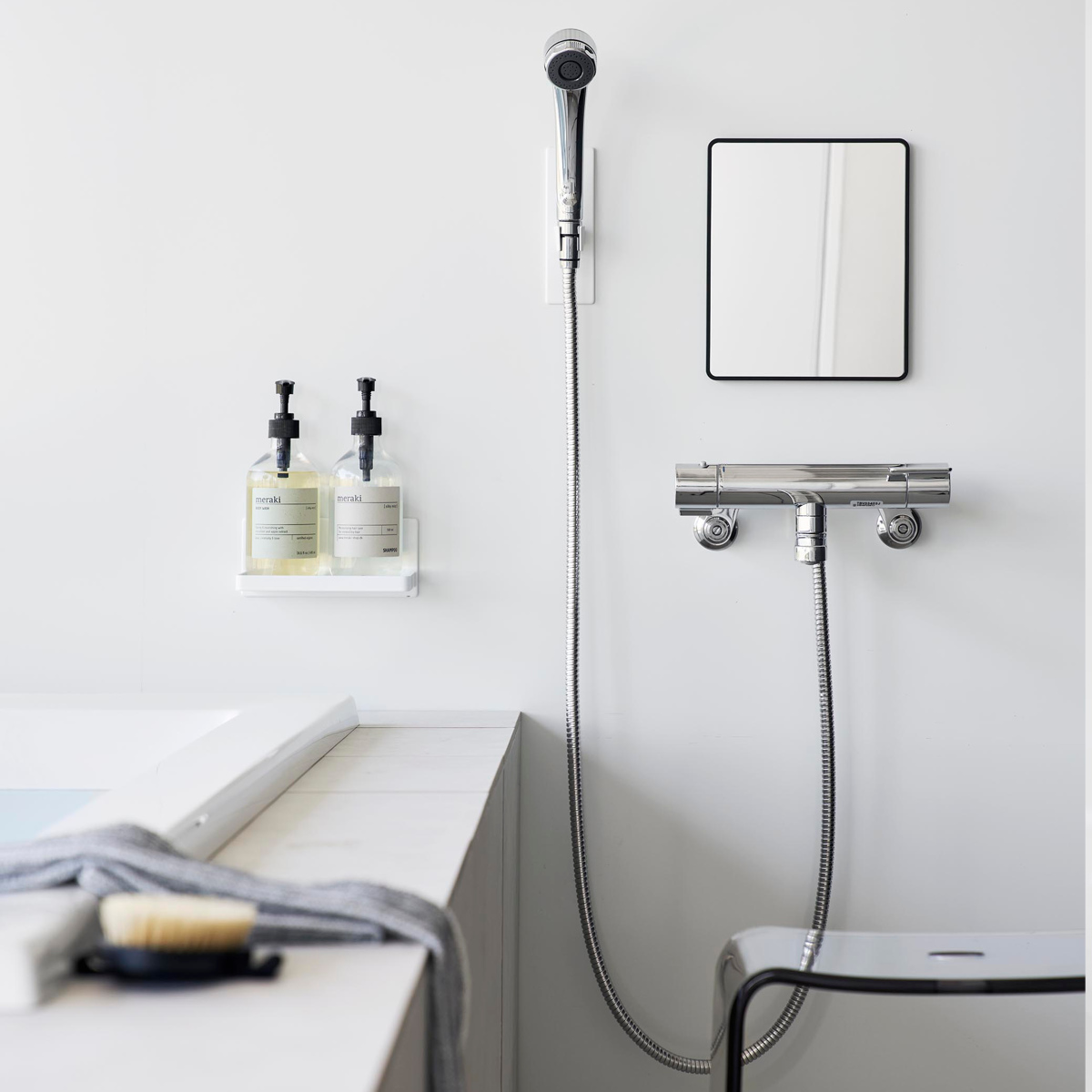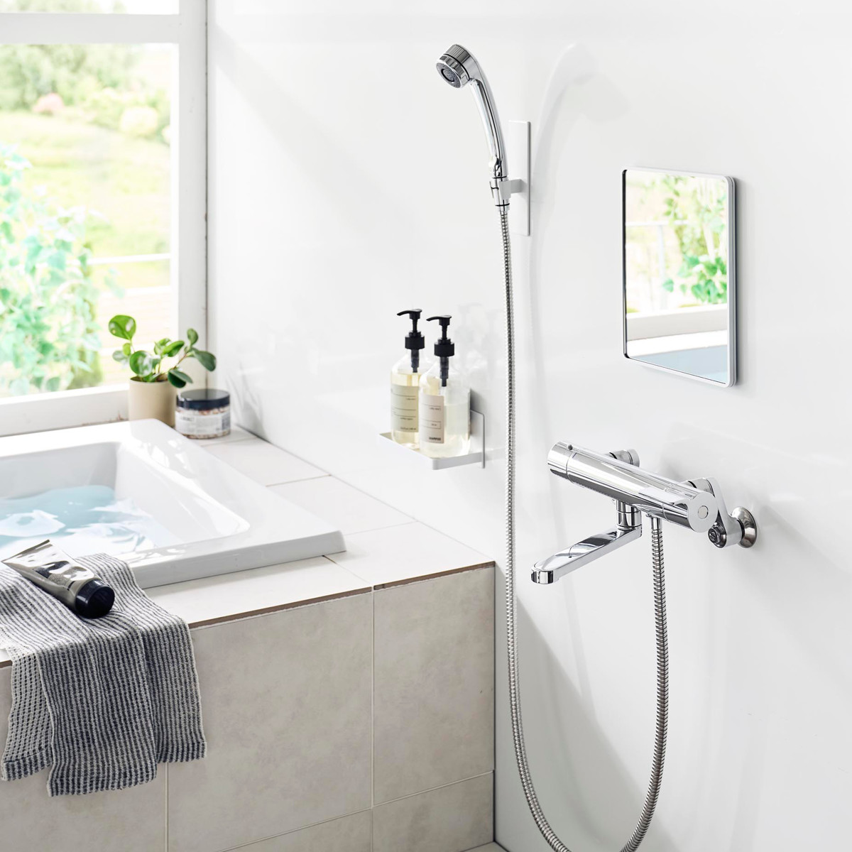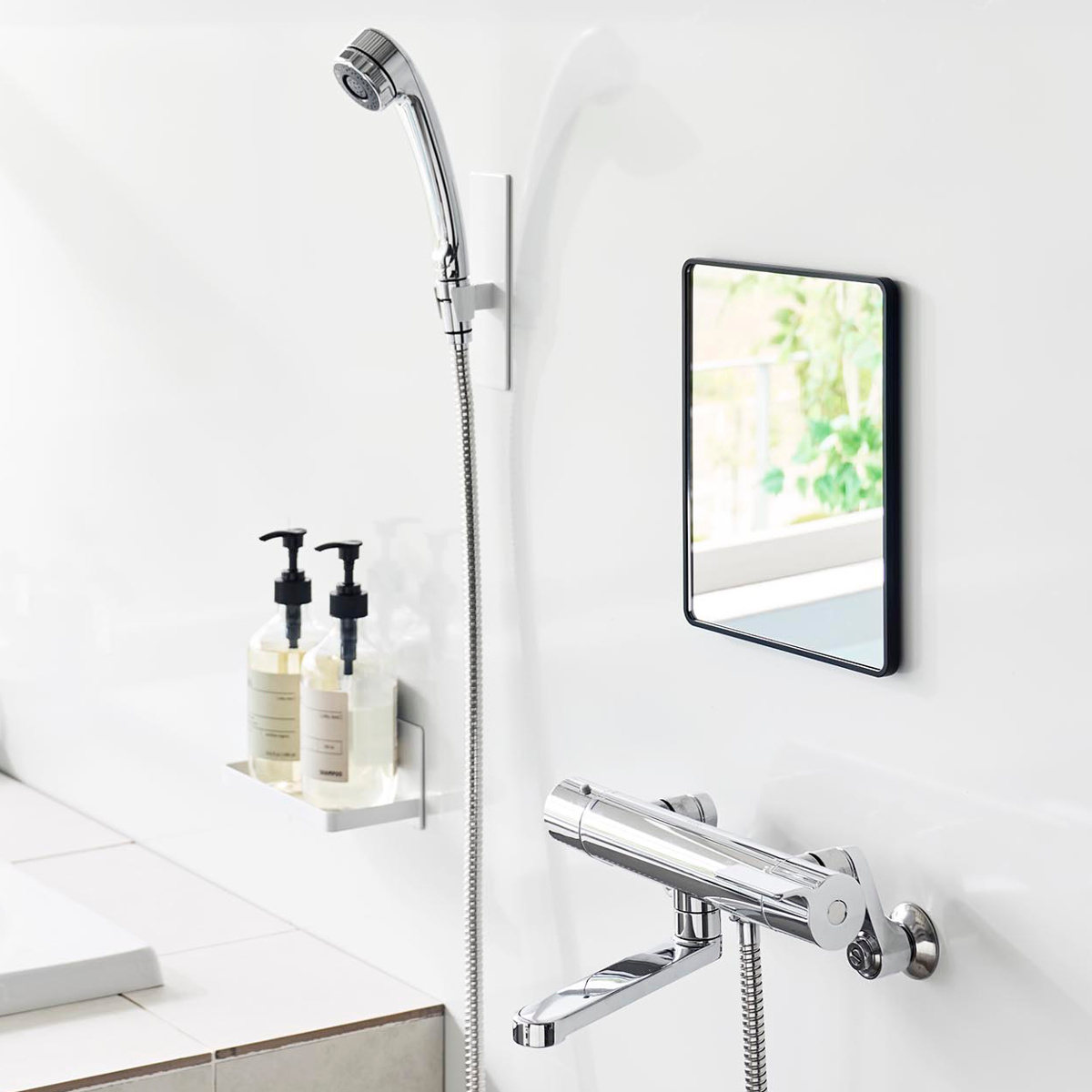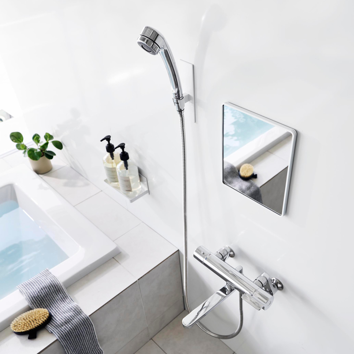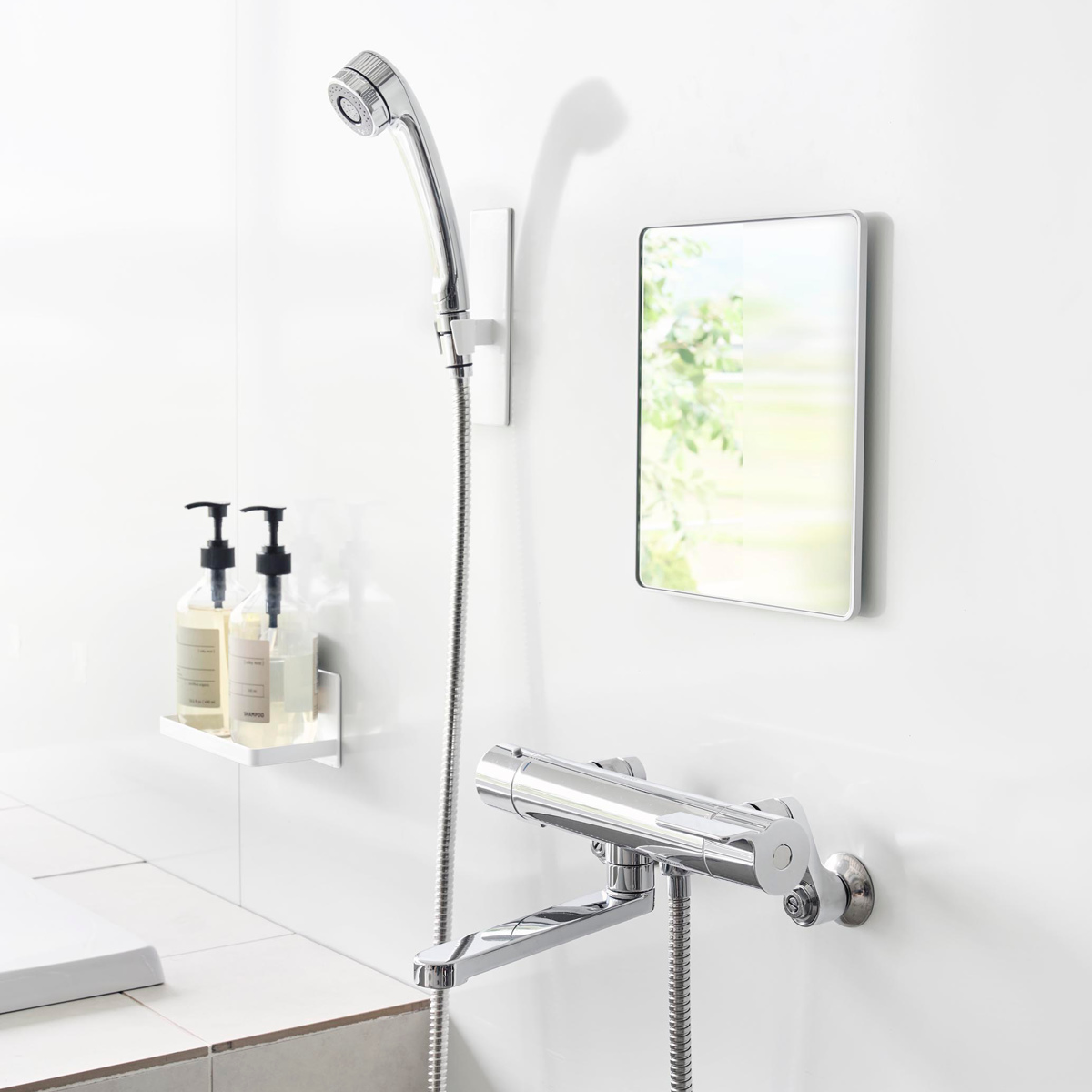厚さ6mmの樹脂製で、ゆがみにくく衝撃にも強いバスルームミラーです。