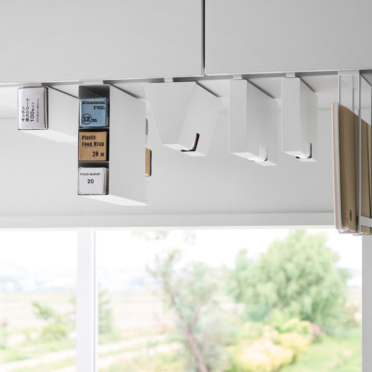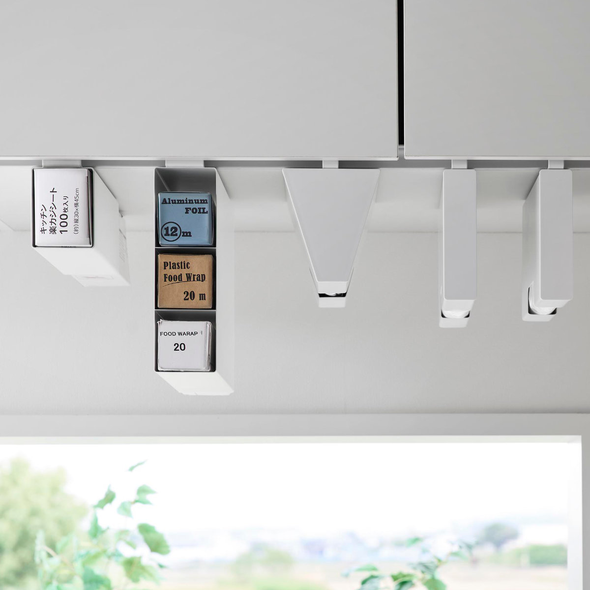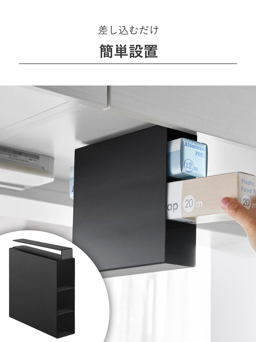 戸棚下に差し込むだけで設置できる3段ラップホルダーです。置き場所に困るラップやアルミホイルなどを浮かせて収納でき、戸棚下のスペースを有効に活用できます。