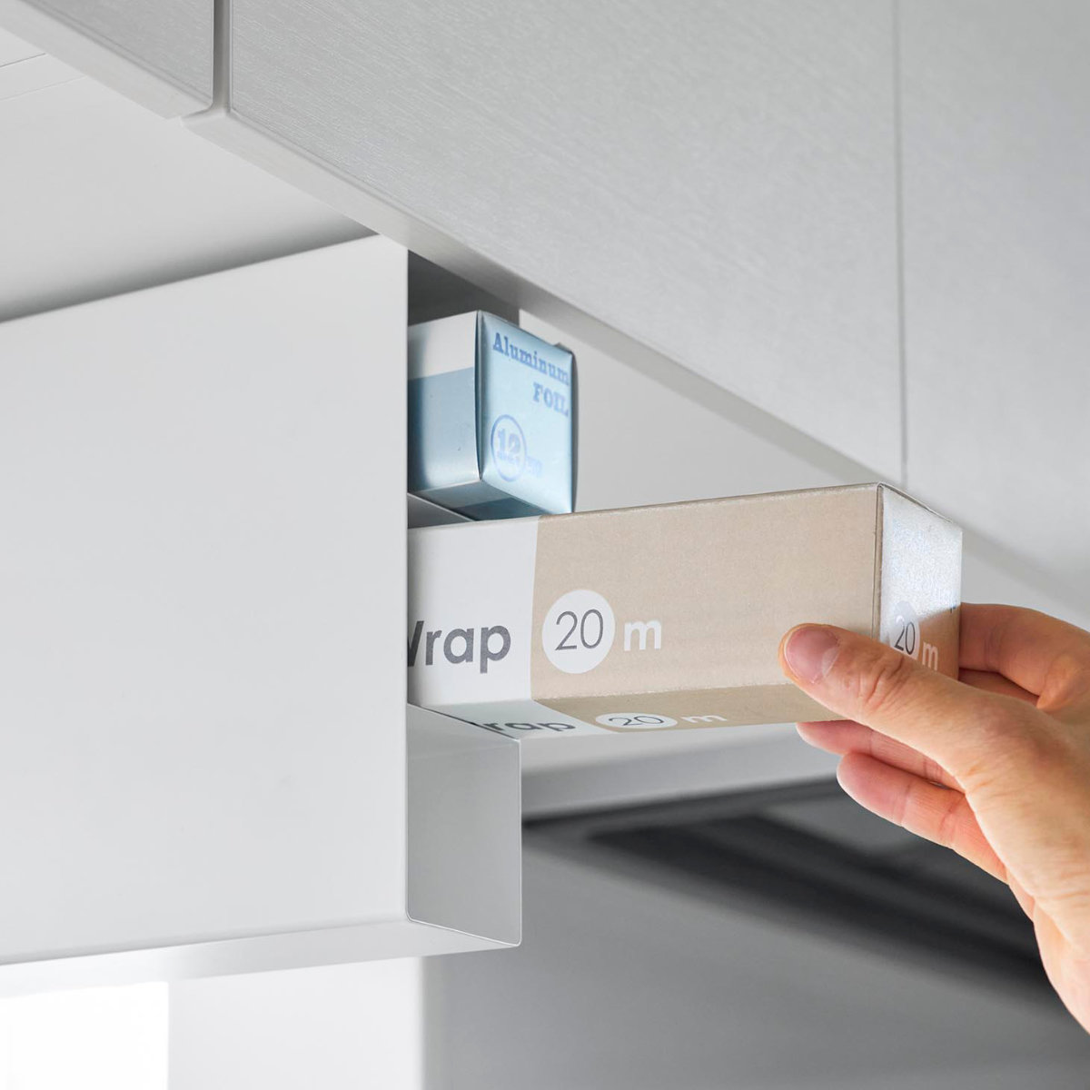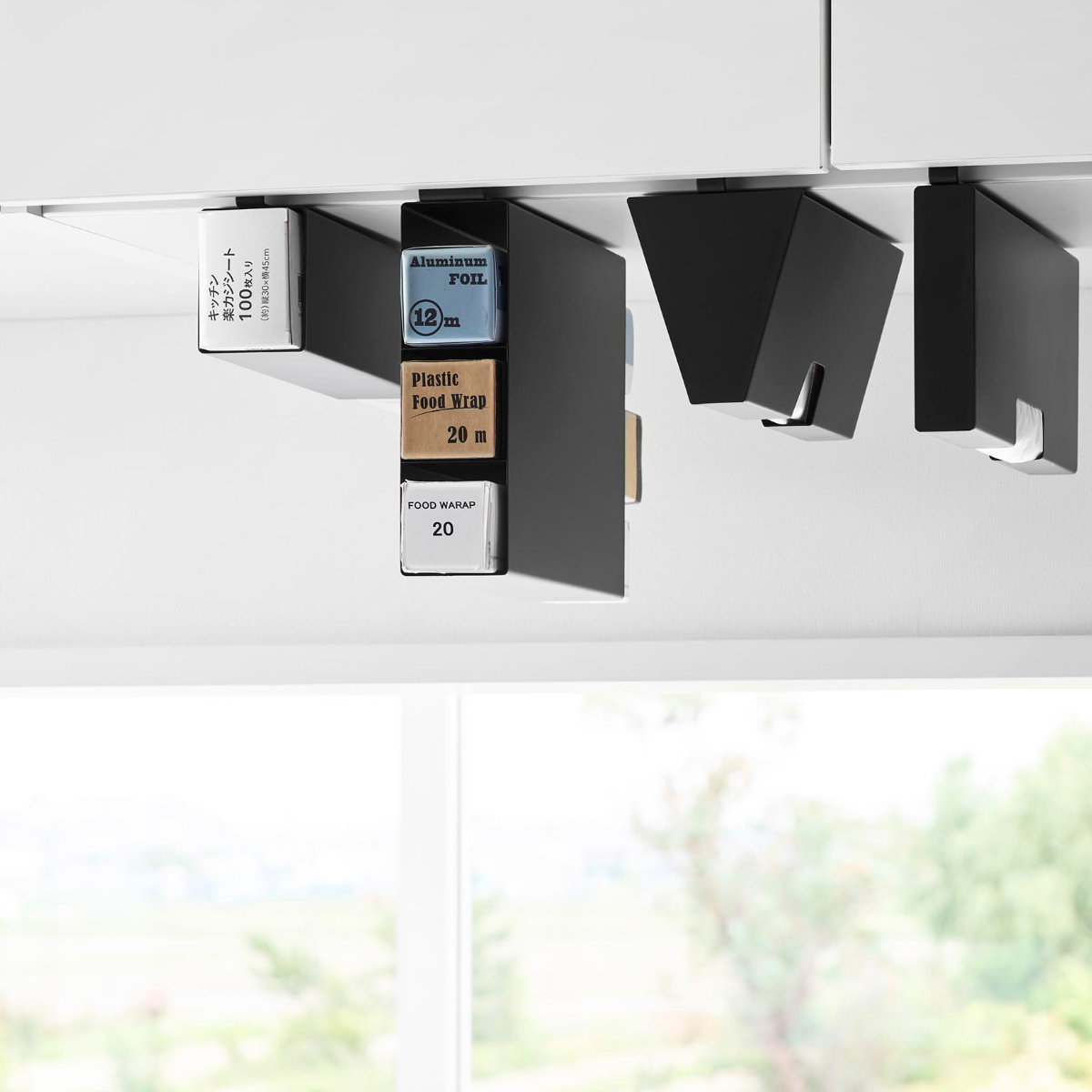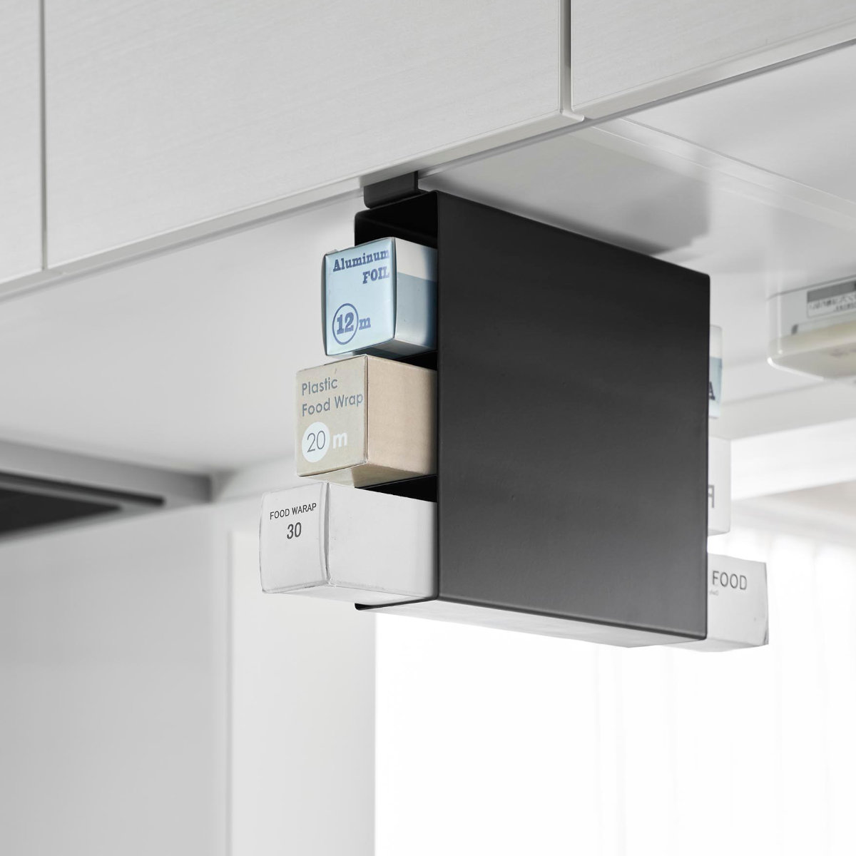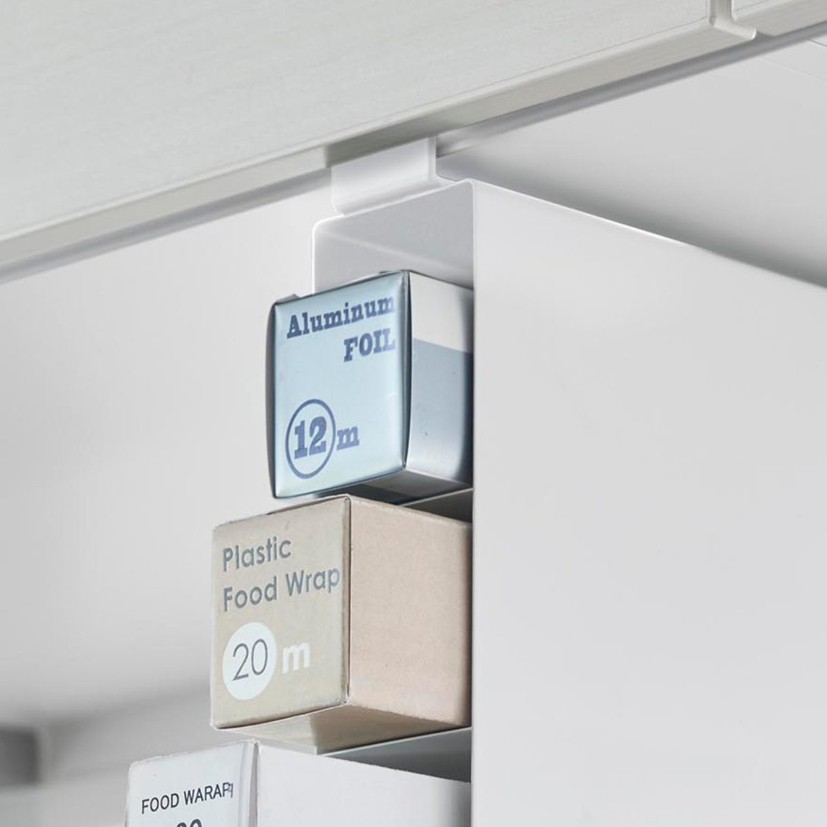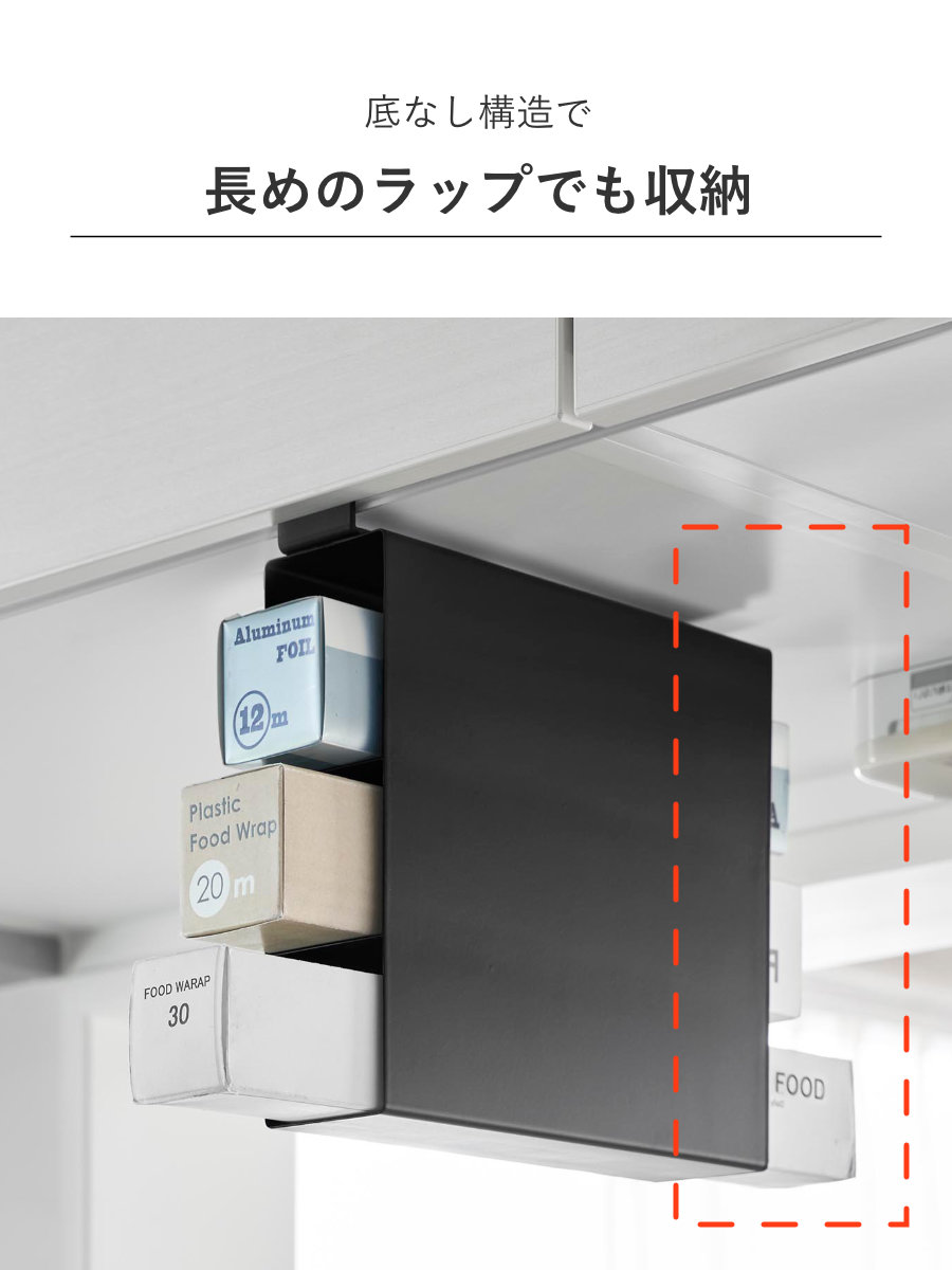 底がない設計で、長めのラップもすっきりセット可能です。ラップやアルミホイルの長さがバラバラでもまとめて収納でき、見た目も整います。