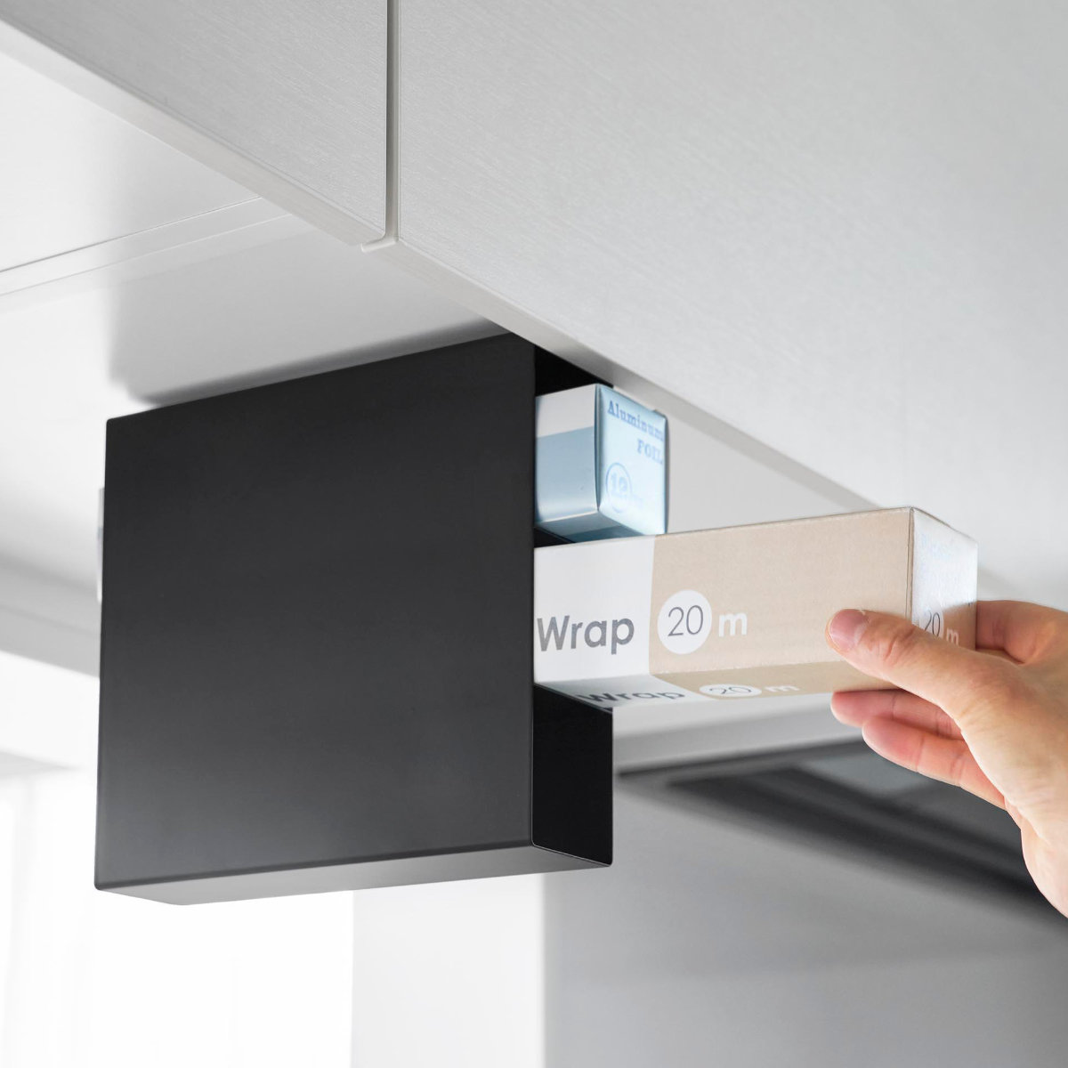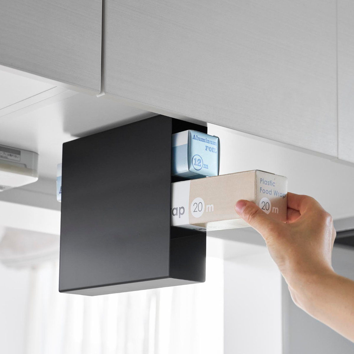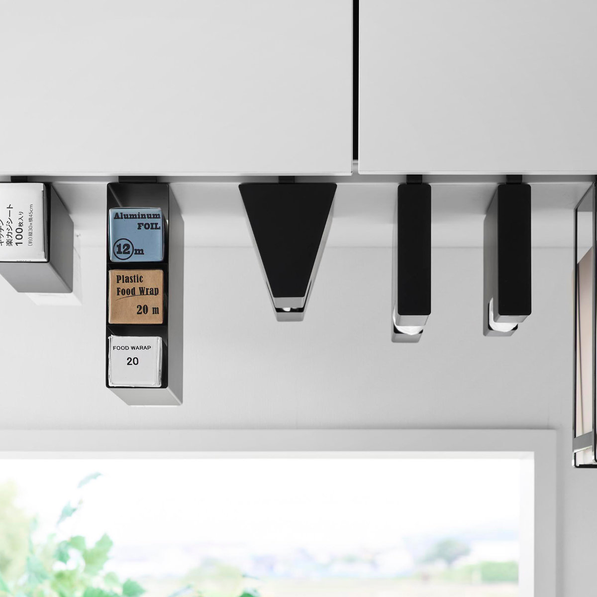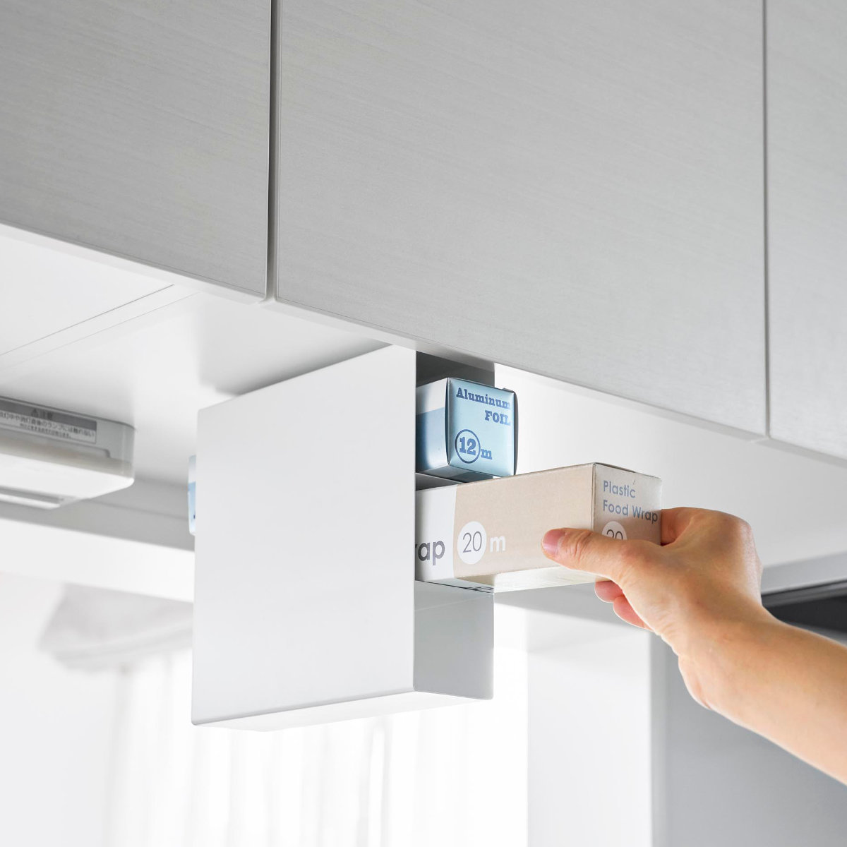 底がない設計で、長めのラップもすっきりセット可能です。ラップやアルミホイルの長さがバラバラでもまとめて収納でき、見た目も整います。